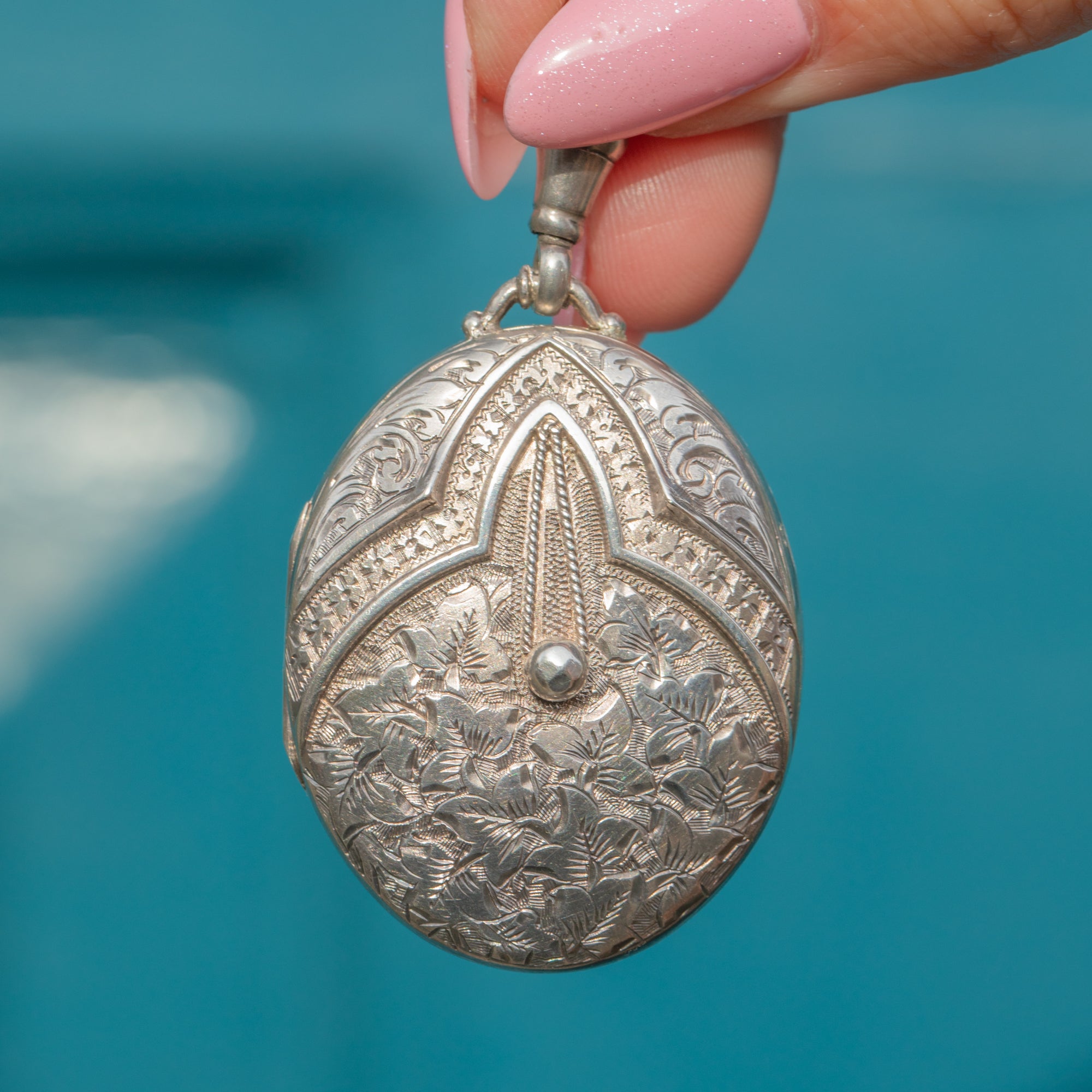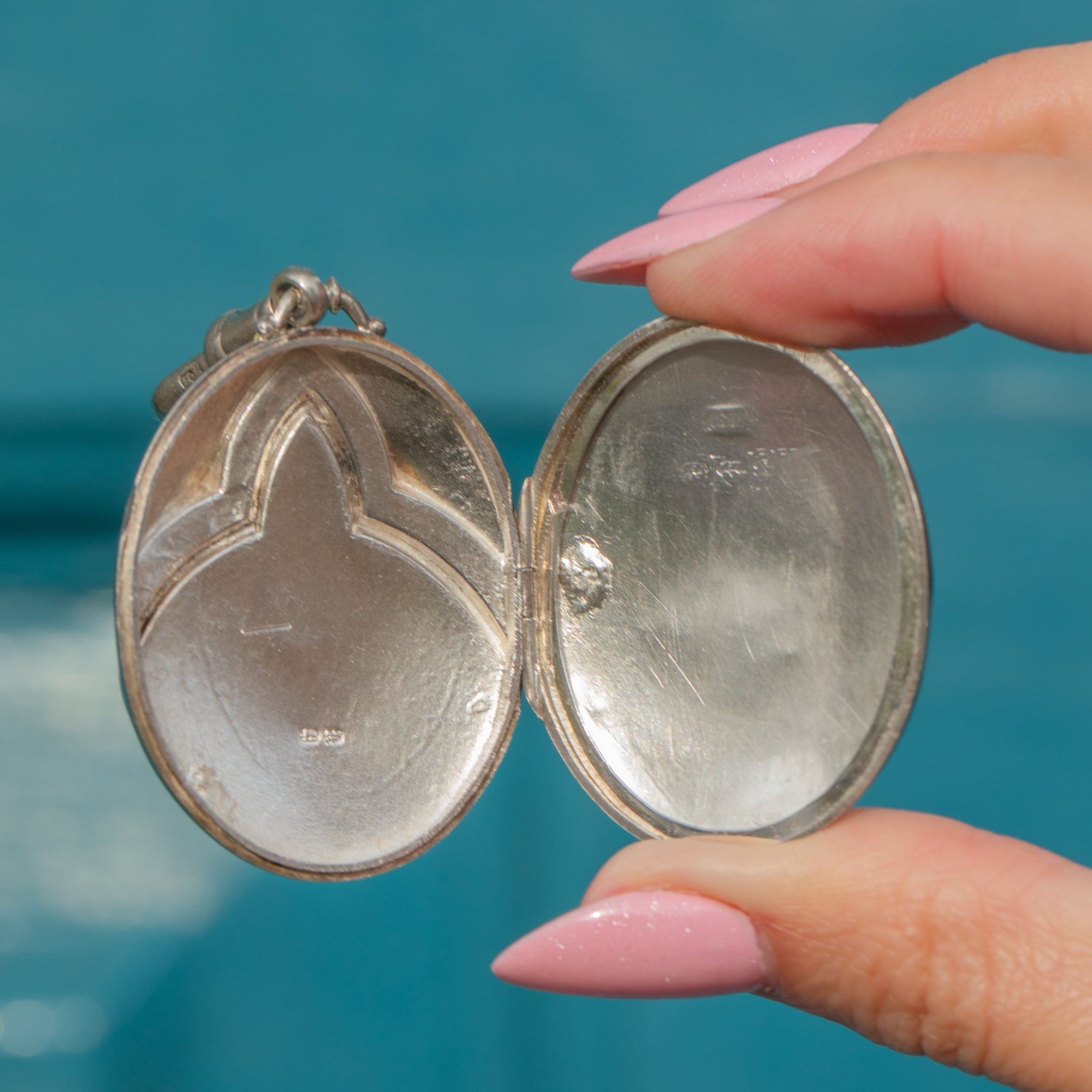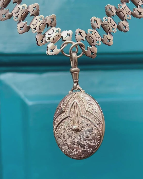 Antique Silver Pierced Book Chain with Engraved Locket & Dog-Clip