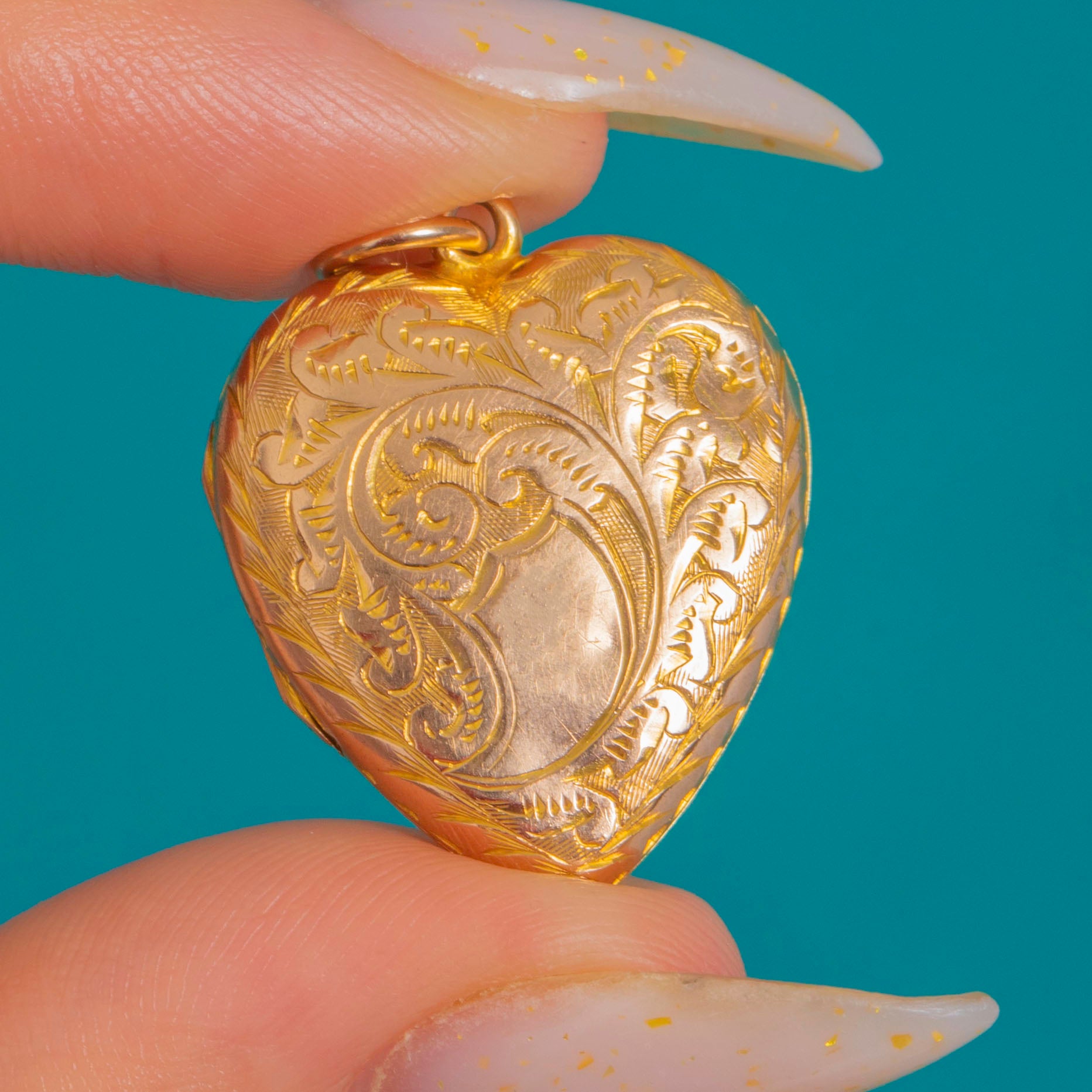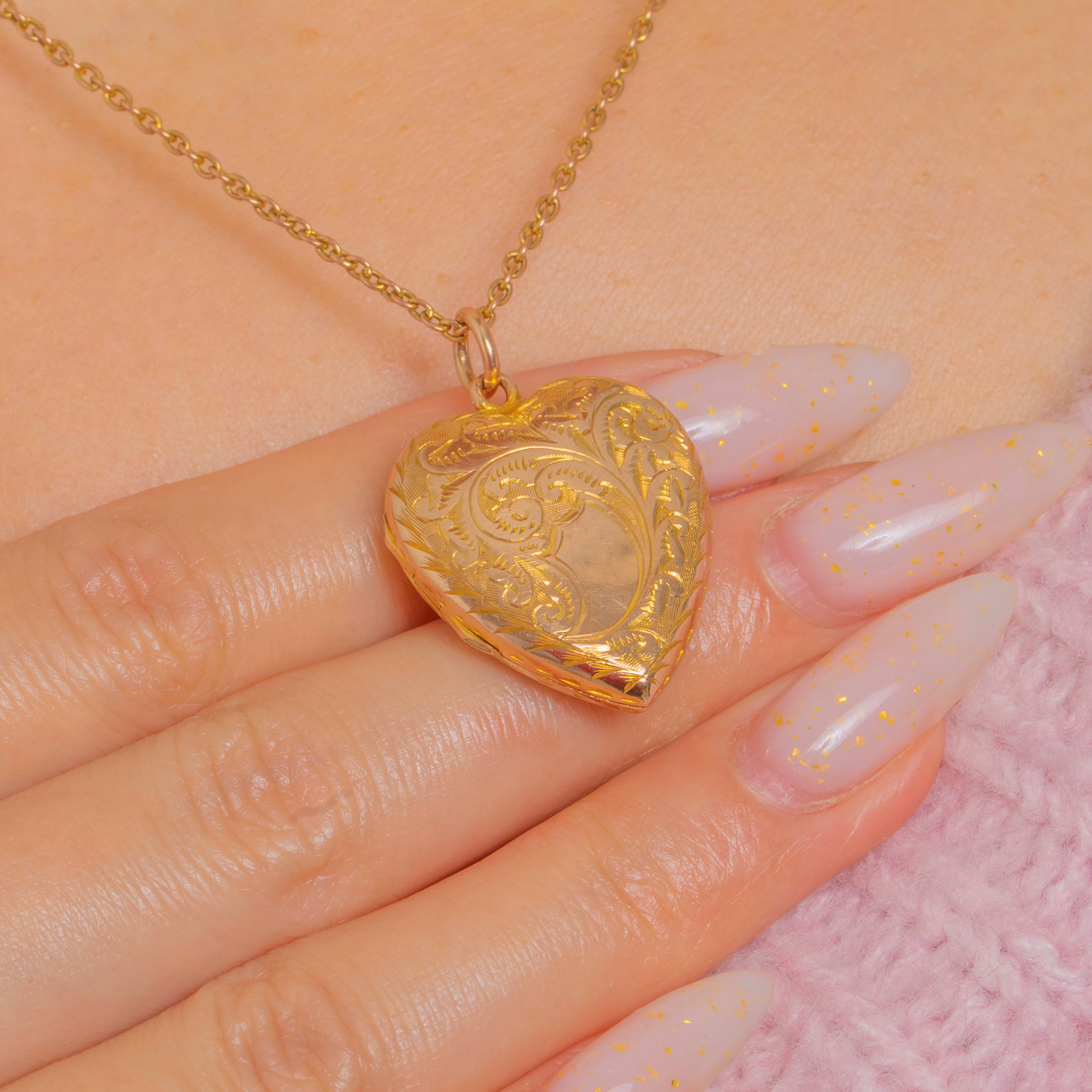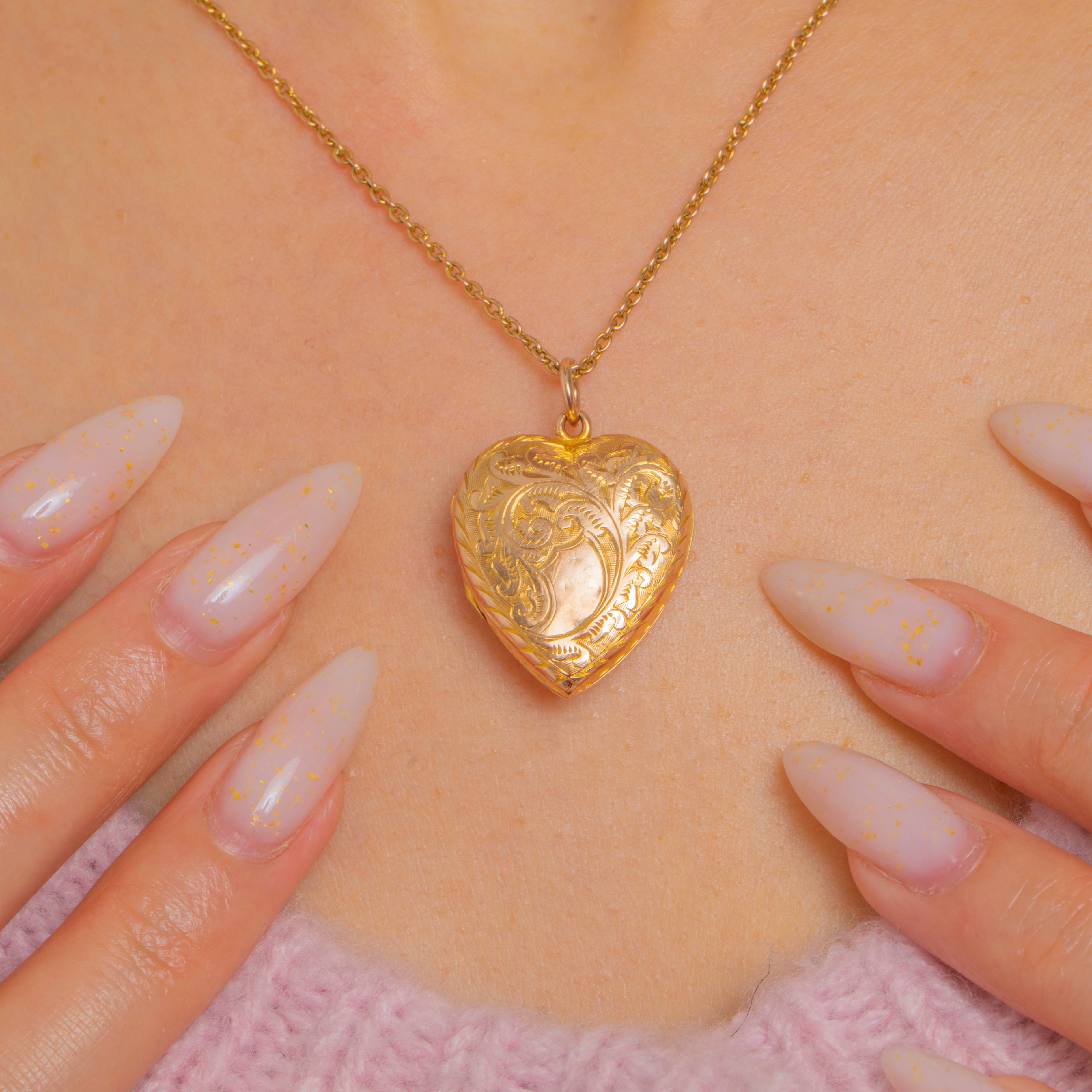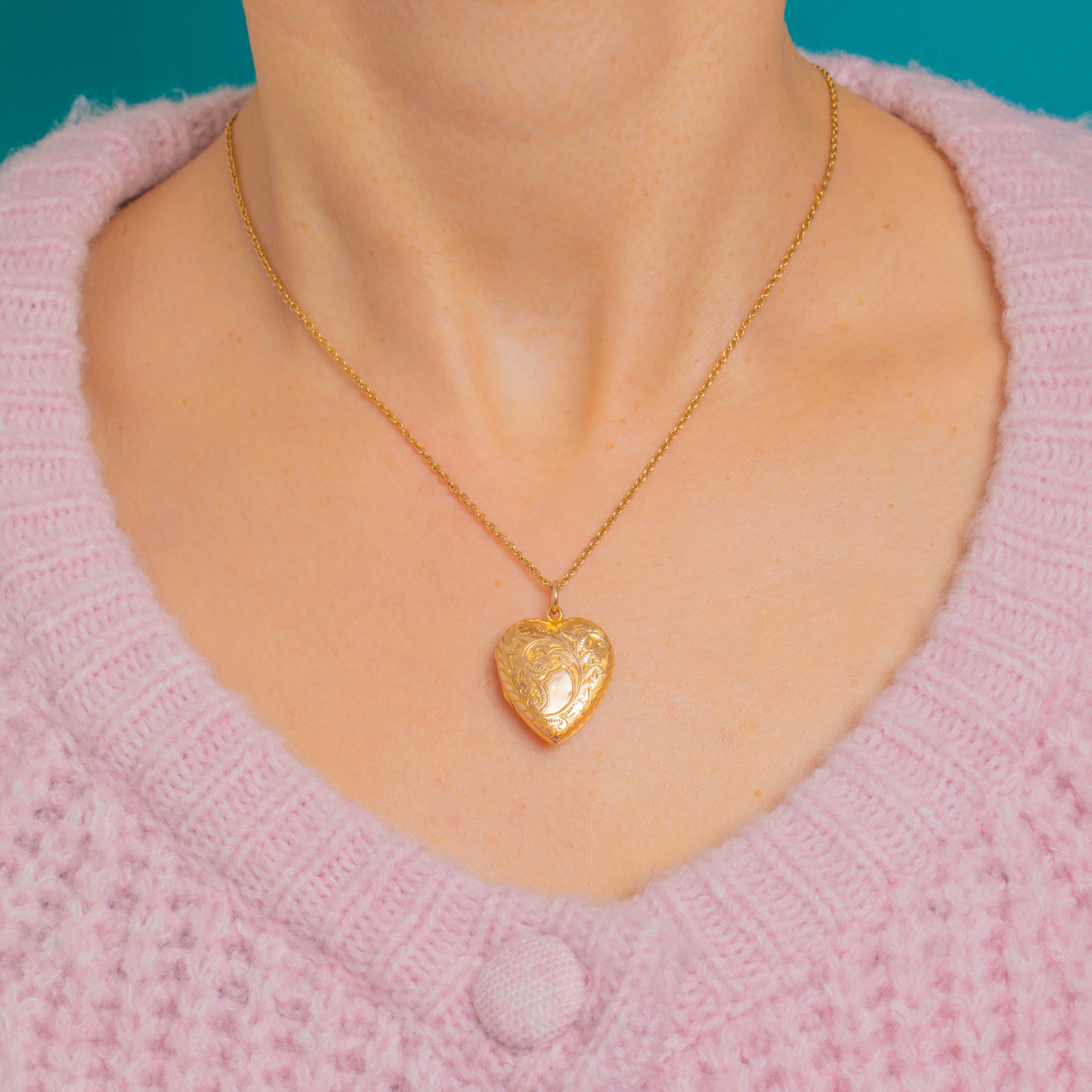 A romantic Edwardian treasure, this puffy heart locket is crafted in glowing 9ct Gold and richly chased with scrolling foliage over an engine‑turned ground. A rope‑style border frames the heart, while a smooth central cartouche invites a personal monogram or date.