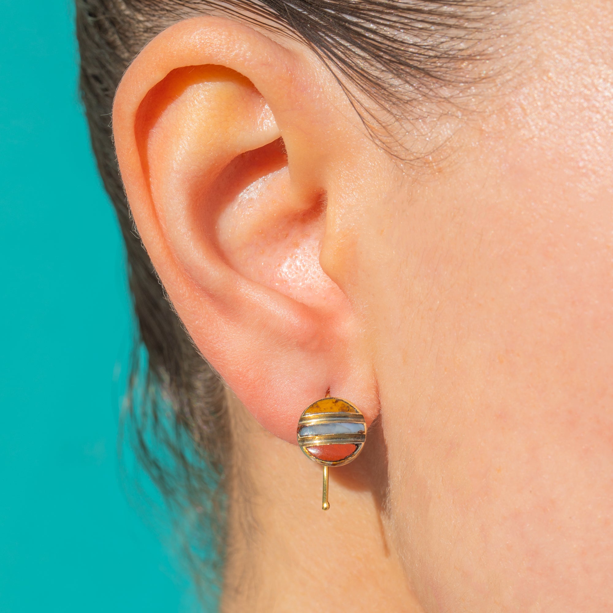 These Antique Victorian earrings are a charming study in colour and balance. Crafted in rich 18ct Gold, they showcase three coloured Agate arranged in crisp horizontal bands within compact circular drops. Each panel—two slim crescents flanking a central rectangle—sits flush within fine Gold channels, creating a refined stripe that glows with warm honey, pale cream-blue and russet tones.