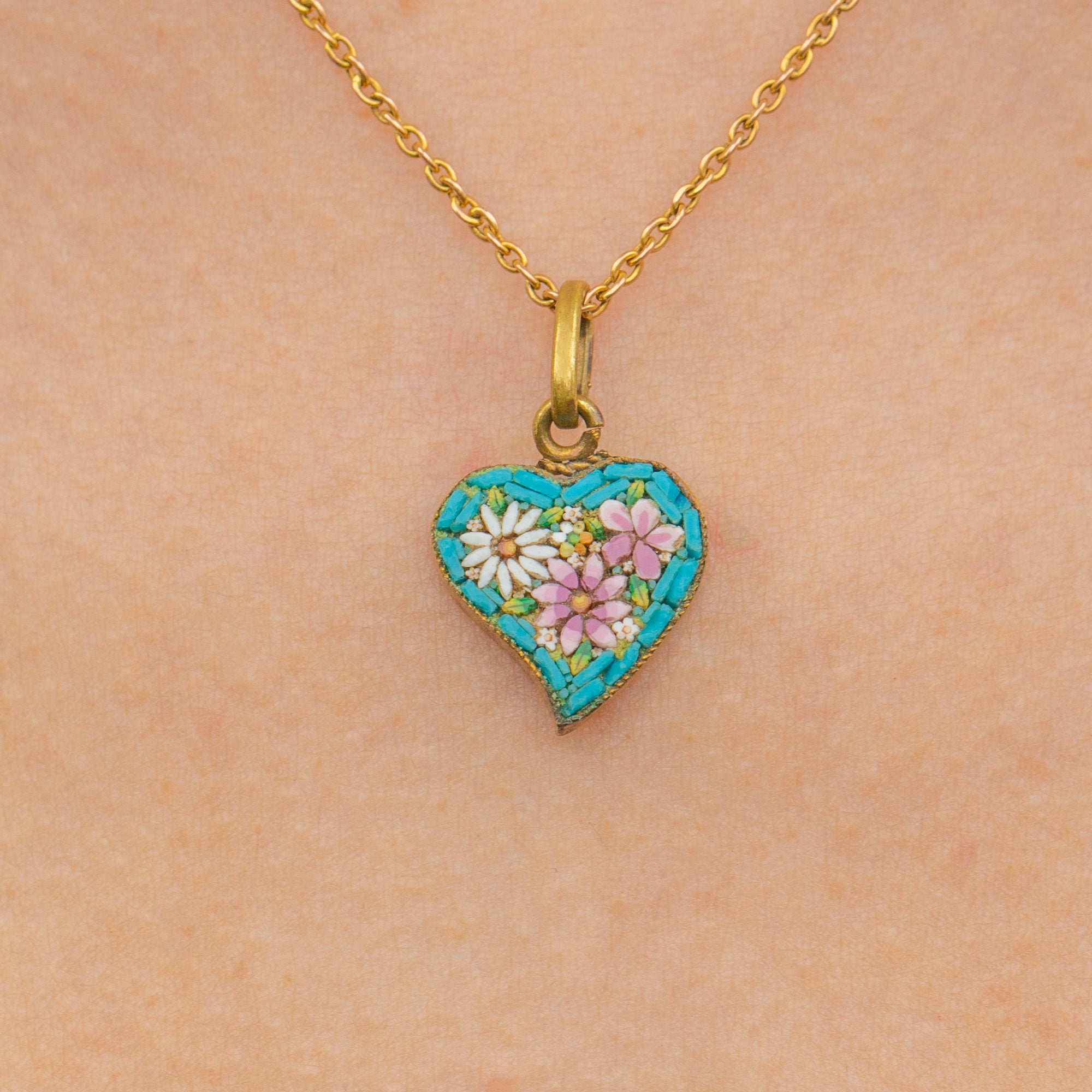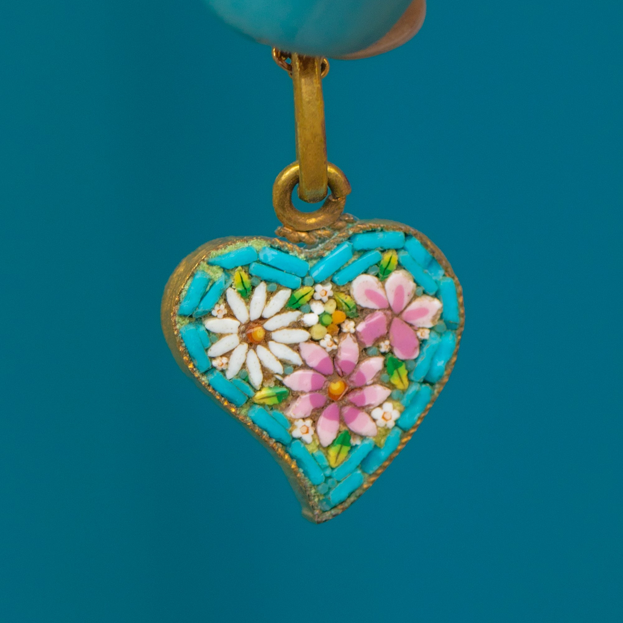 This Victorian witches Heart Micro-Mosaic pendant is a whimsical delight! Miniture mosaic pieces create a beautiful piece of art, featuring three pretty flowers at her centre, bursting with bright hues.