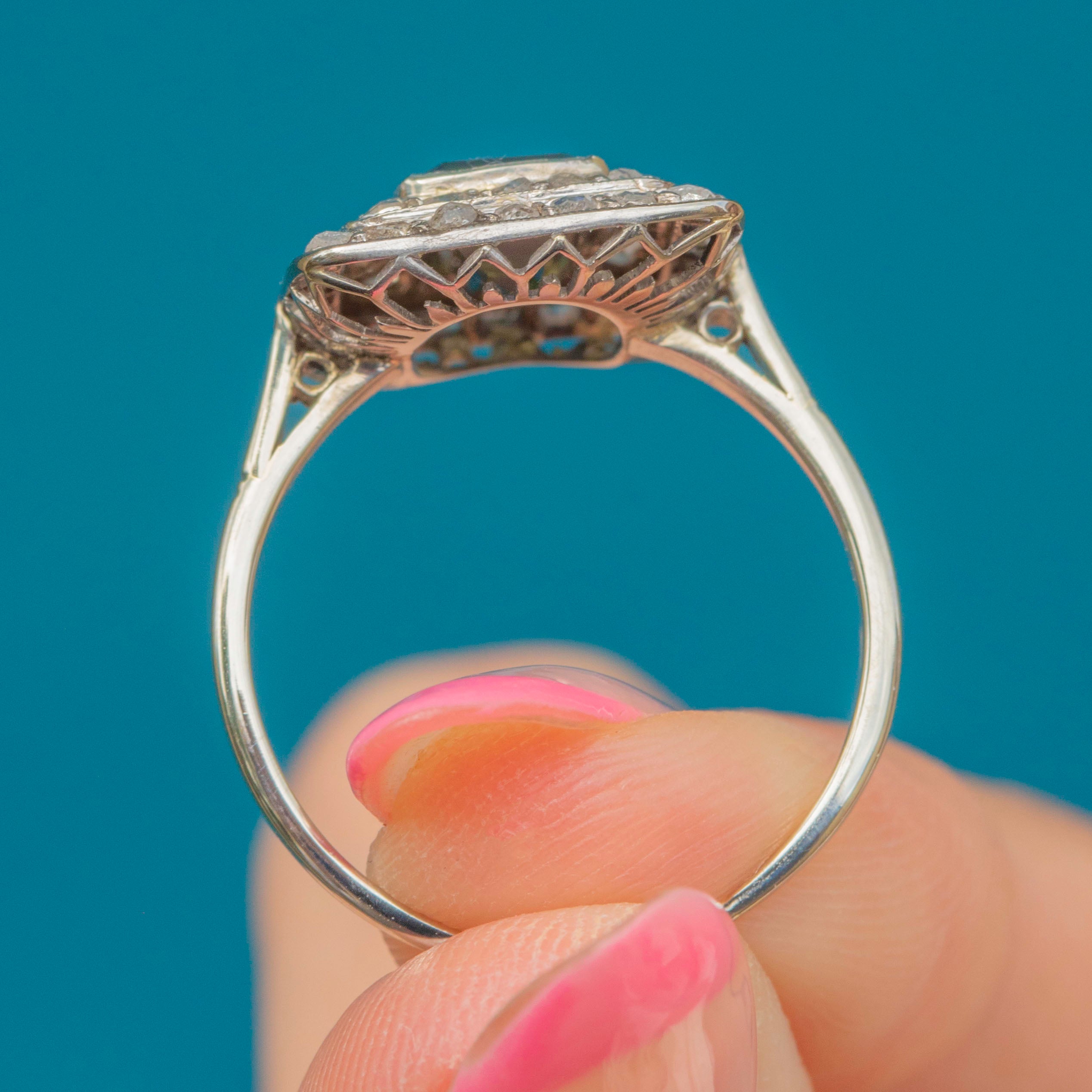Circa 1920, this Art Deco 14ct Gold green Tourmaline Diamond cluster ring encapsulates everything we know and adore about the Art Deco period. The perfectly formed geometric face and plethora of glittering rose-cut Diamonds, providing a charismatic sparkle that's just made for dancing, cocktail and just being fabulous!!