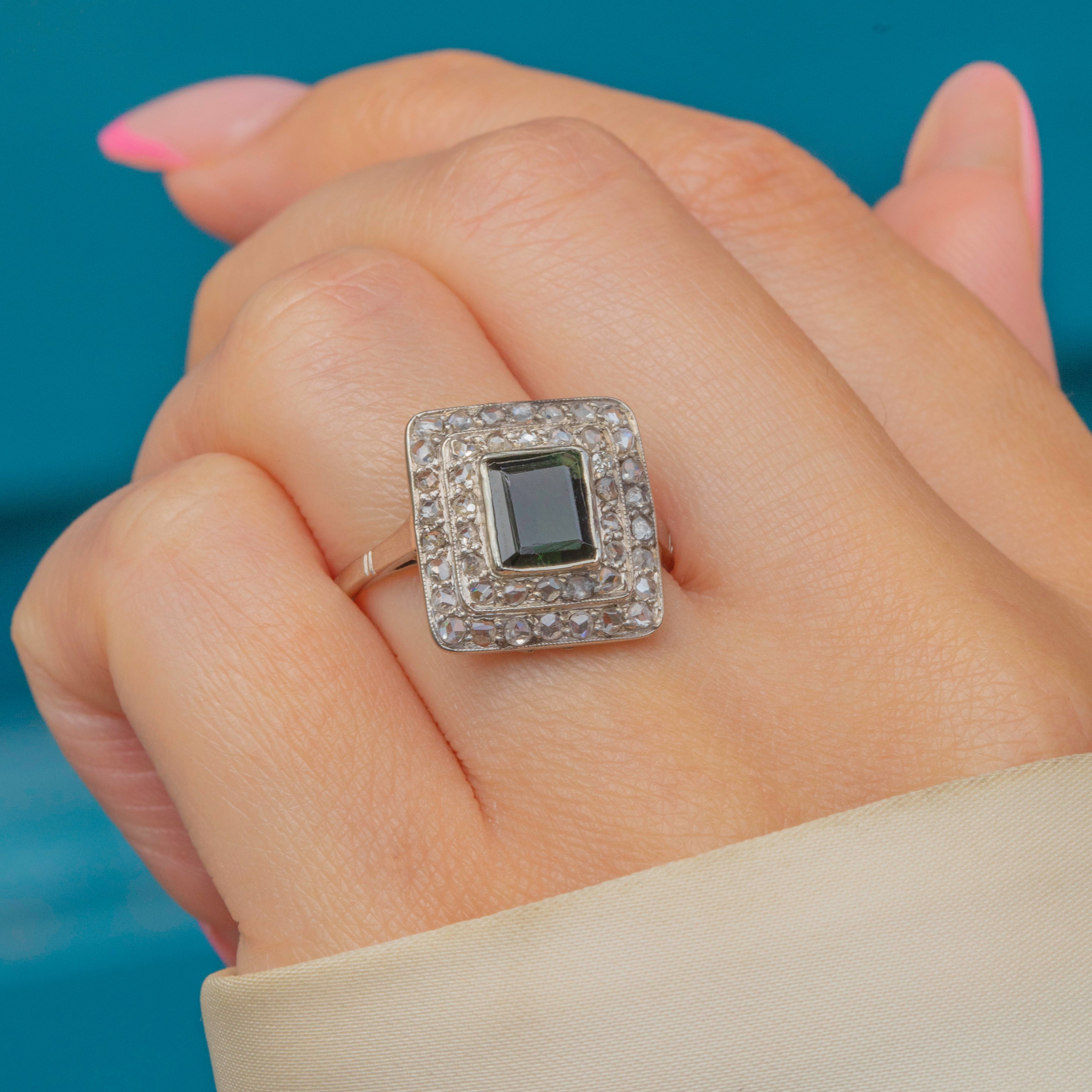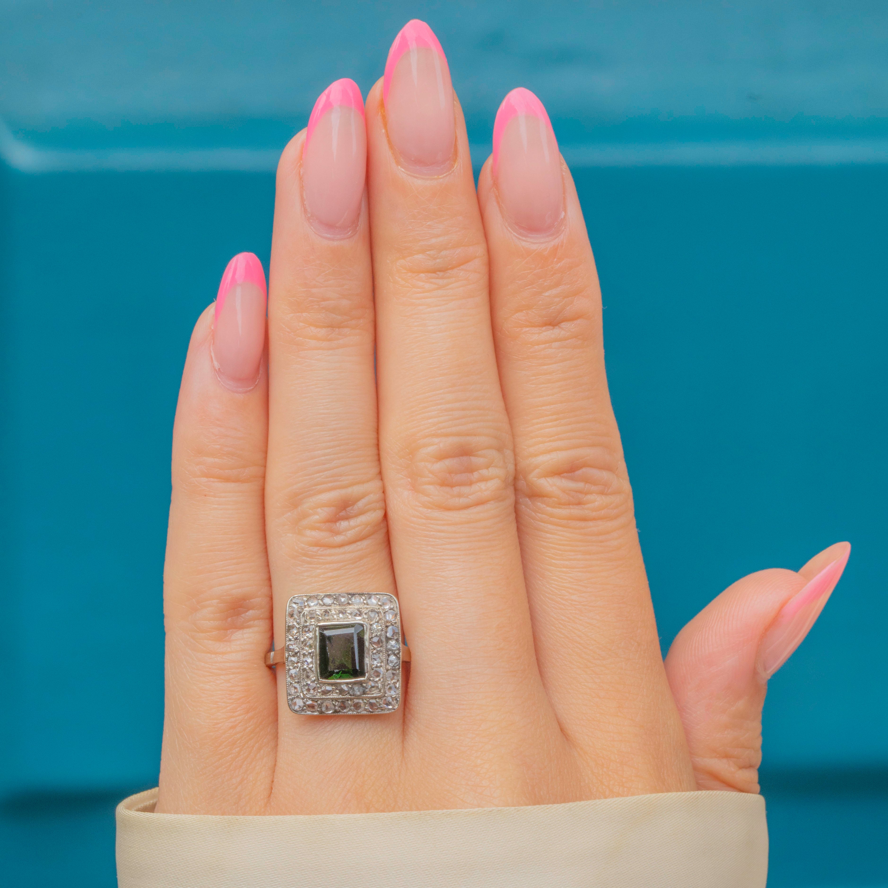 Art Deco 14ct Gold Green Tourmaline Diamond Cluster Ring, 1.65ct Tourmaline Item added