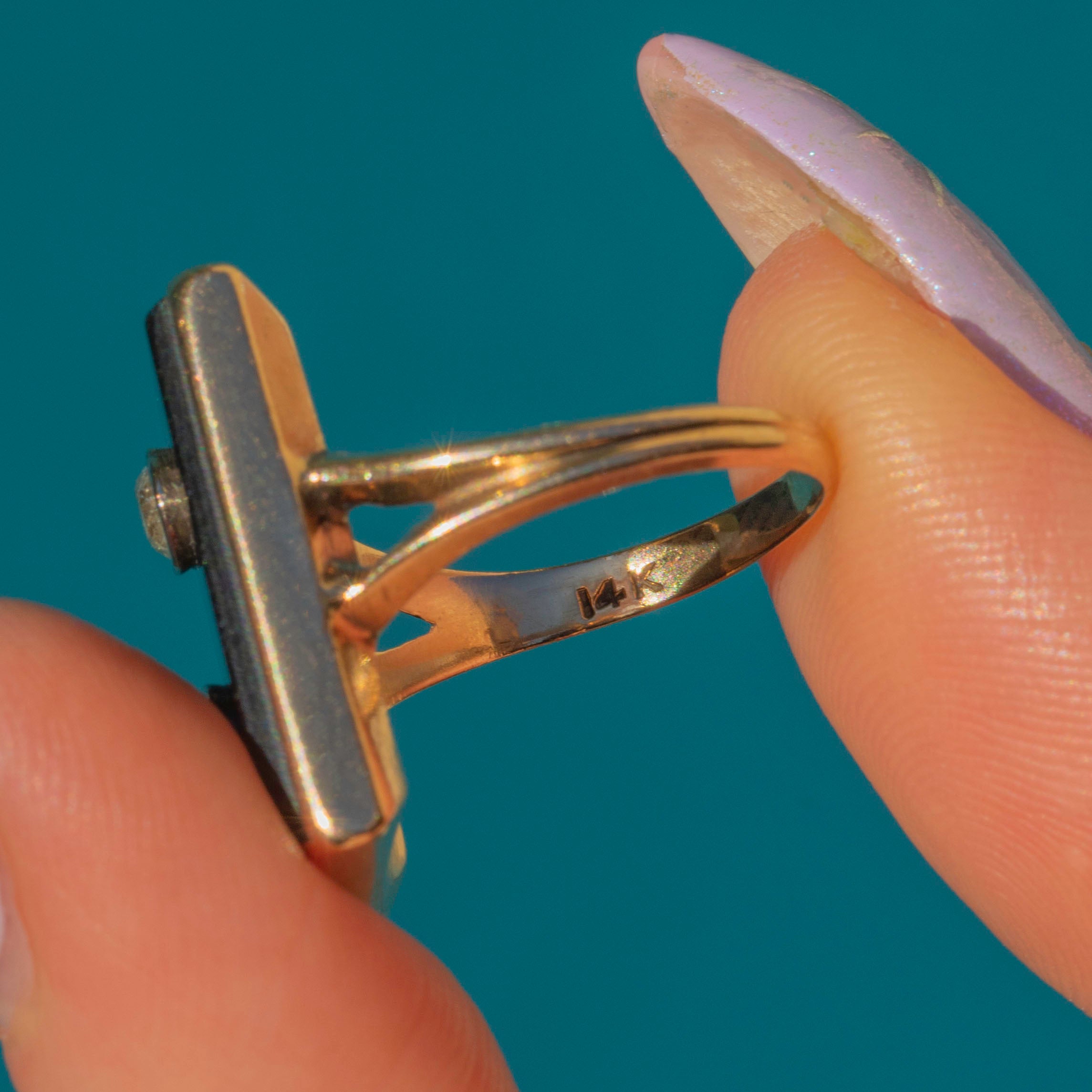VERY GOOD-EXCELLENT. This Art Deco 14ct Gold Onyx Diamond panel ring is in wonderful condition. The Onyx is perfectly smooth and the Diamonds are bright with no fleabites and beautiful crisp facets. They have a delightful character with high crowns and are very bright and lively with lots of sparkle! The gemstones are all securely set, and the ring has a nice aged Gold patina,  robust construction and is very comfortable to wear!