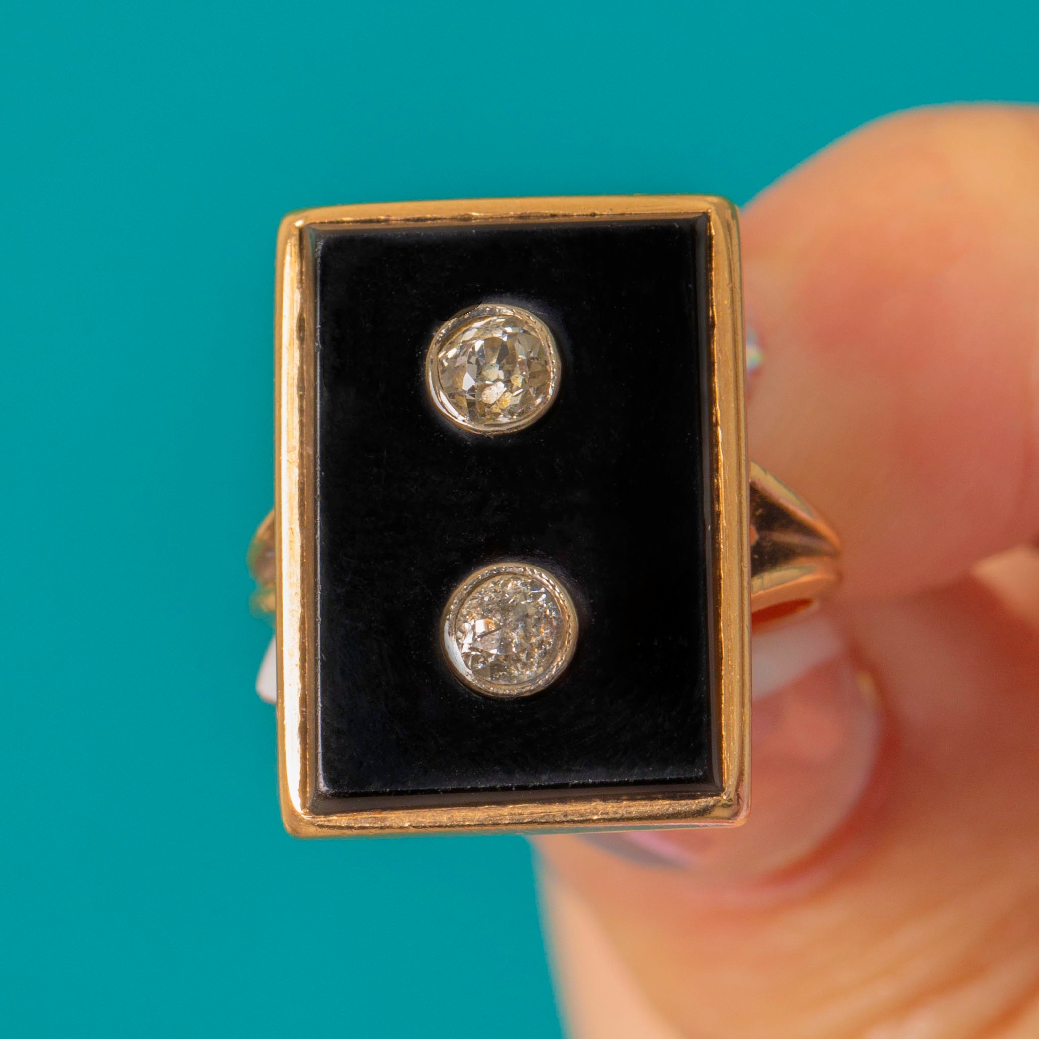 Bring some Deco decadence to your hand with this impressive Art Deco 14ct Gold Onyx Diamond panel ring! The buttery 14ct Gold displays a striking Onyx slab, inlaid with 0.30cts of old-European cut Diamonds providing the glossy ink-black surface with a bright scintillation.