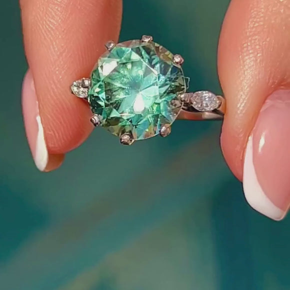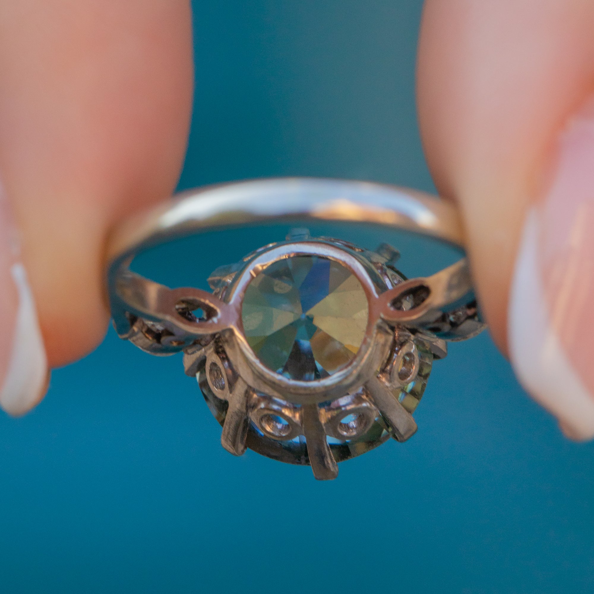 This Art Deco 14ct Gold and Platinum Blue Zircon Diamond ring is a phenomenal find! This lively blue Zircon ring leaves little to the imagination, with its 7.70ct blue Zircon gemstone taking centre stage.
