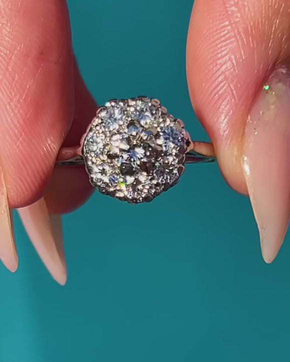 VERY GOOD: Diamonds are bright, lively and secure, with no chips or abrasions. The cluster retains its full shape and sparkle. Light wear to the band and settings commensurate with age, but strong and ready for daily wear.