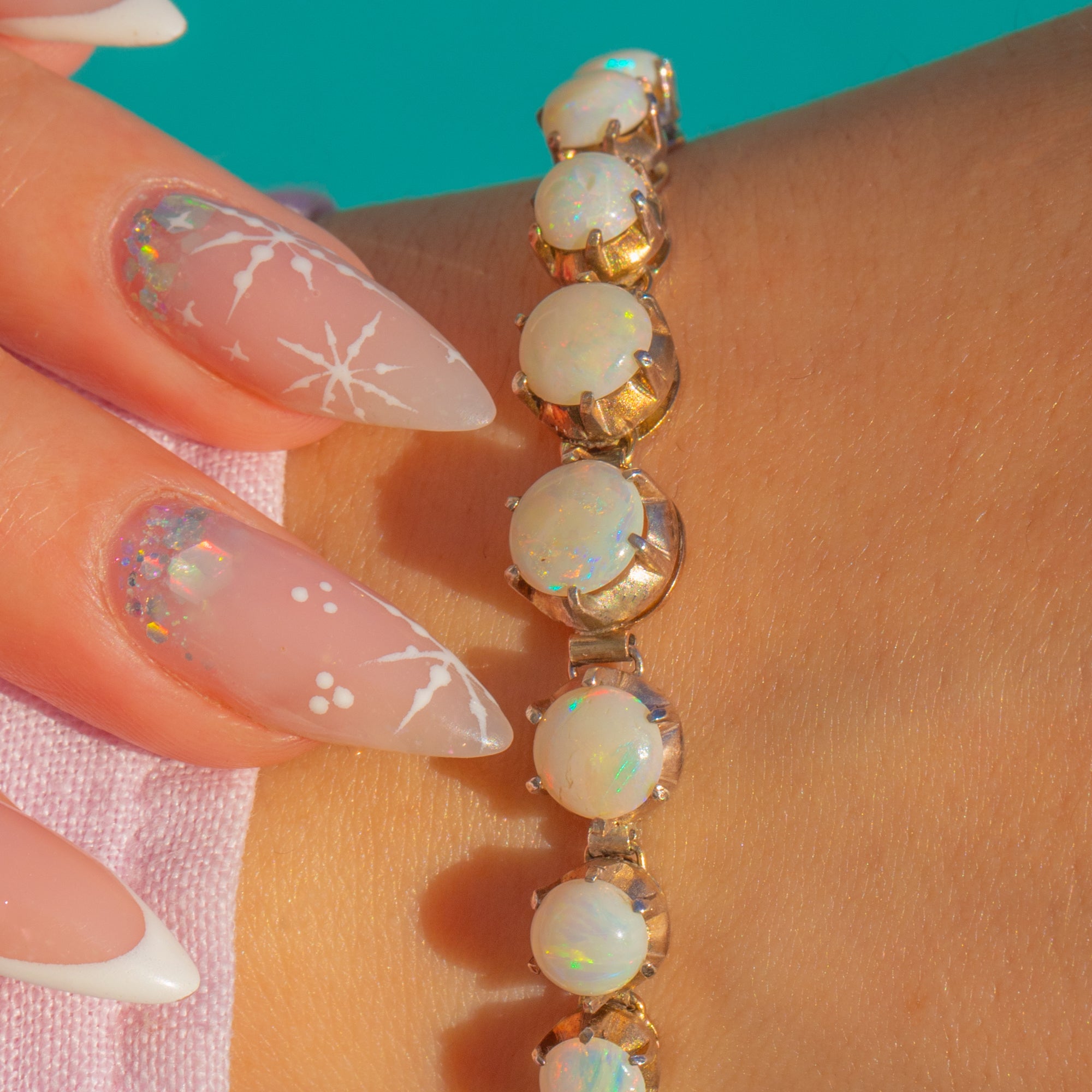 This late Art Deco Opal line bracelet is an exceptionally beautiful piece, set with approximately 15.00 carats of natural solid Opals.