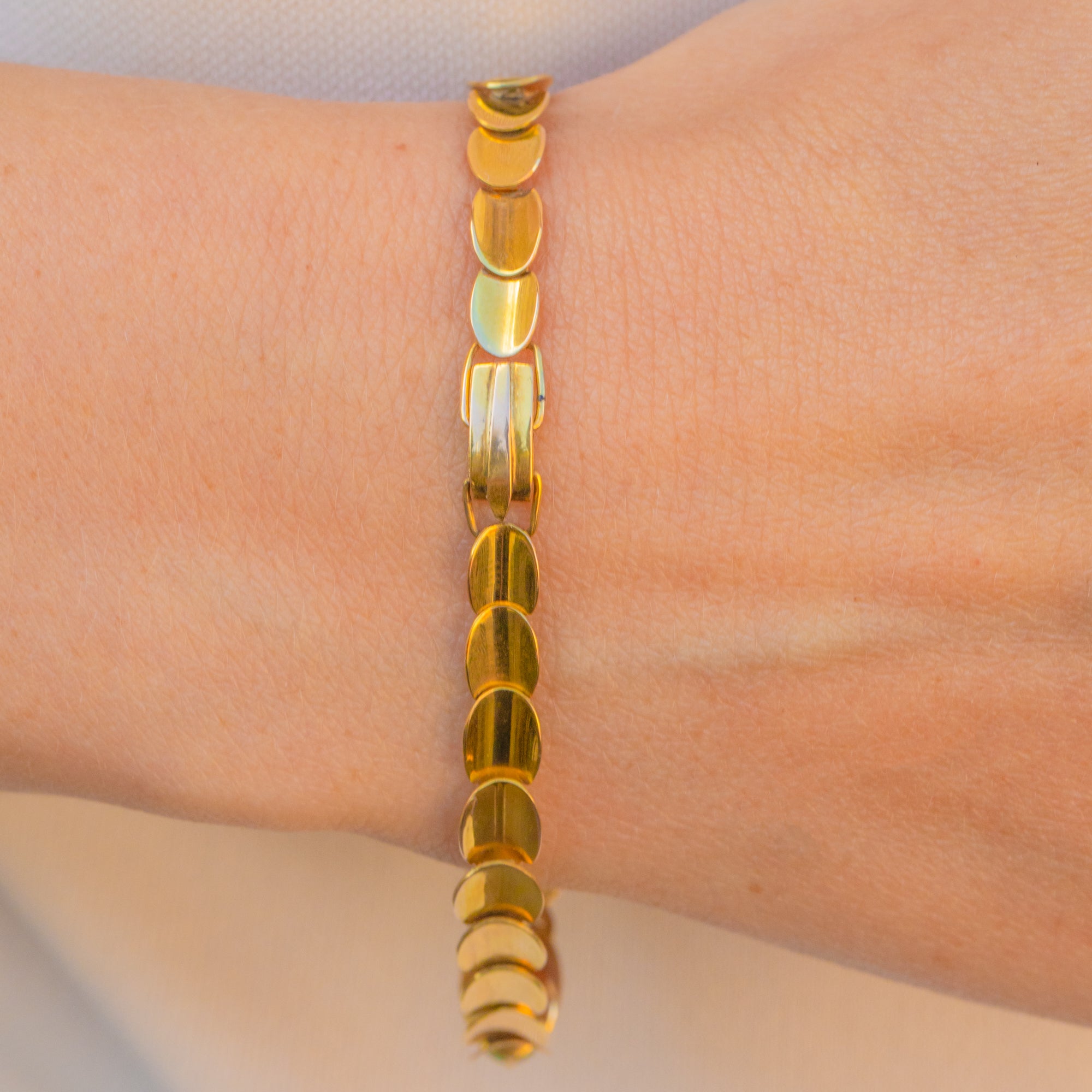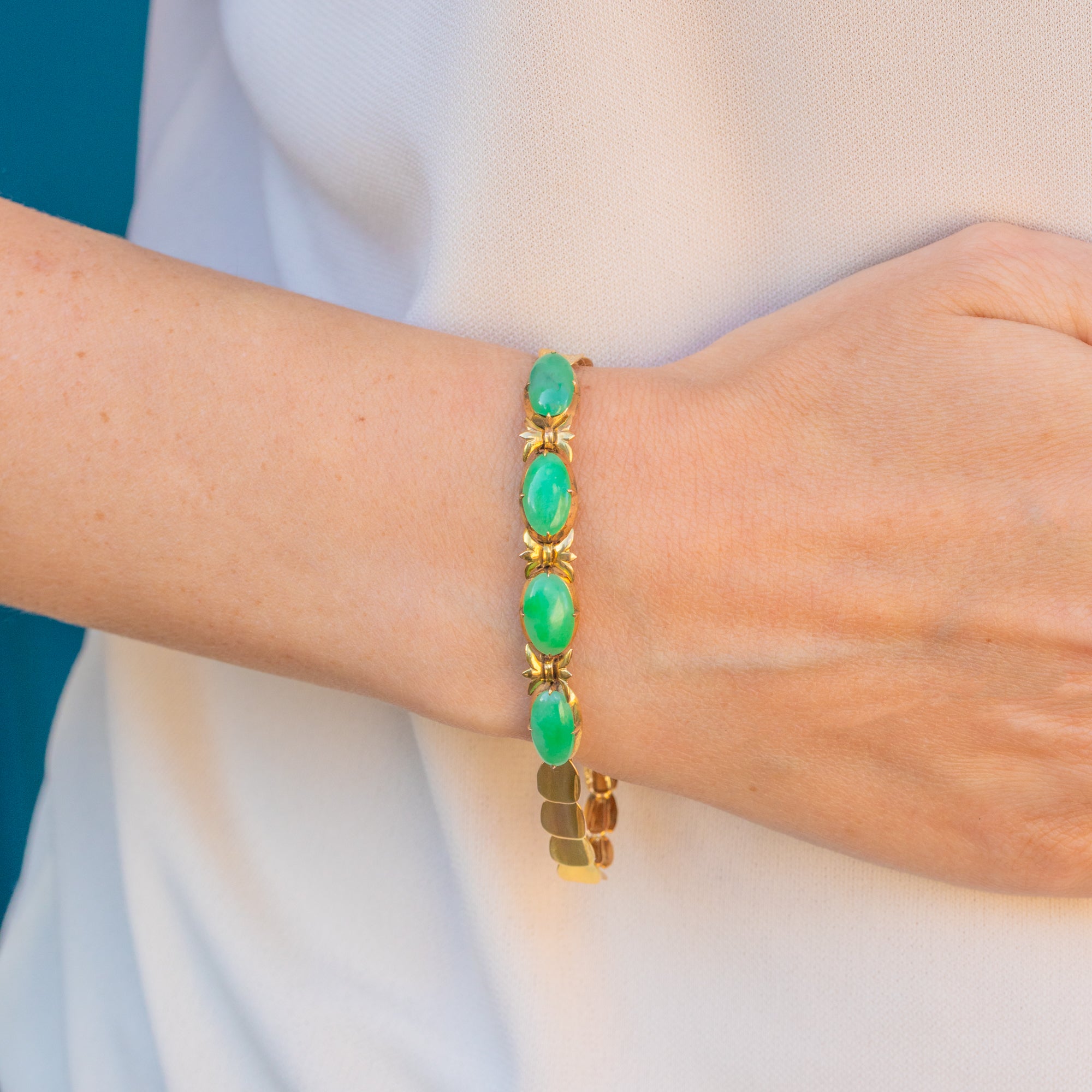 EXCELLENT. We are pleased to present this Art Deco 15ct Gold Jade bracelet in excellent condition. Each Jade cabochon is perfectly smooth and securely held within its claw settings. The bracelet itself has a wonderfully bright lustre and sits comfortably against your wrist, there is not a scratch to note and the 15ct Gold is brightly saturated. The unique clasp is in perfect working condition allowing you to wear this phenomenal antique Jade bracelet with utmost confidence!
