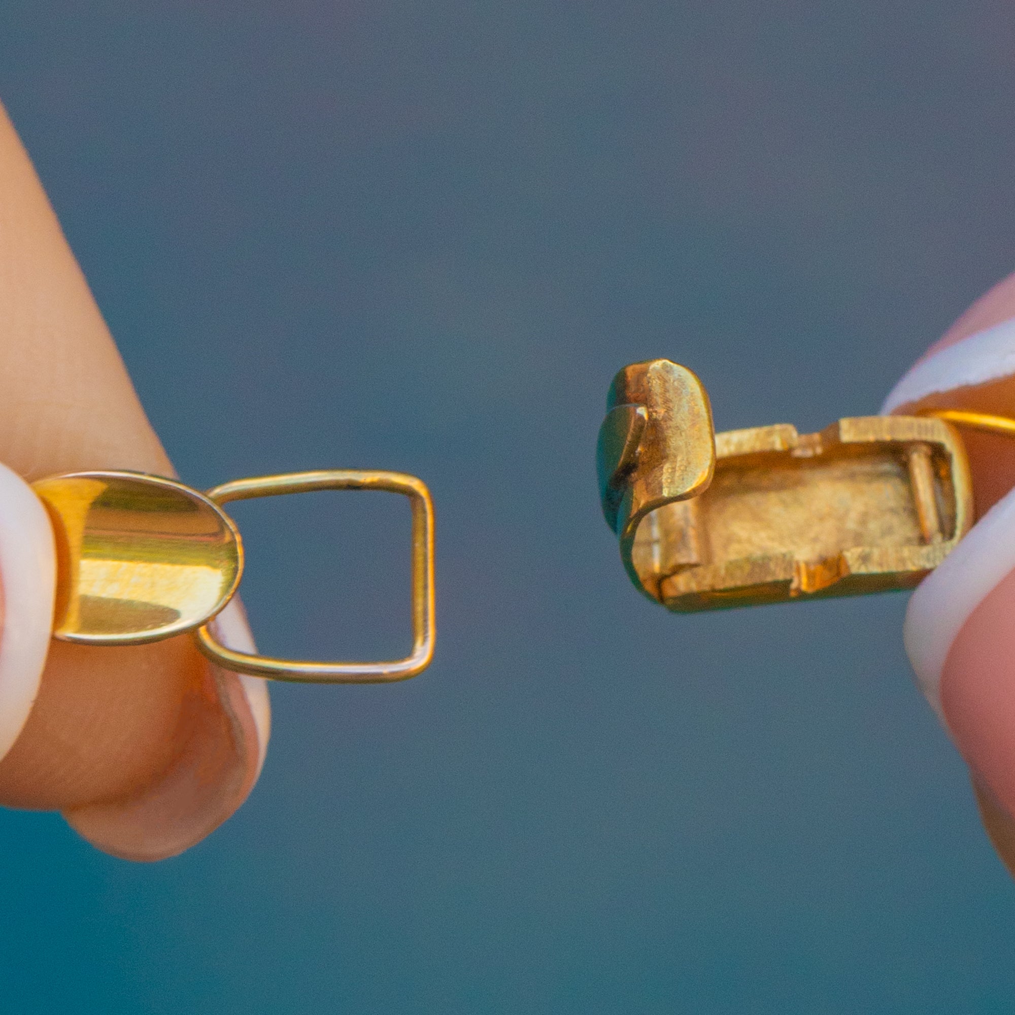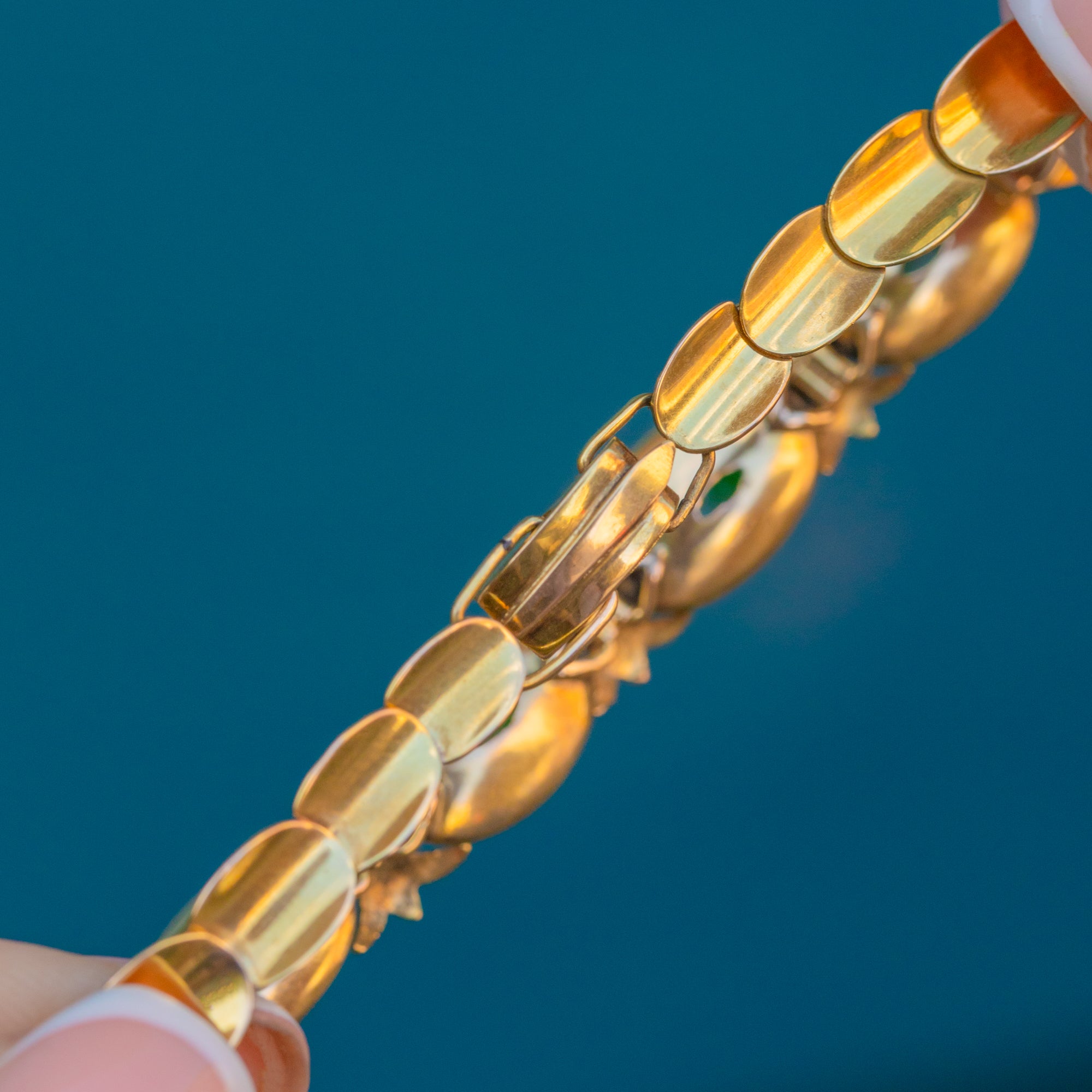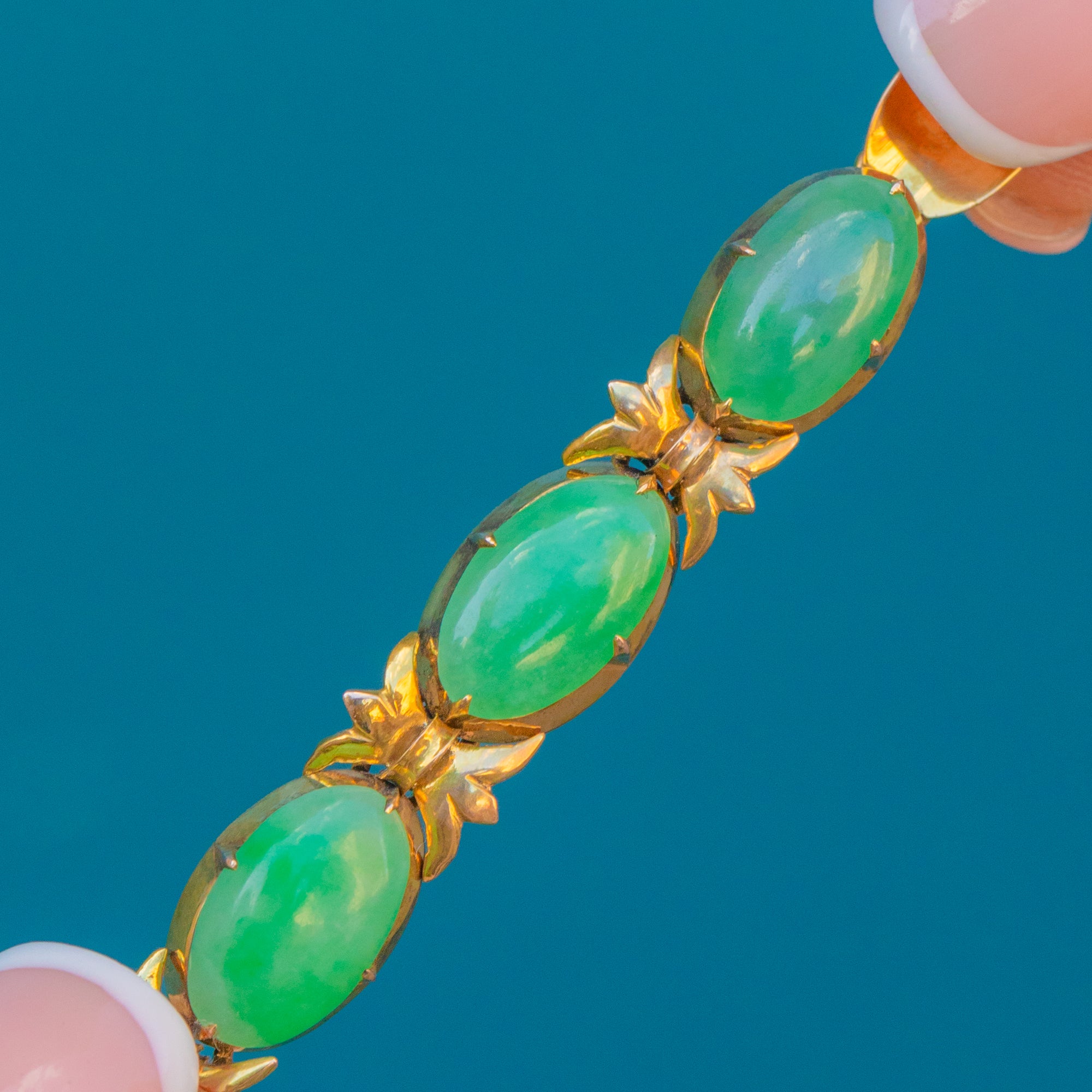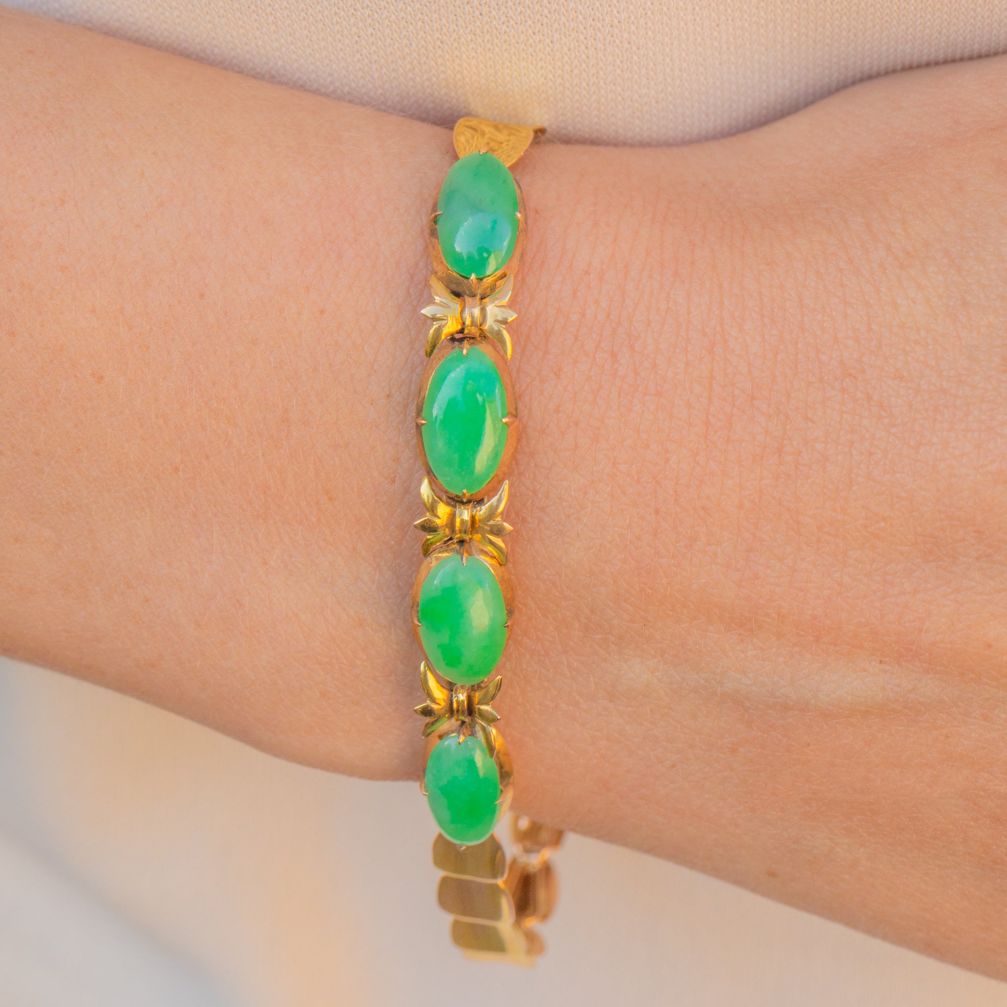 Calling lovers of everything Deco, this Art Deco 15ct Gold Jade bracelet will make the perfect finishing touch to your outfit! The four smoothly cut Jade cabochons boast a fresh mint green hue, perfectly complimented by sumptuous ornately formed Gold details.