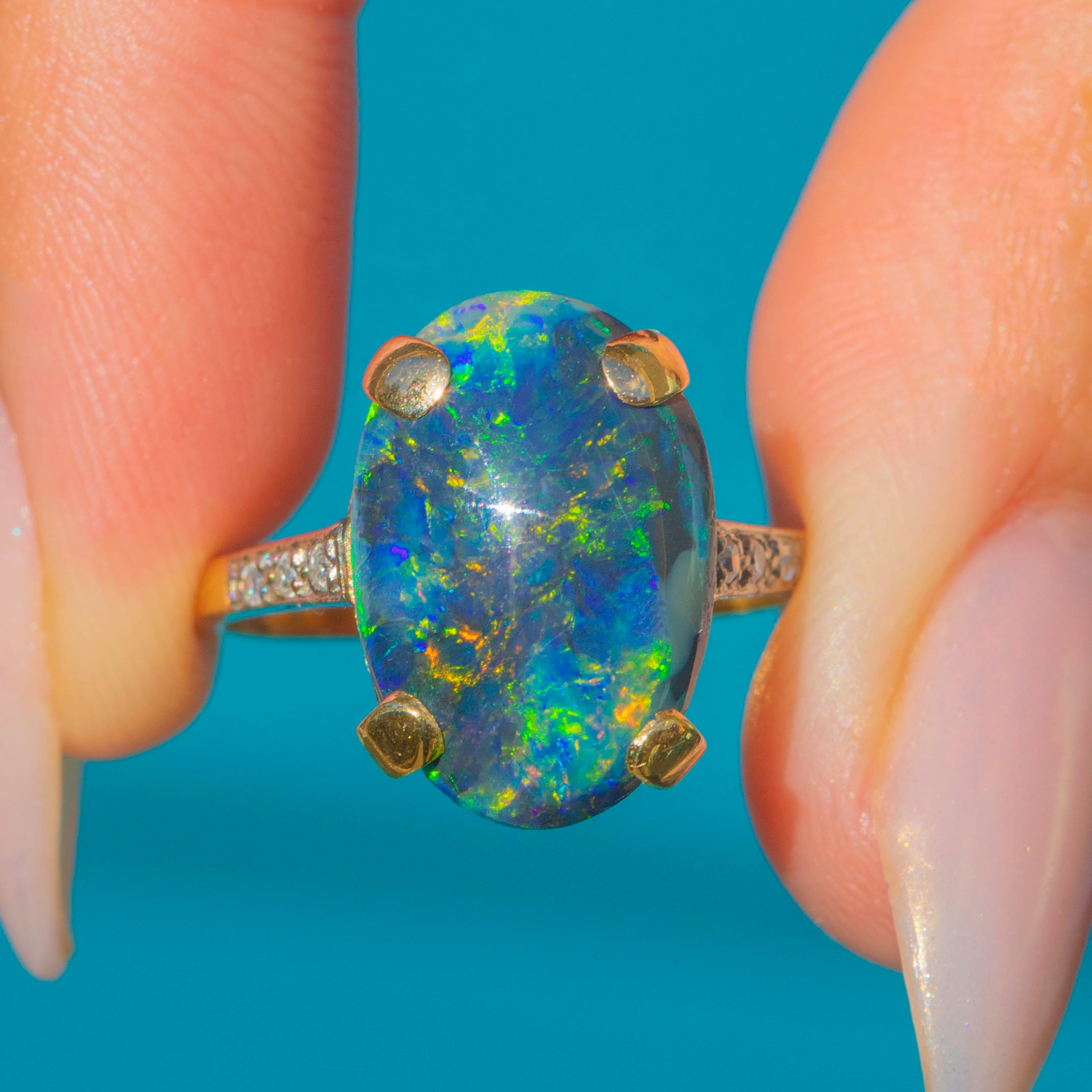The shoulders are set with bright G-H colour, VS1-VS2 clarity Diamonds that add sparkle and refinement, enhancing the depth and fire of the Opal. Stamped “18k” and accompanied by WGI certification, this is a rare and striking statement piece for any serious antique jewellery collection.