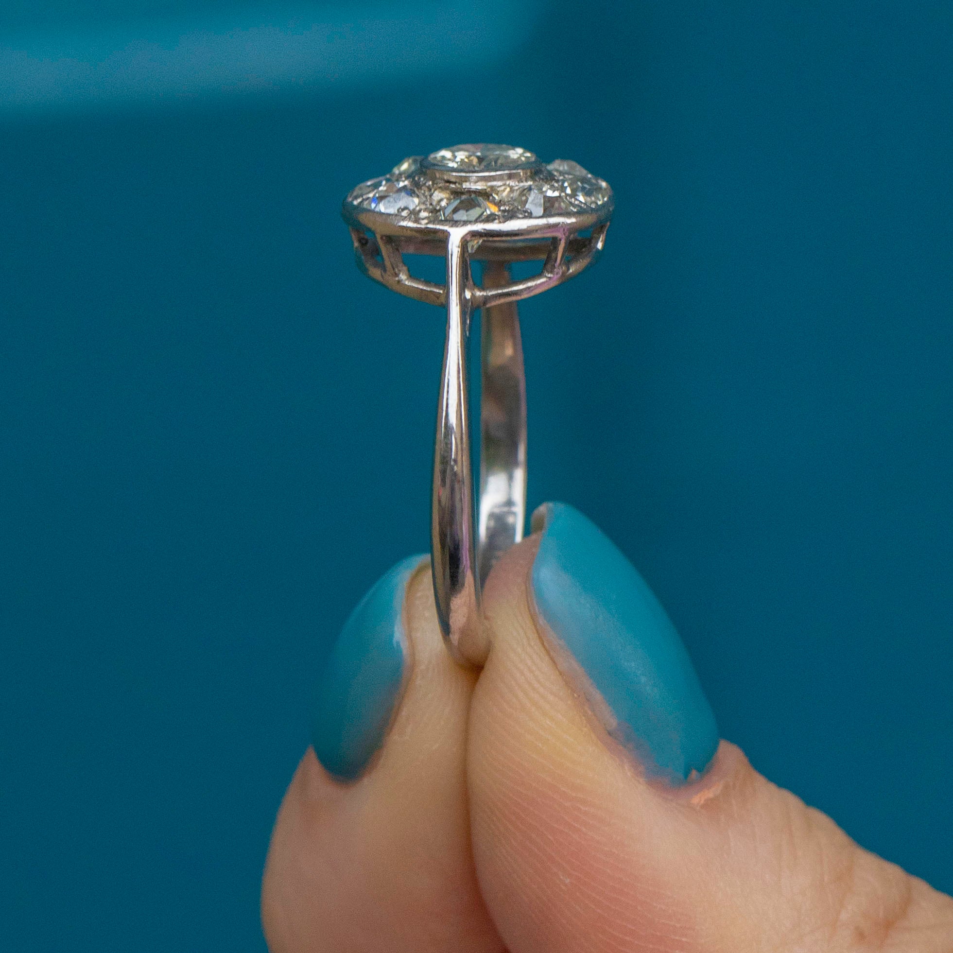 MATERIALS: Tests as 18ct White Gold band, Platinum head, Round Brilliant Diamond (0.40ct), Old Mine Cut Diamonds (0.48ct)