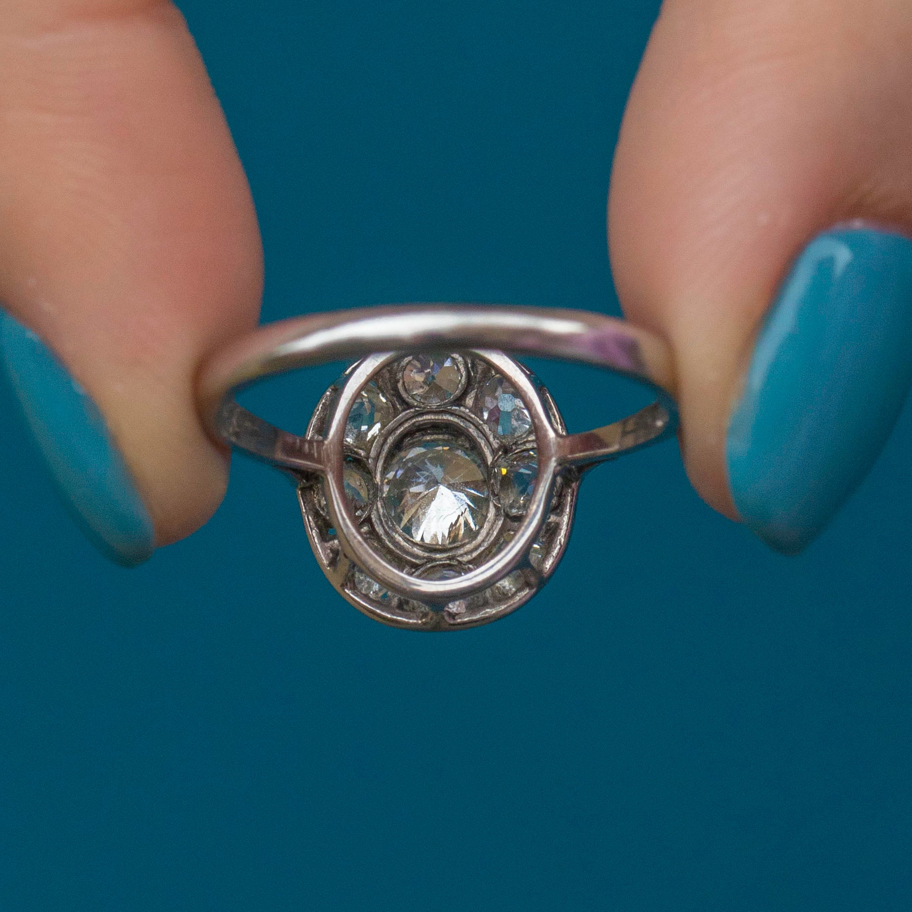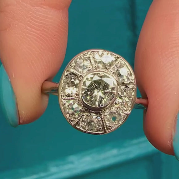 EXCELLENT. We are pleased to present this Art Deco 18ct Gold Diamond oval cluster ring in excellent condition! Her 18ct white Gold band has kept its shape remarkably well and has lovely Art Deco stamps inside. Her nine dazzling diamonds are brilliantly bright, free from flea bites, and are set securely in Platinum. As far as we are concerned, she is pure perfection!