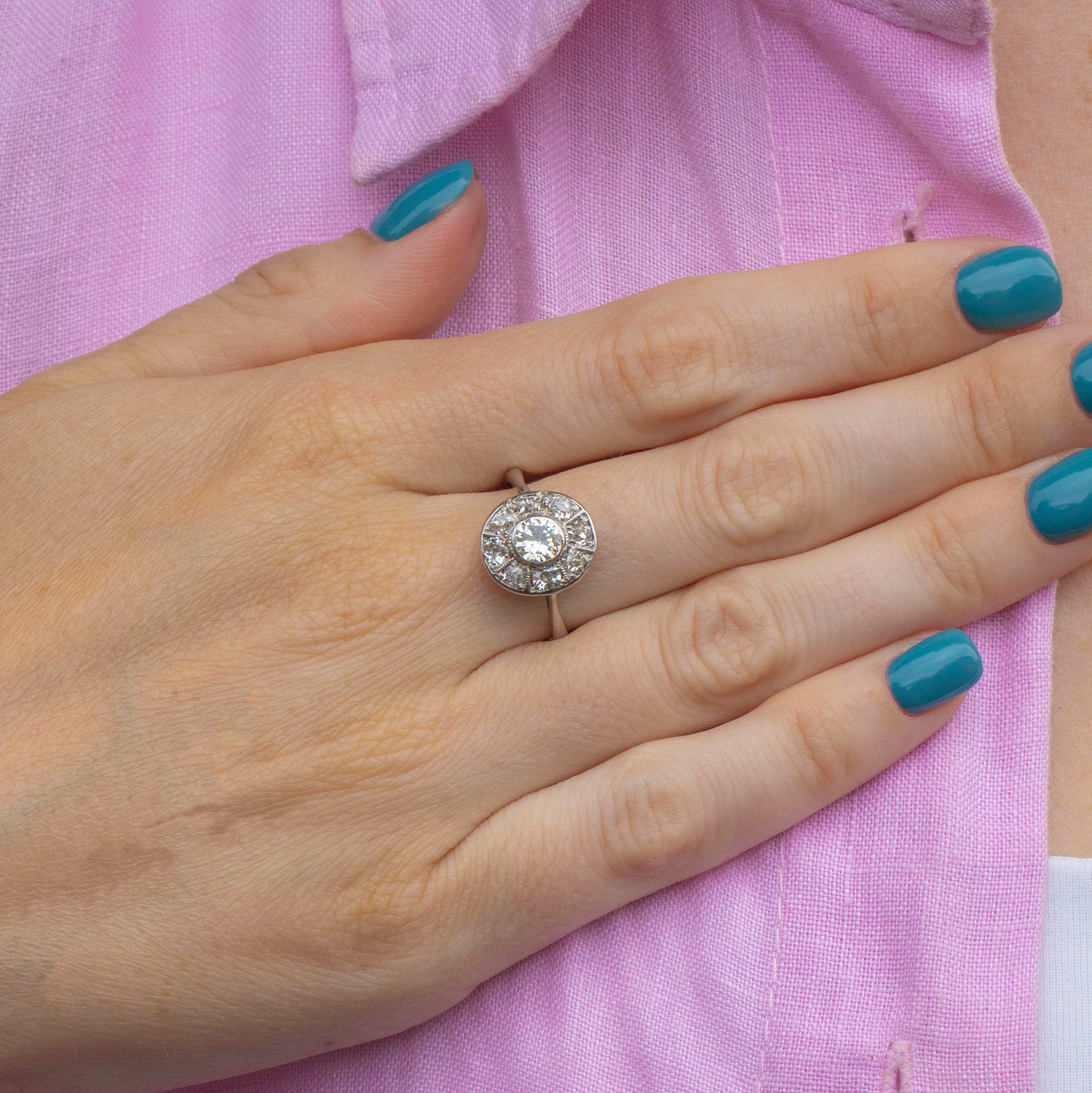If you have a penchant for scintillating treasures, this exquisite Art Deco 18ct Gold Diamond oval cluster ring was made for you! The dazzling 0.40ct brilliant-cut central Diamond is haloed by eight old mine-cut Diamonds that glisten elegantly, enchanting all who view her.
