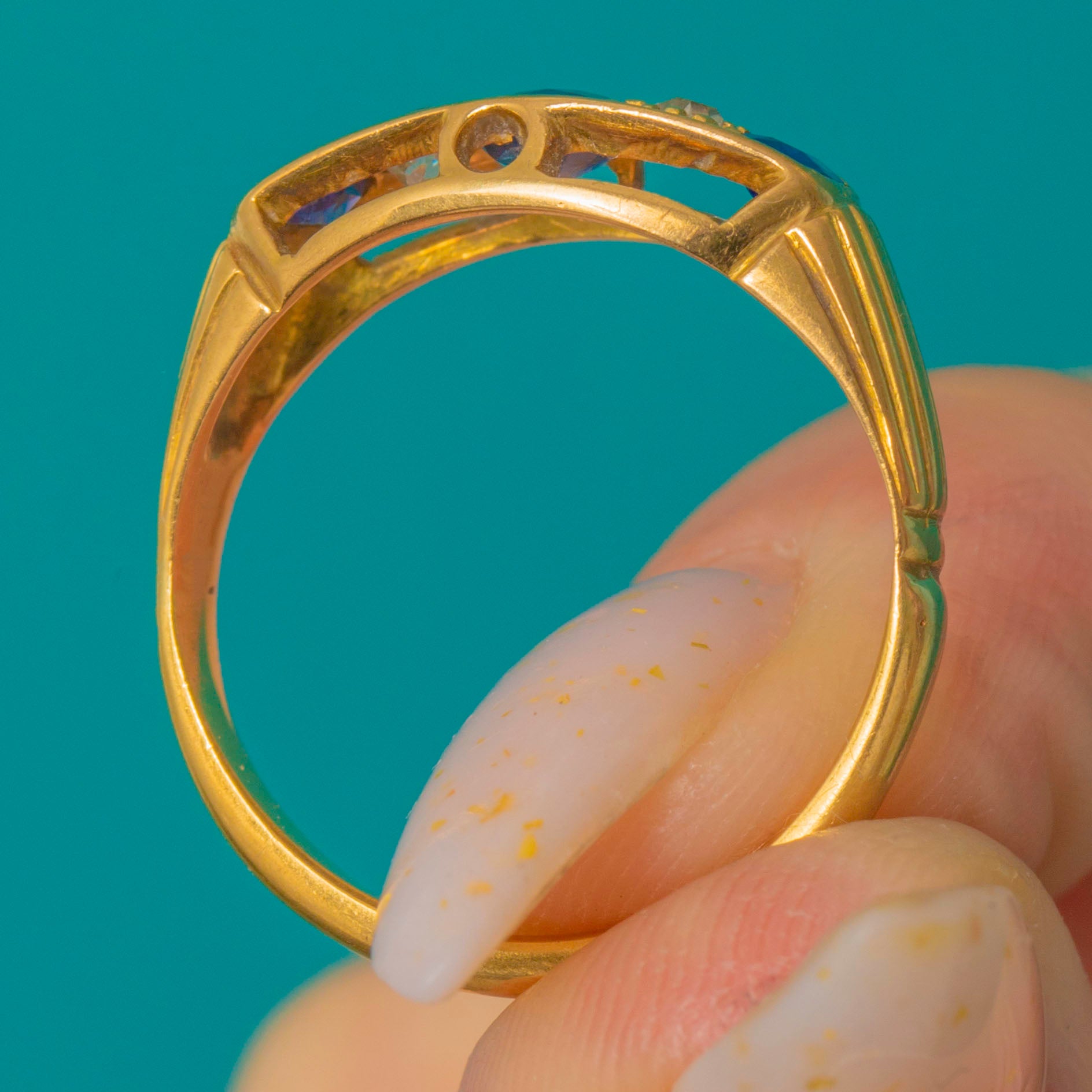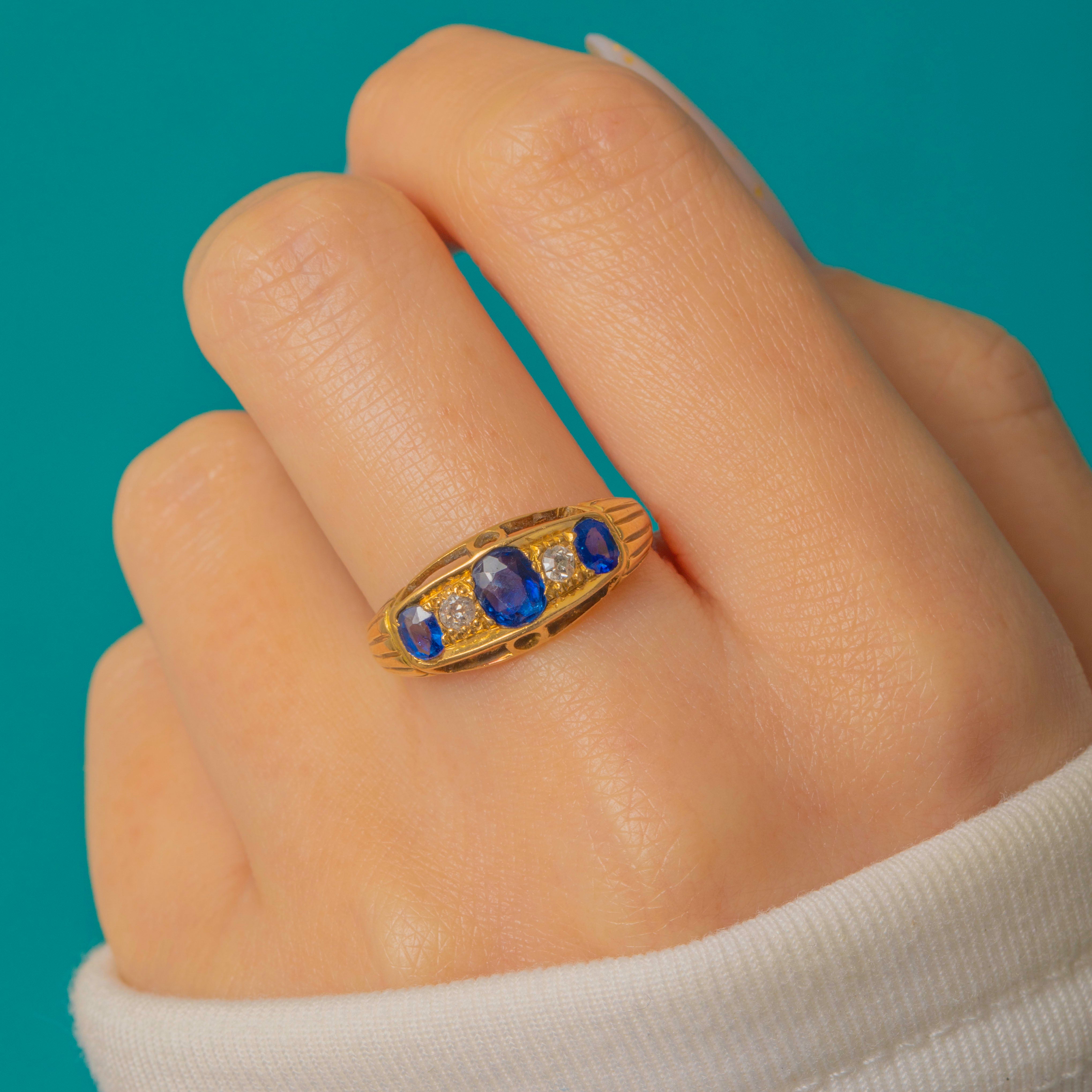 EXCELLENT: The Sapphires and Diamonds are bright and well-matched, with only light surface wear visible under magnification. The 18ct Gold band and settings are crisp and secure, showing minimal age-related wear. Beautifully preserved and ready to wear.