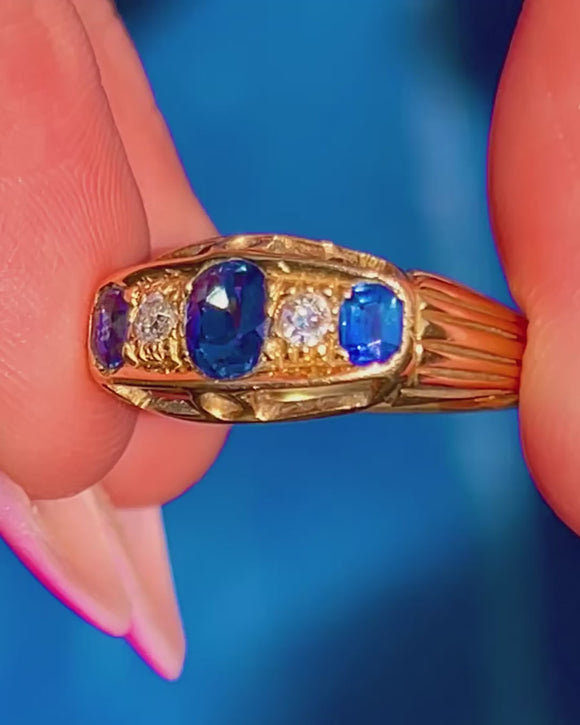 Antique 18ct Gold Natural Sapphire & Diamond Five Stone Boat Ring