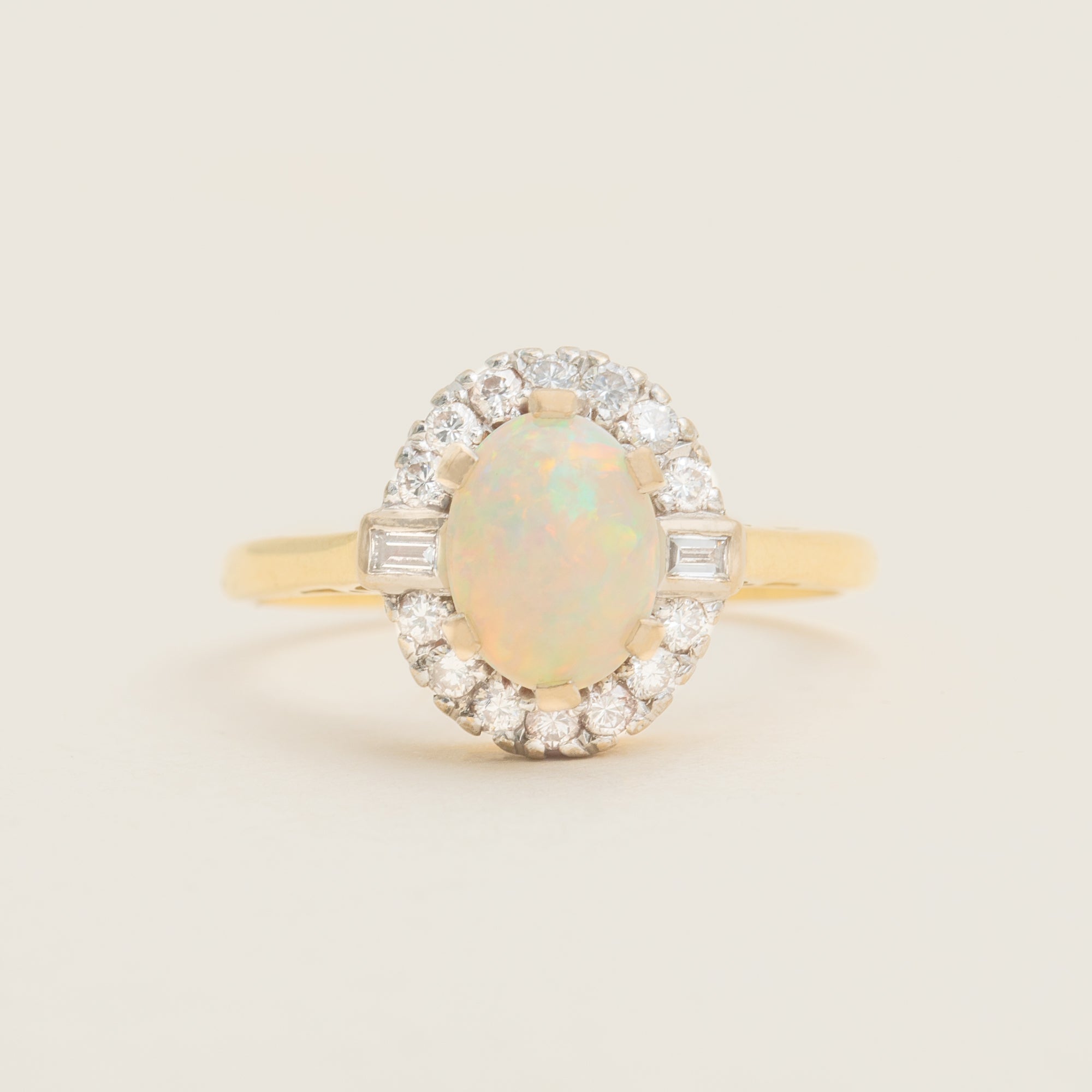 A sea of scintillating Diamonds is poised atop a gorgeous gallery featuring a delicate scallop edge design - accented with two additional baguette-cut Diamonds adding a unique flare to the ring. Buttery and glossy, this Opal Diamond ring glides onto your hand a dream with her smooth 18ct Gold band, adding splendour whilst not detracting from her abundance of gemstones. Opals and Diamonds make for one of the most eye-catching gemstone duos, with this Art Deco Gold Opal ring being no exception!