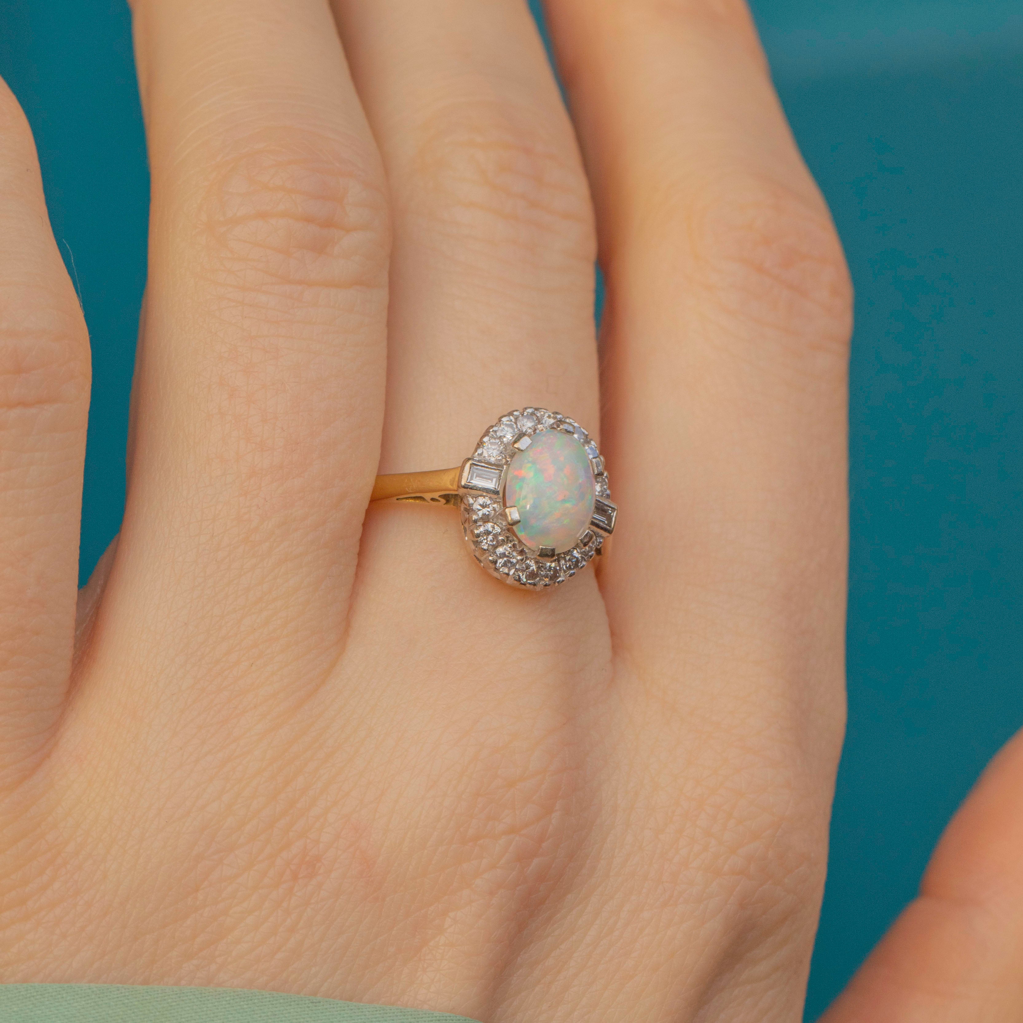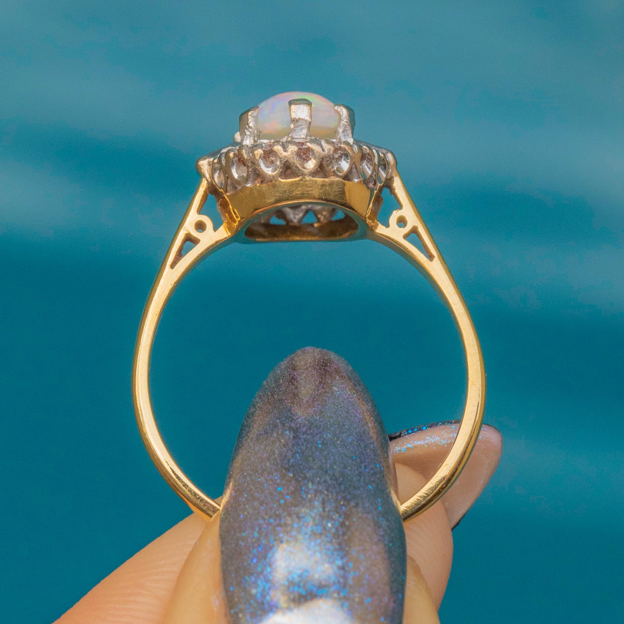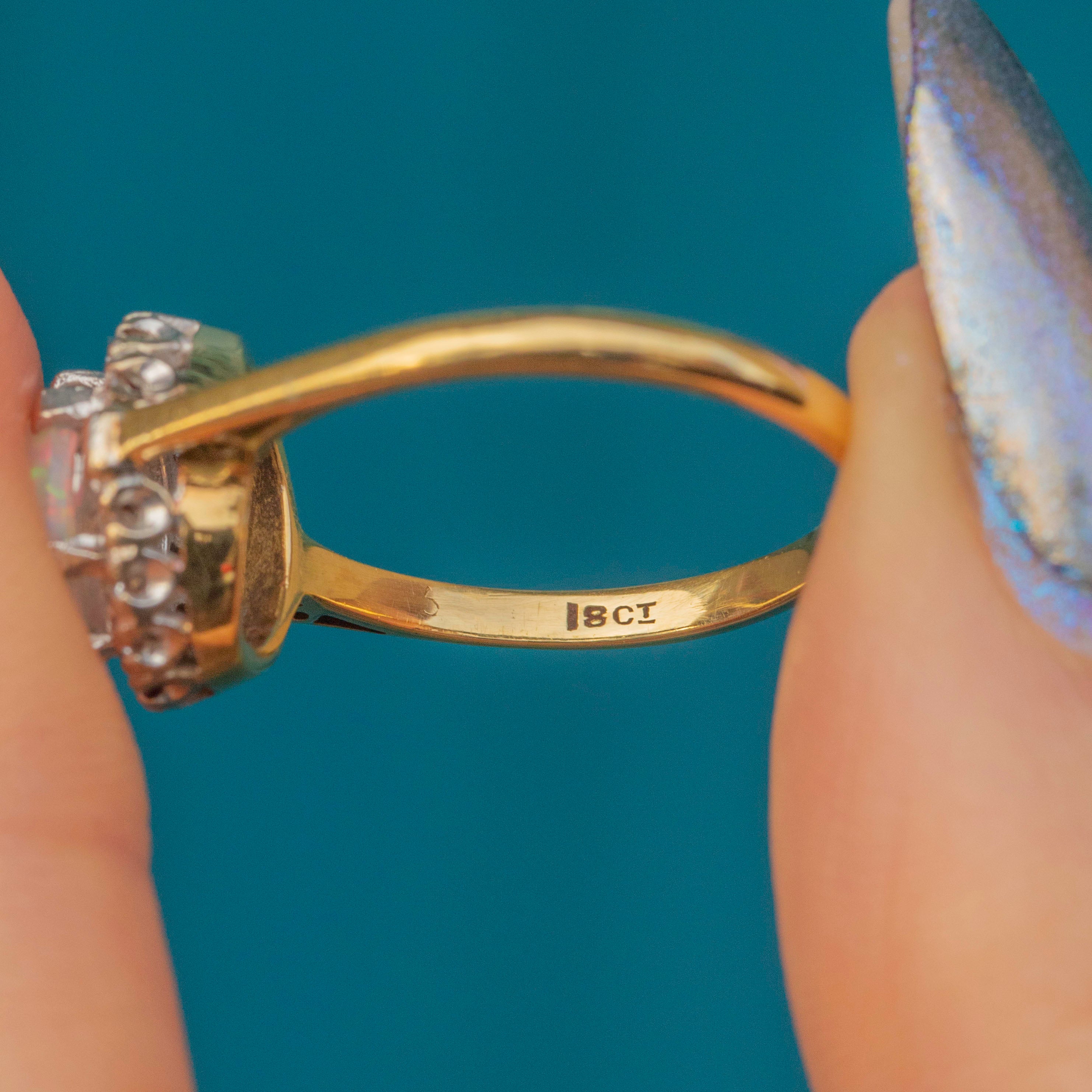 EXCELLENT. This Art Deco 18ct Gold Opal Diamond cluster ring has been well preserved and is in excellent condition! The Opal is smooth to the touch, with an absorbing firework display of colour and is secure within her claw settings. Each Diamond is secure and present, beautifully complemented by their White Gold settings. The ring band has a well-rounded form, with the 18ct Gold remaining highly saturated. There's no doubt this Gold Diamond ring will always be the talking point!