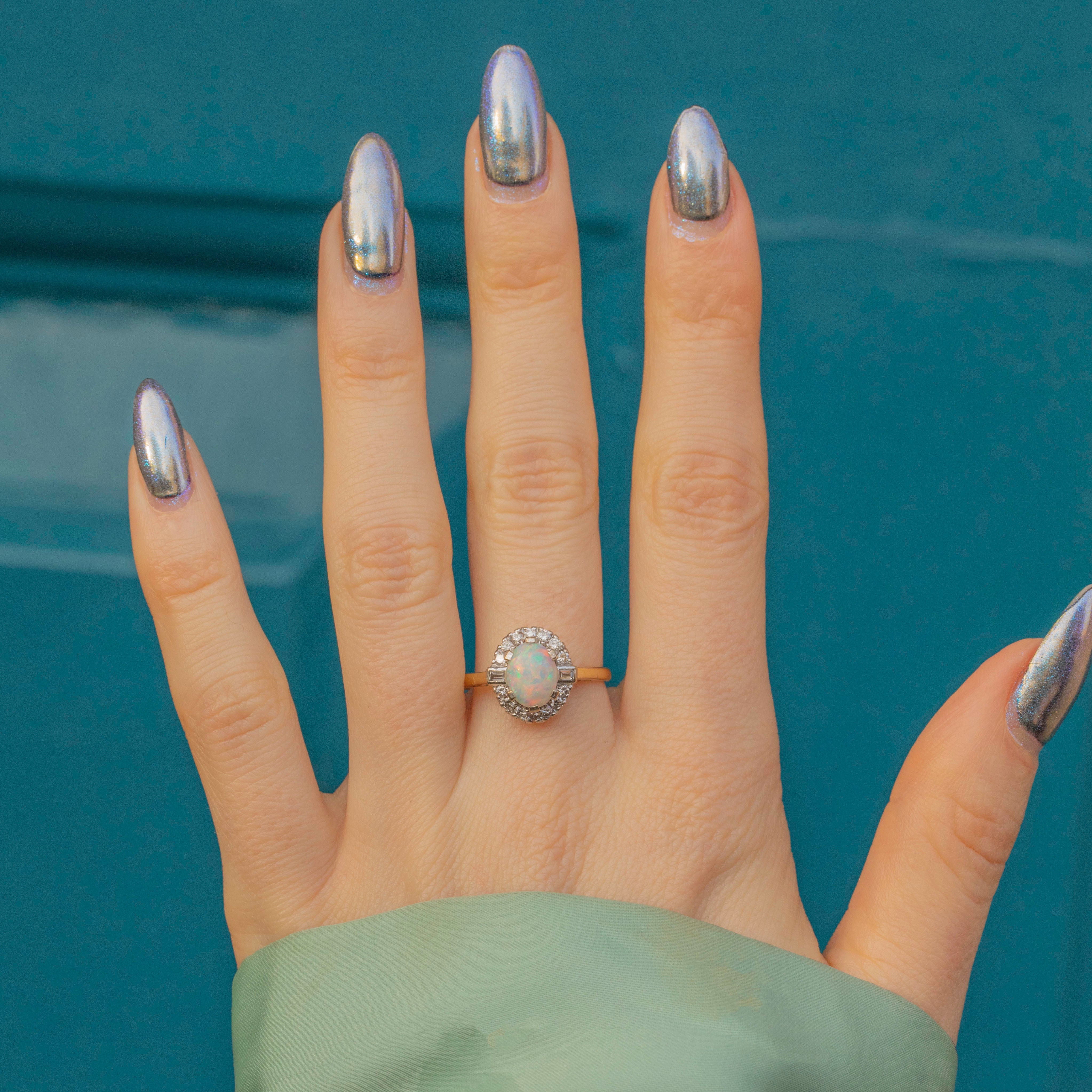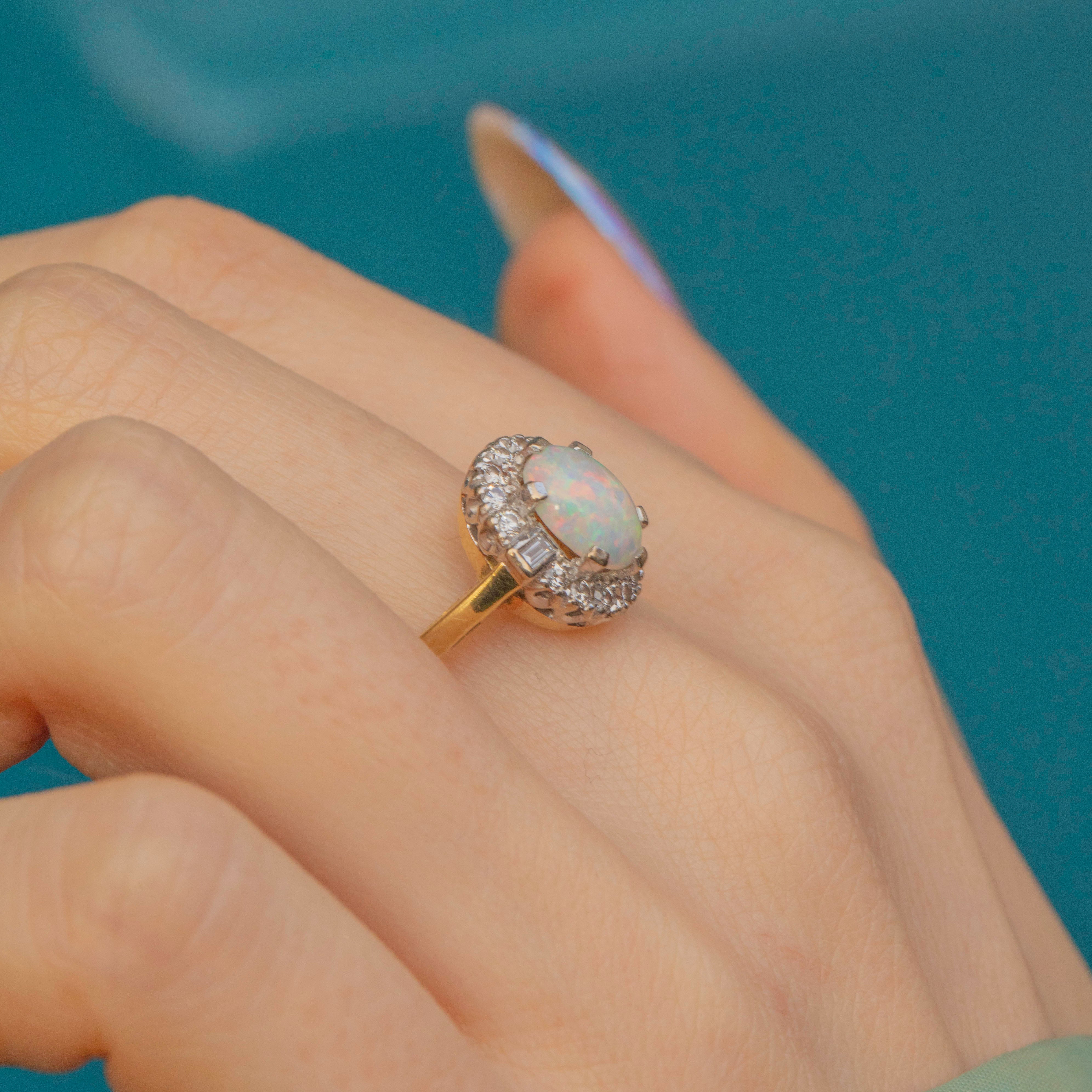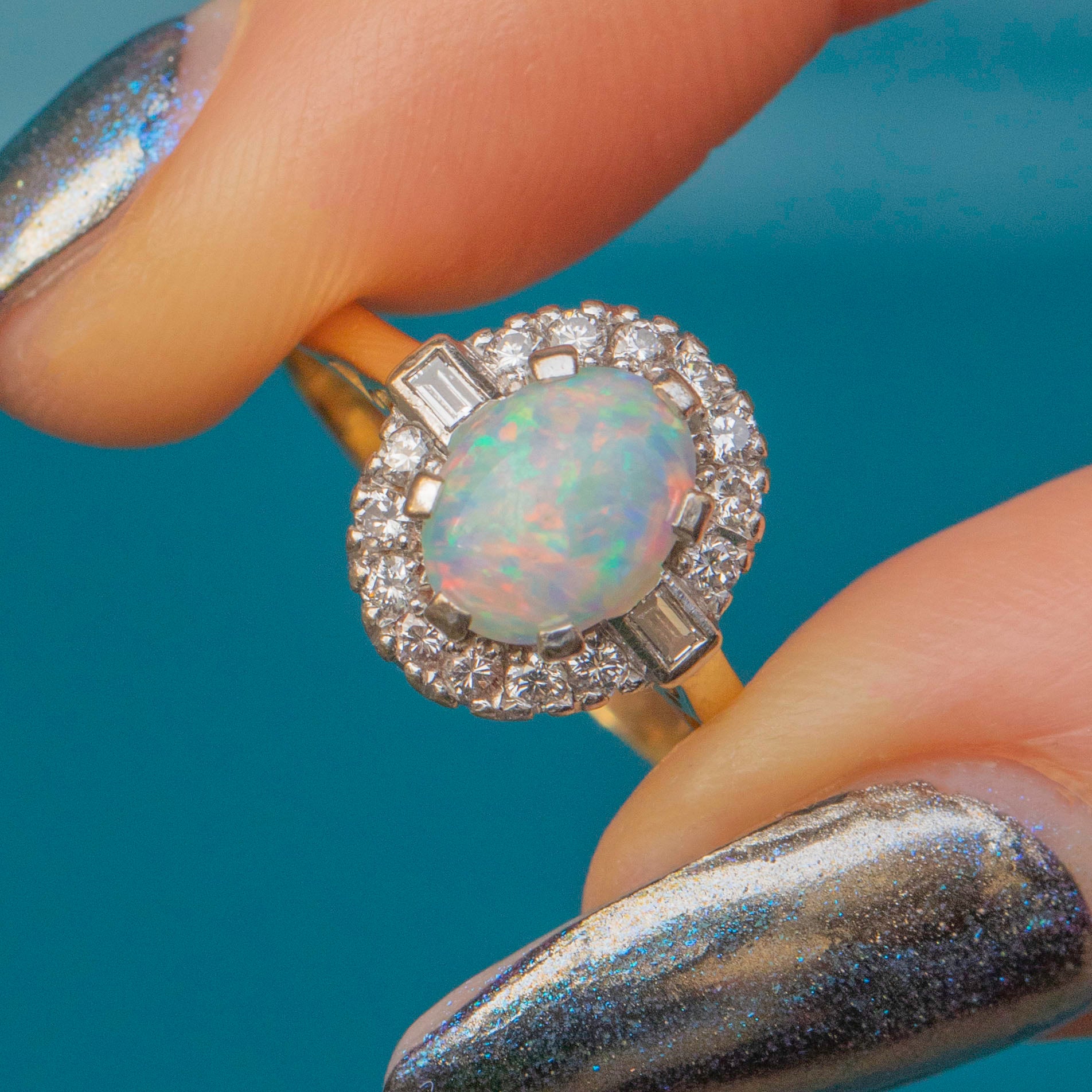 EXCELLENT. This Art Deco 18ct Gold Opal Diamond cluster ring has been well preserved and is in excellent condition! The Opal is smooth to the touch, with an absorbing firework display of colour and is secure within her claw settings. Each Diamond is secure and present, beautifully complemented by their White Gold settings. The ring band has a well-rounded form, with the 18ct Gold remaining highly saturated. There's no doubt this Gold Diamond ring will always be the talking point!