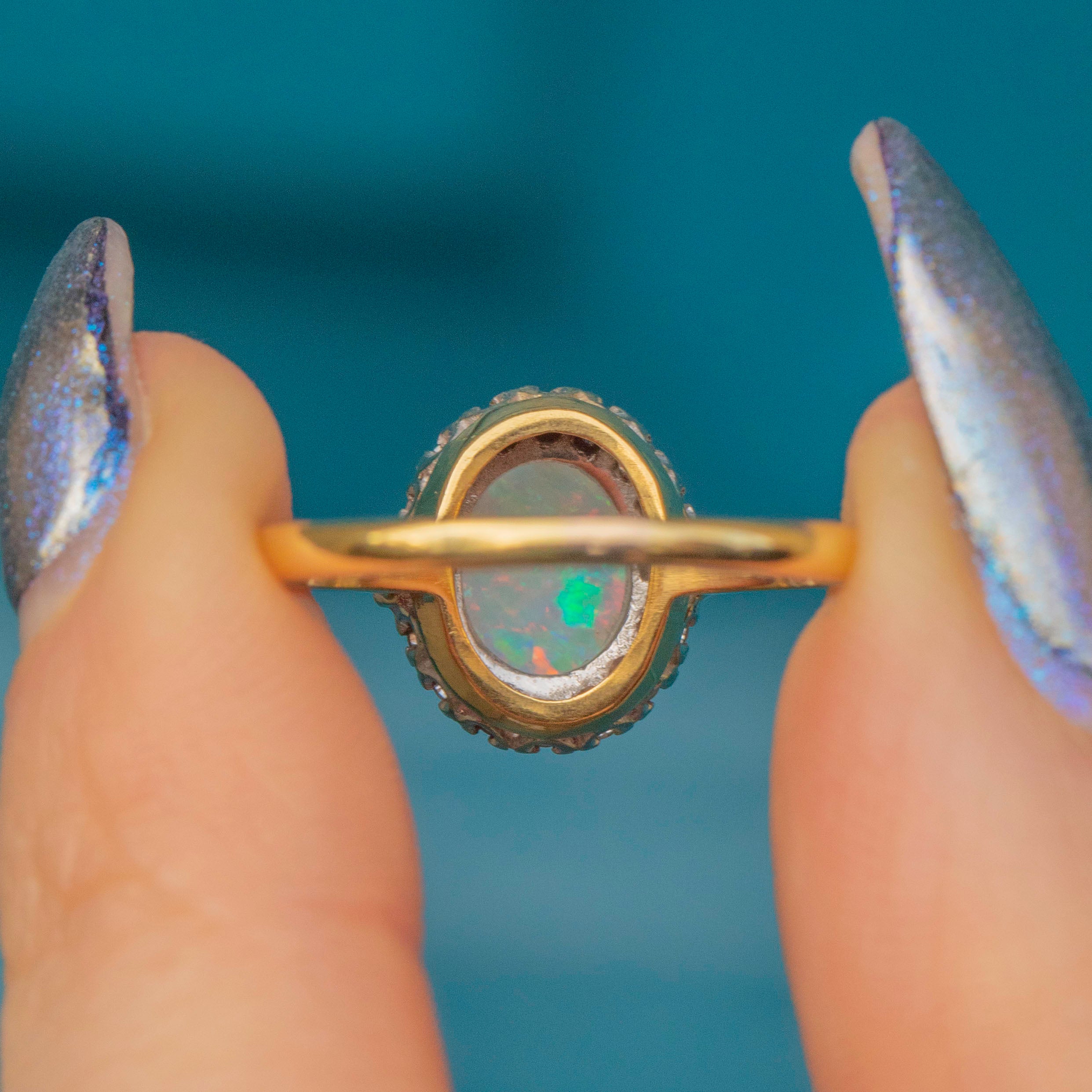 Prepare to have your breath taken away by the sheer beauty of this Art Deco 18ct Gold Opal Diamond cluster ring! One of the most vivid plays of colour we have ever laid eyes on, her natural solid Opal is akin to falling confetti as it catches the light, flaunting a spectrum of iridescent flashes which will never fail to amaze.