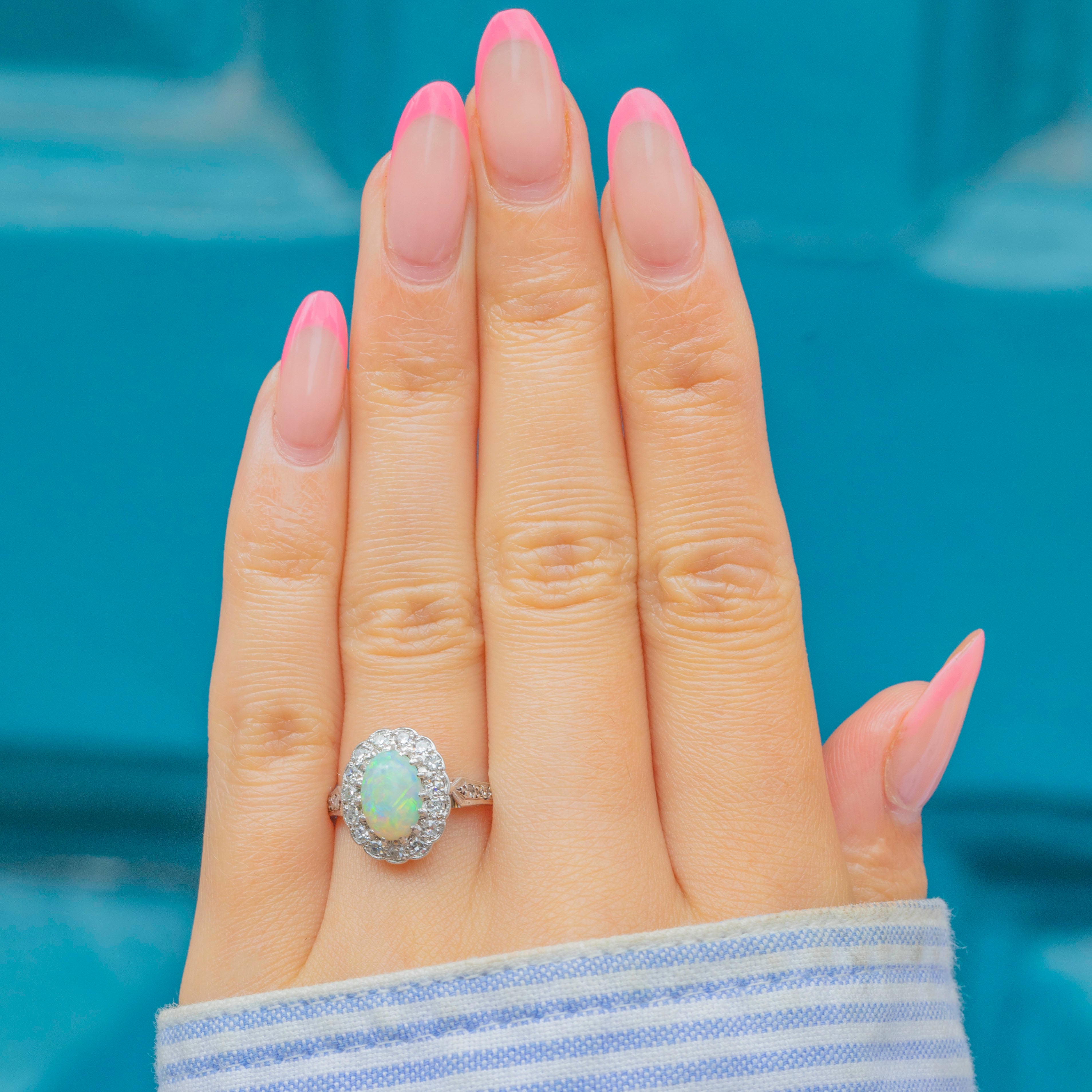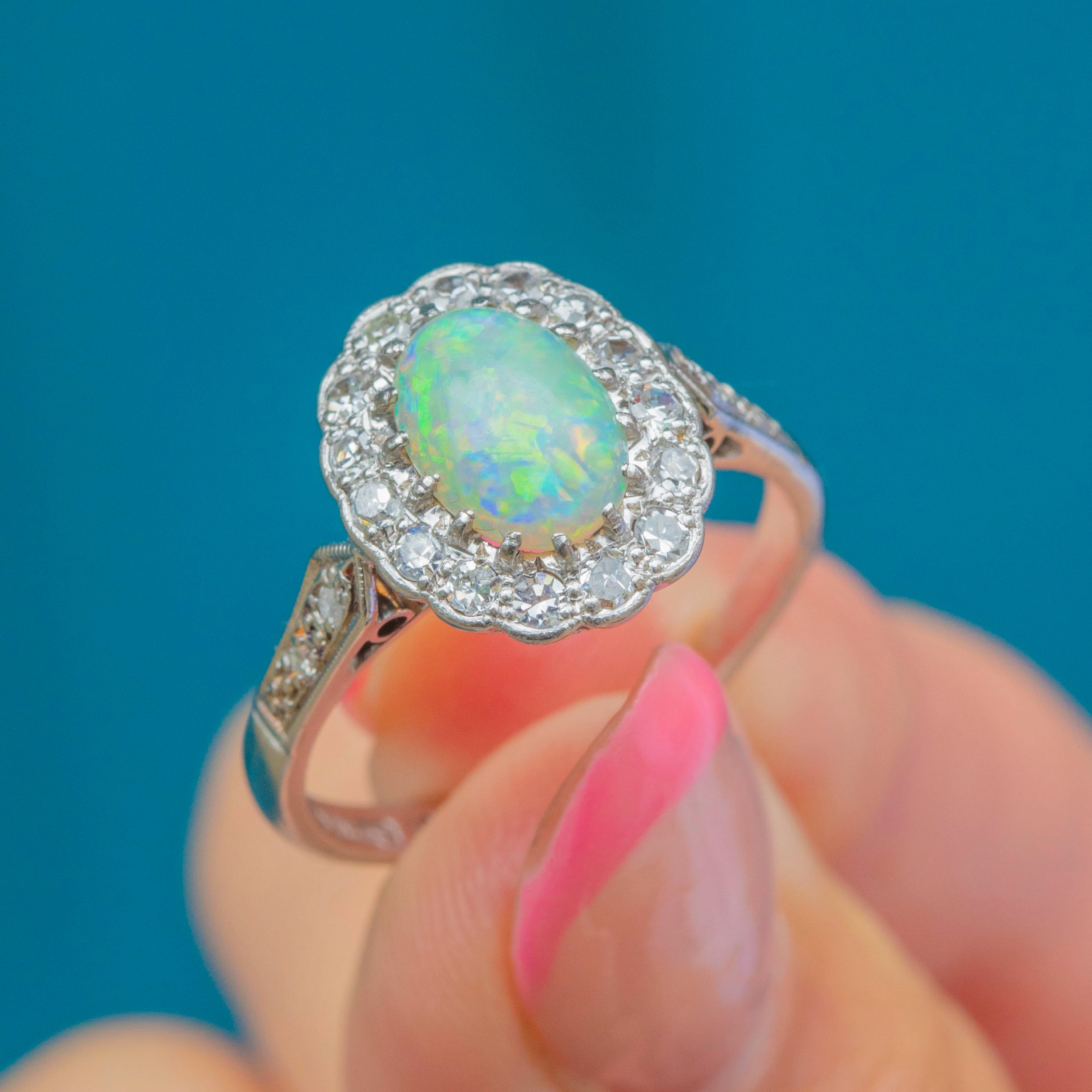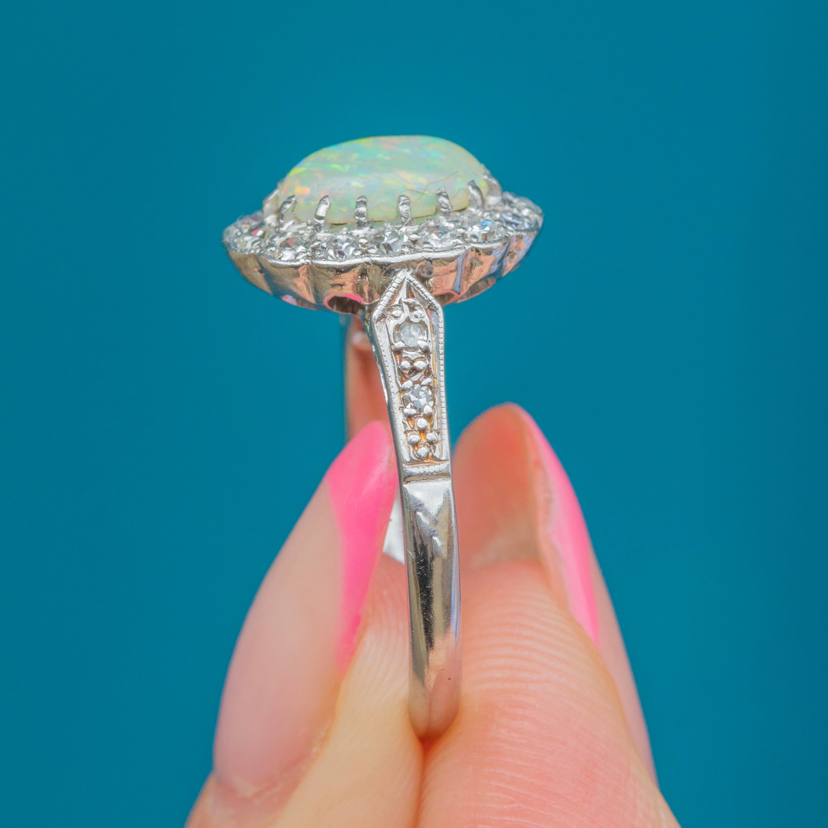 Prepare to have your breath taken away by the sheer beauty of this Art Deco 18ct White Gold Opal Diamond cluster ring! Her oval 0.70ct Opal cabochon is akin to a burst of confetti as it catches the light, flaunting a spectrum of iridescent flashes which will never fail to amaze.
