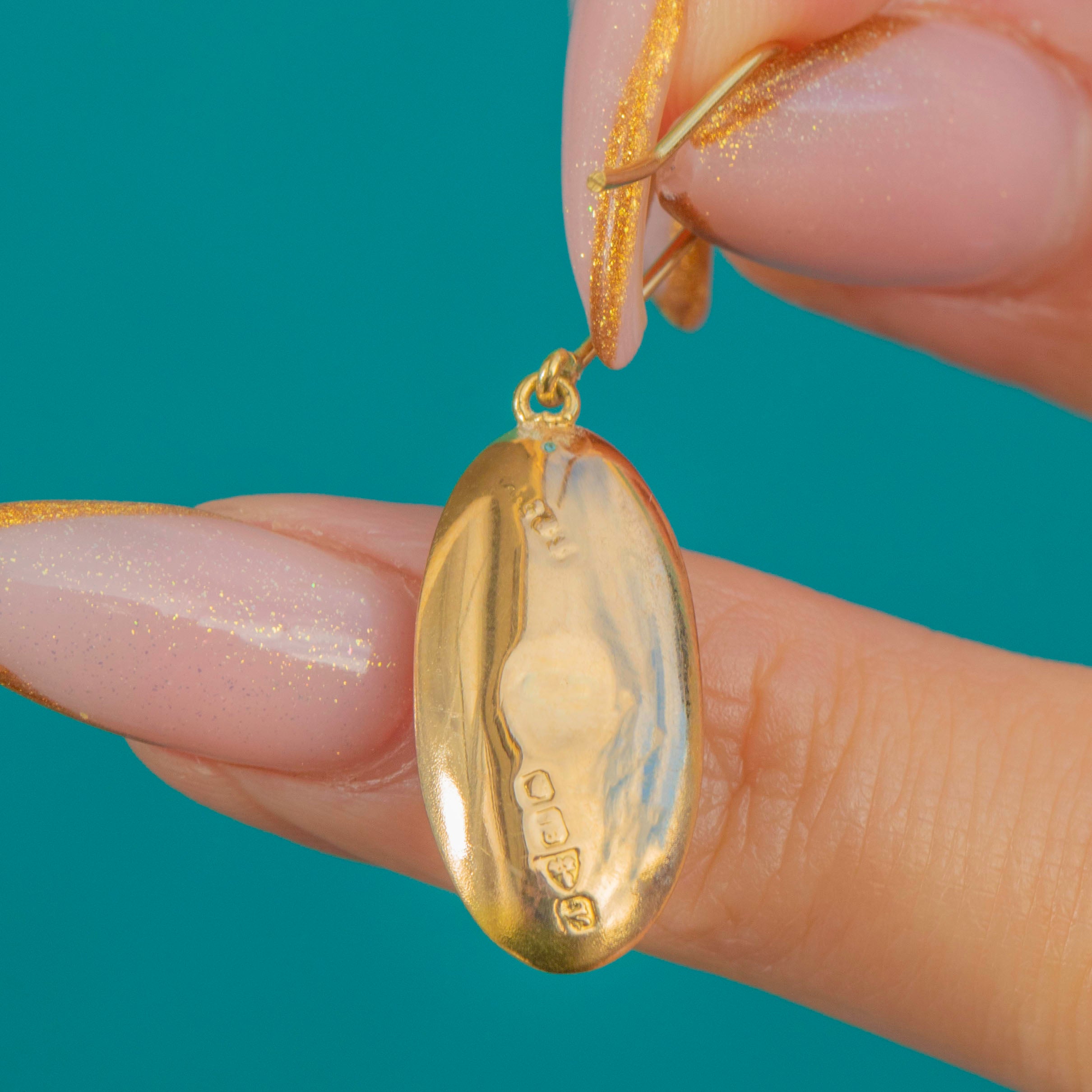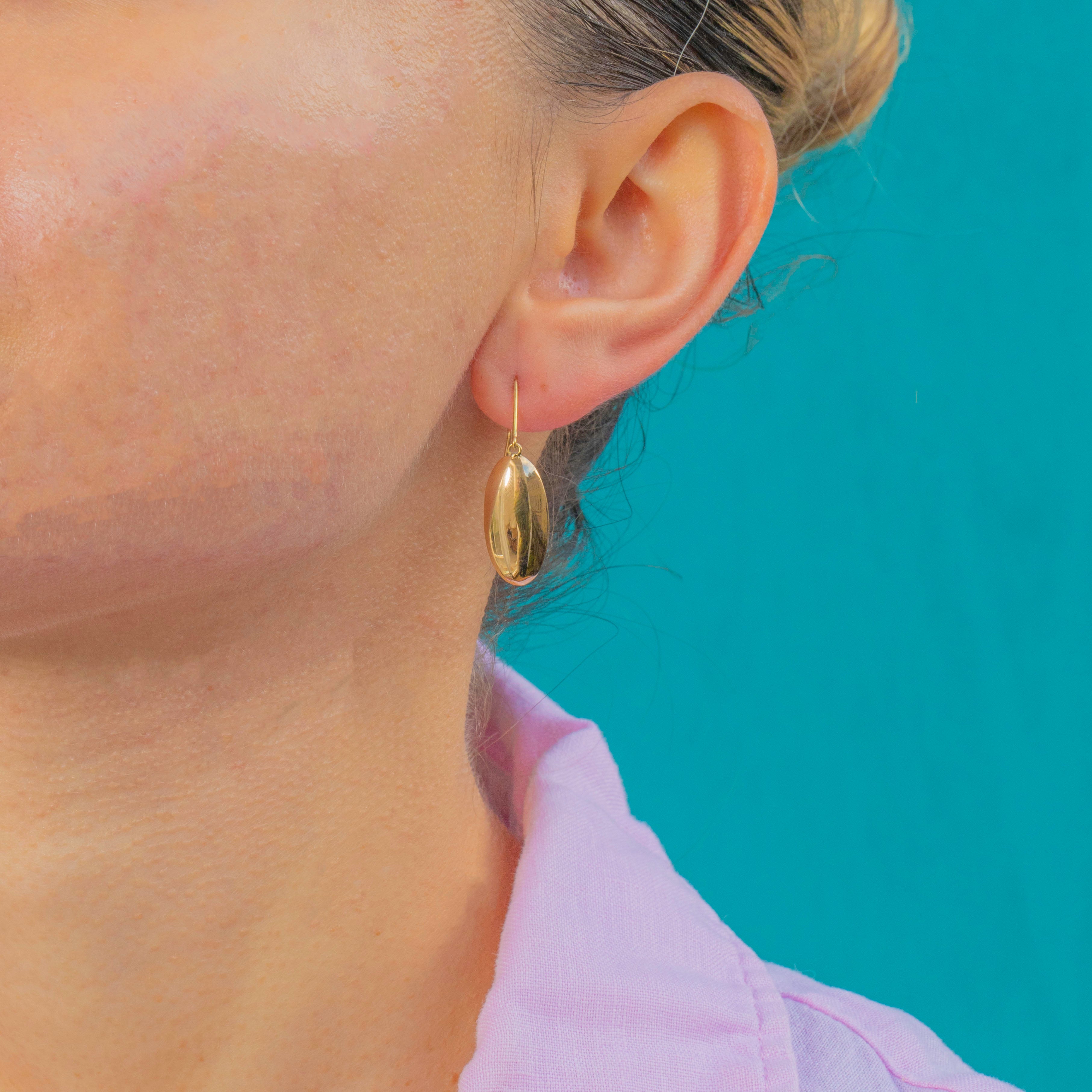 These Art Deco 18ct Gold oval drop earrings are a sleek and elegant pair, hallmarked for Chester 1921. The softly domed oval drops have a classic, understated silhouette that feels effortlessly refined on the ear.
