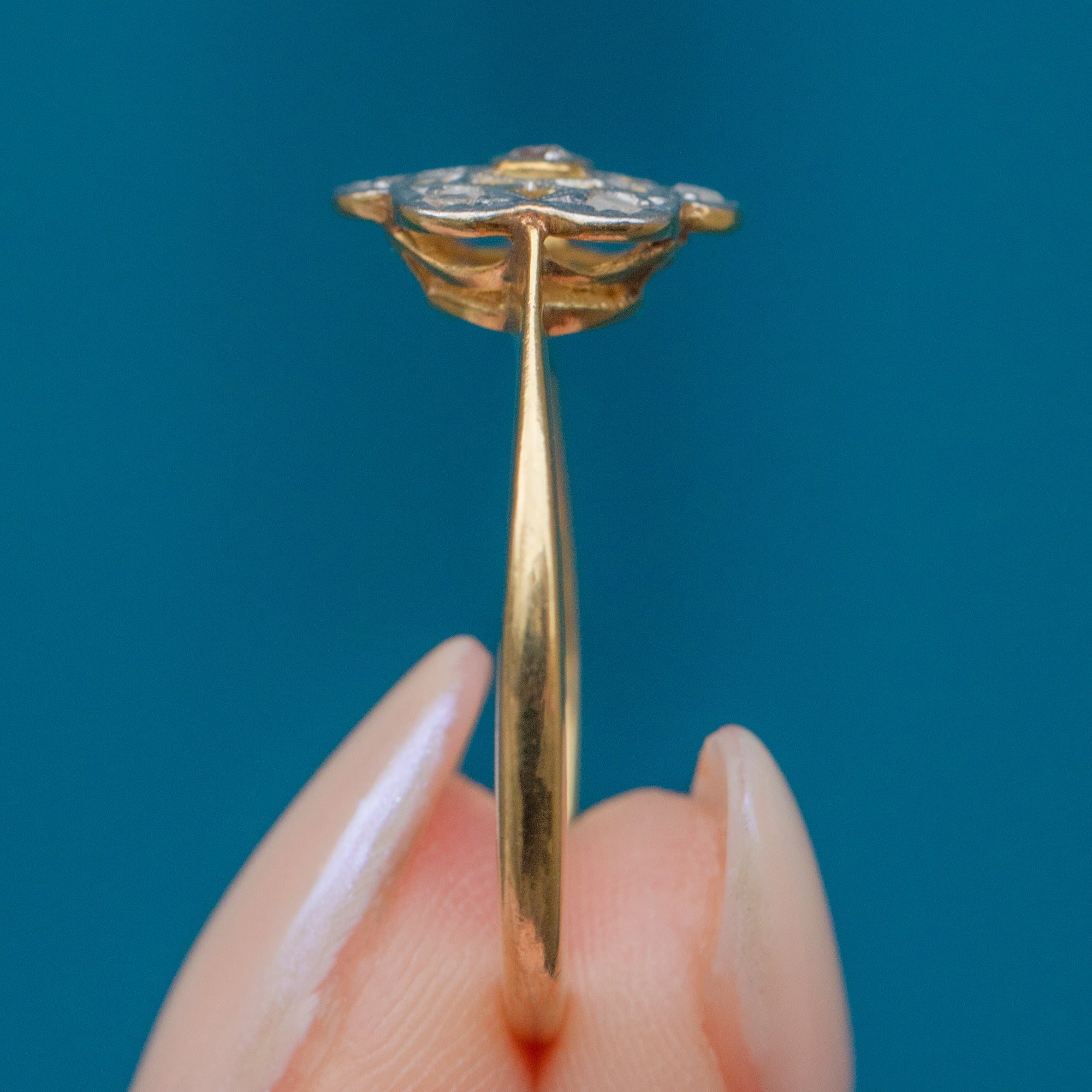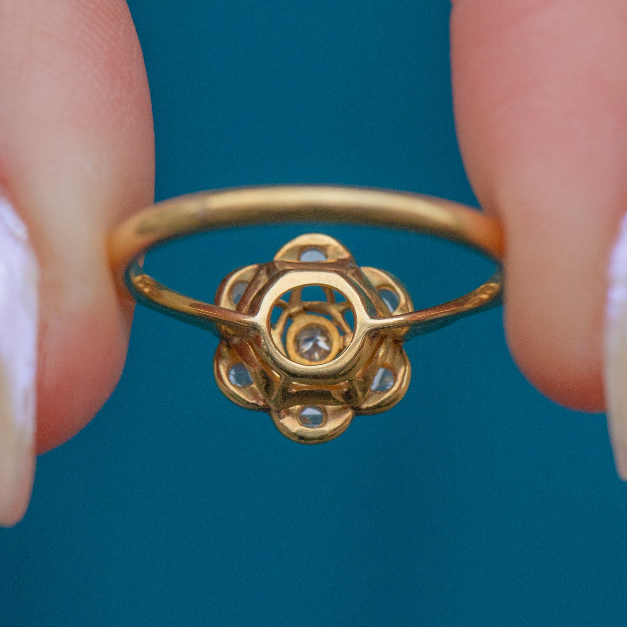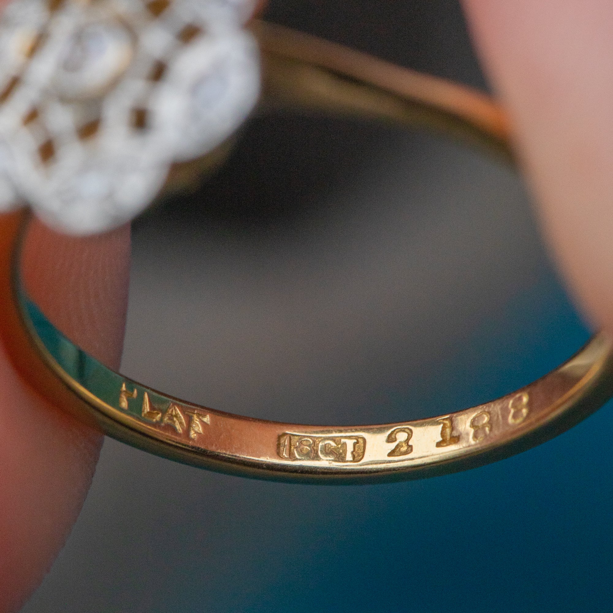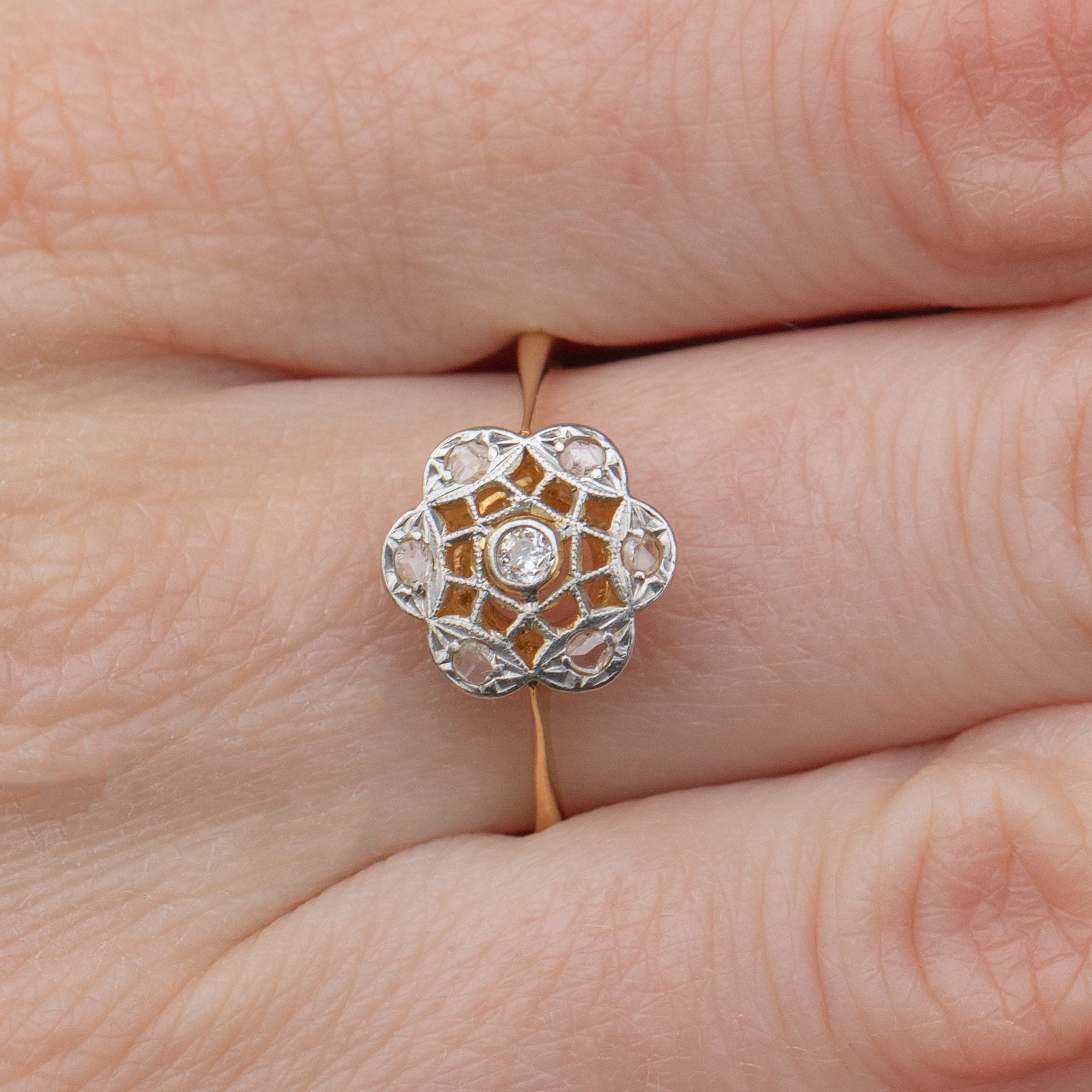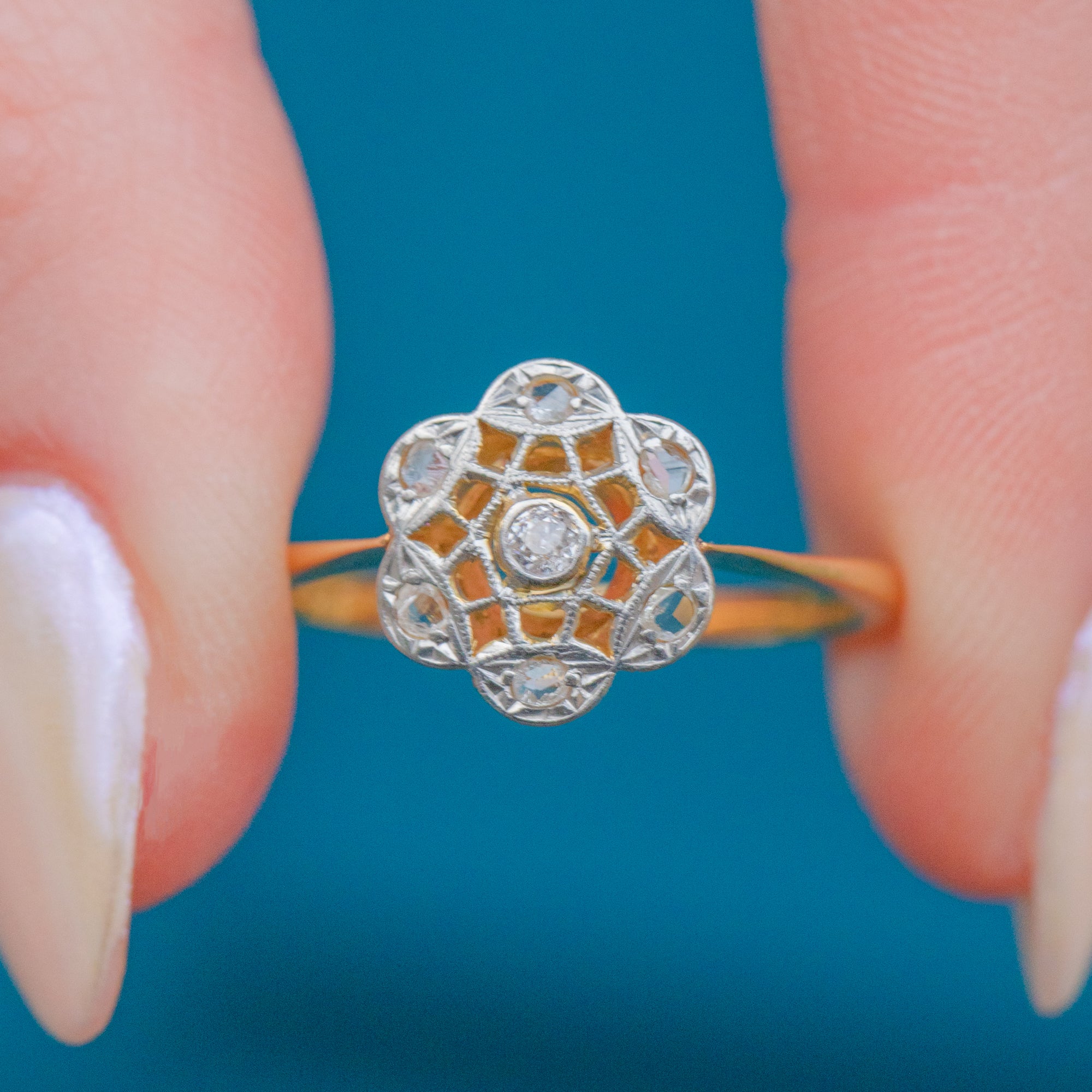EXCELLENT. This Art Deco 18ct Gold & Platinum Diamond openwork ring is in excellent condition. All of the Diamonds are securely set and each is free from damage of any kind. Her openwork Platinum settings are  stunning too, with her dainty flower keeping in pristine condition for nearly 100 years!