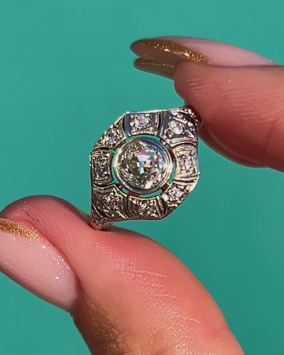 A glamorous Art Deco Diamond ring dating to circa 1930, crafted in luxurious 18ct Gold with refined Platinum settings. At the centre sits a sparkling Old Cut Diamond of approximately 0.50cts, beautifully bright with G–H colour and VS1–2 clarity. The geometric openwork shoulders are set with further rose-cut Diamonds totalling around 0.20cts, providing the ring with endless sparkle.