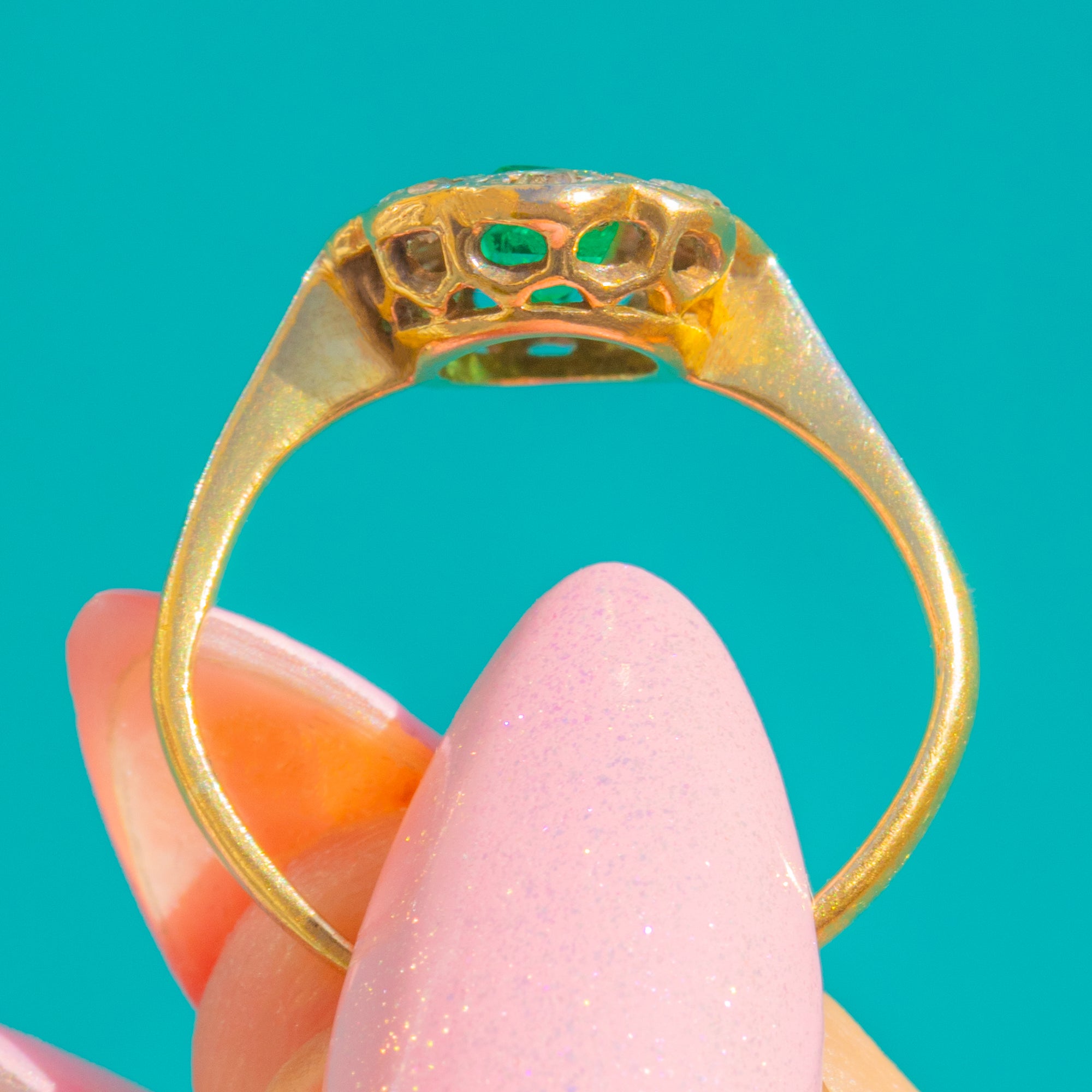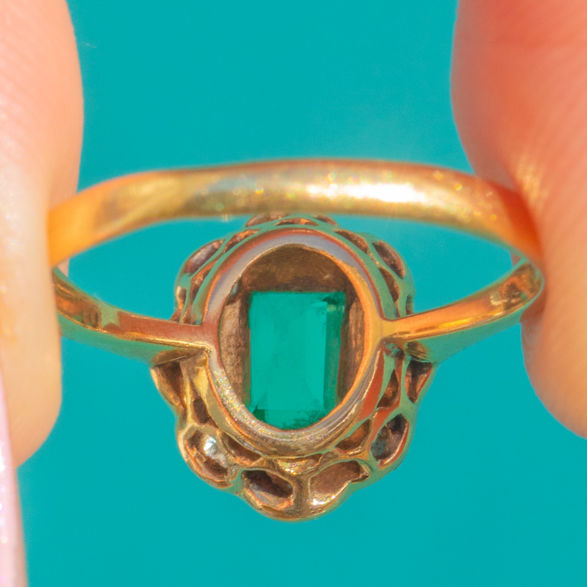 VERY GOOD: The Emerald and Diamonds are bright with no obvious chips or missing stones, showing light surface wear commensurate with age. The Platinum-topped settings and milgrain retain crisp detail with gentle patina, and all stones appear secure. The 18ct Gold shank is slightly out of round with a faint inner seam suggestive of past sizing, remaining strong and ready to wear.