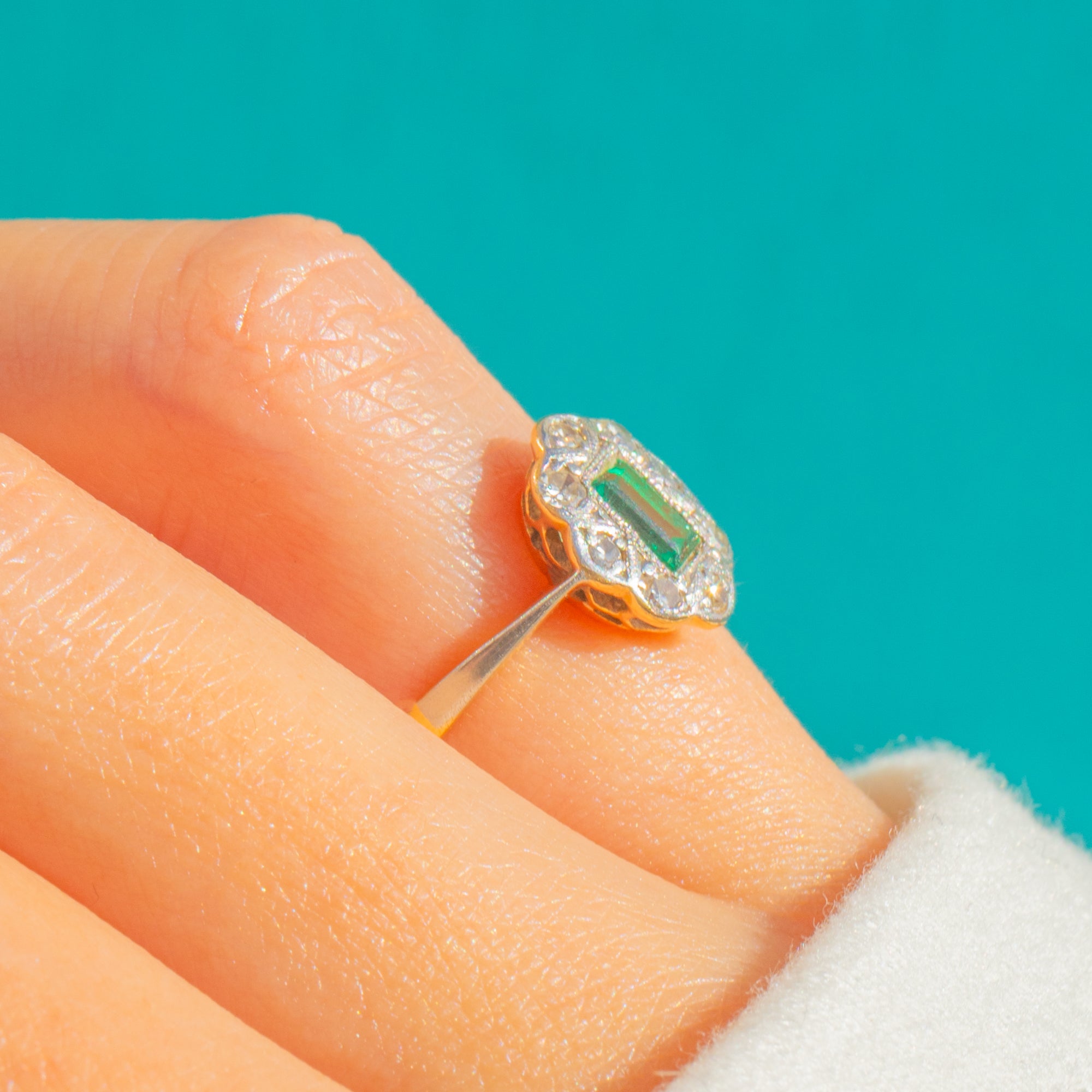 A refined Art Deco cluster ring, crafted in a chic two‑tone palette of Platinum and 18ct Gold. At its heart sits a rectangular step‑cut Emerald framed by delicate milgrain, encircled by a scalloped halo of bright Diamonds for a timeless flourish. The low‑profile head and slim yellow Gold shank make this piece as comfortable as it is elegant.