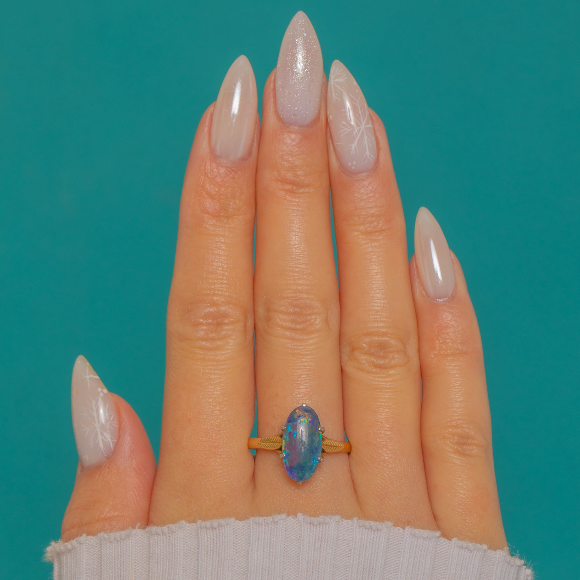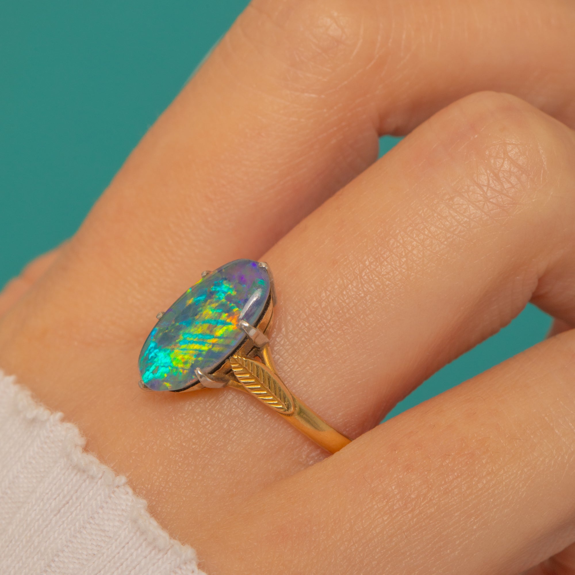An elegant two-tone solitaire from the Art Deco era, this ring showcases an elongated oval Opal triplet glowing with vivid play-of-colour—electric blues and teals with flashes of purple, red and gold—held proudly in Platinum claws above a rich 18ct Gold shank. The shoulders are beautifully detailed with crisp foliate and fluted motifs, splitting into delicate, pierced elements that lead the eye to the luminous cabochon.
