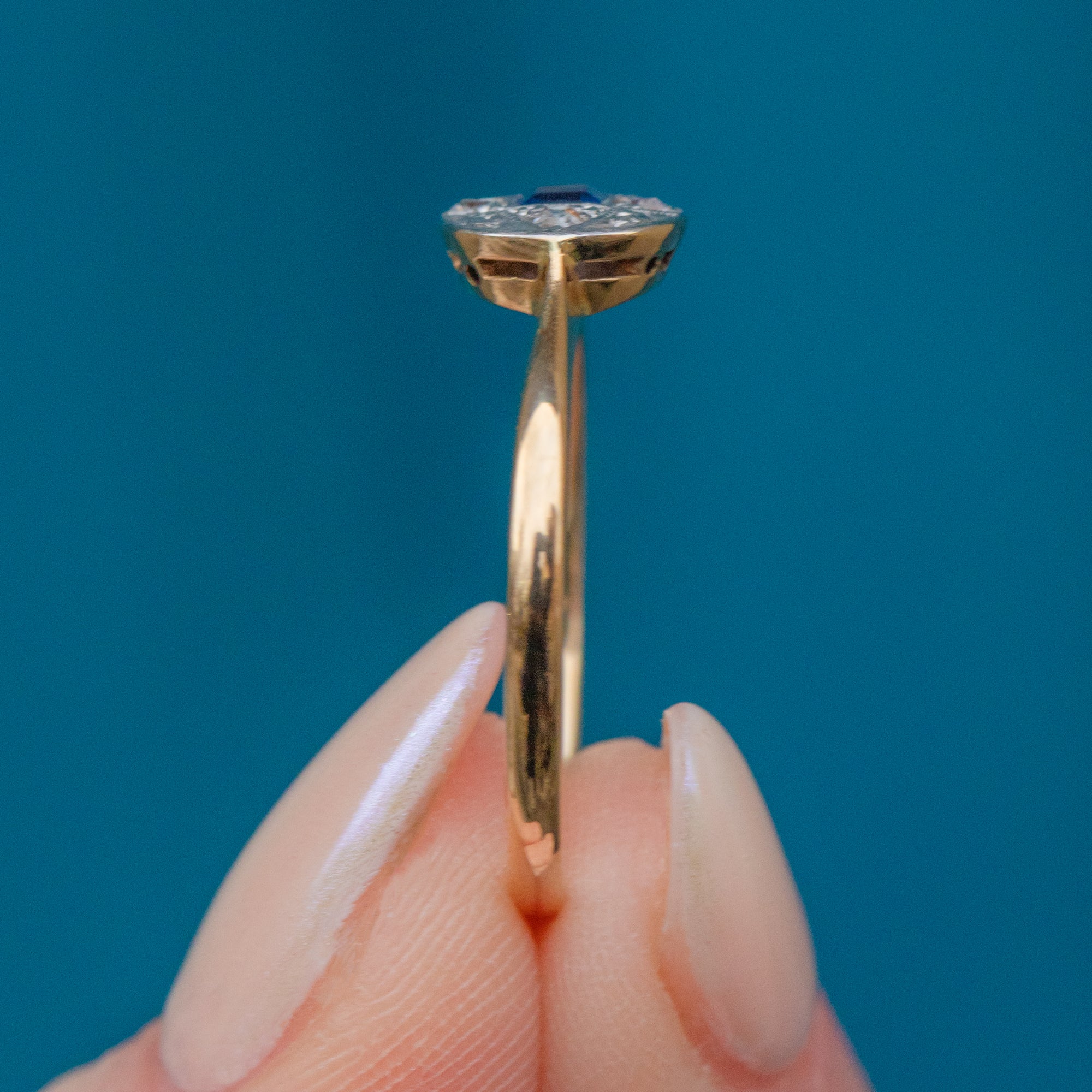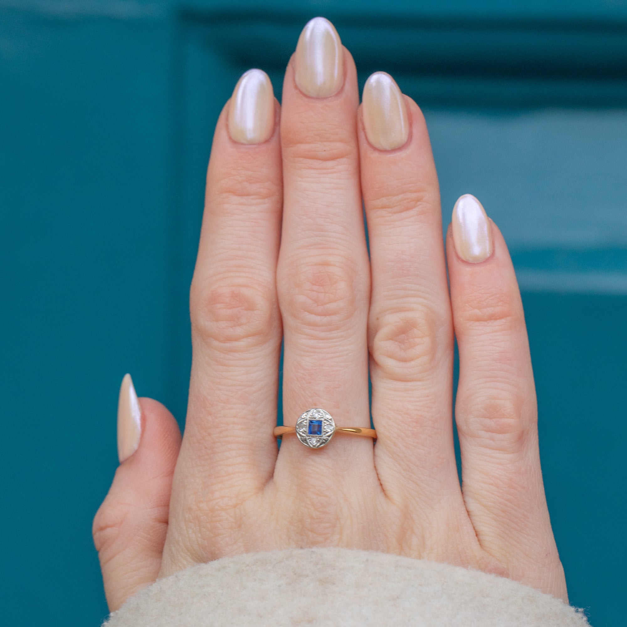 The ideal candidate for an engagement ring, this ring has been set with a blue Sapphire and twinkling Diamonds in a quintessentially Art Deco design.