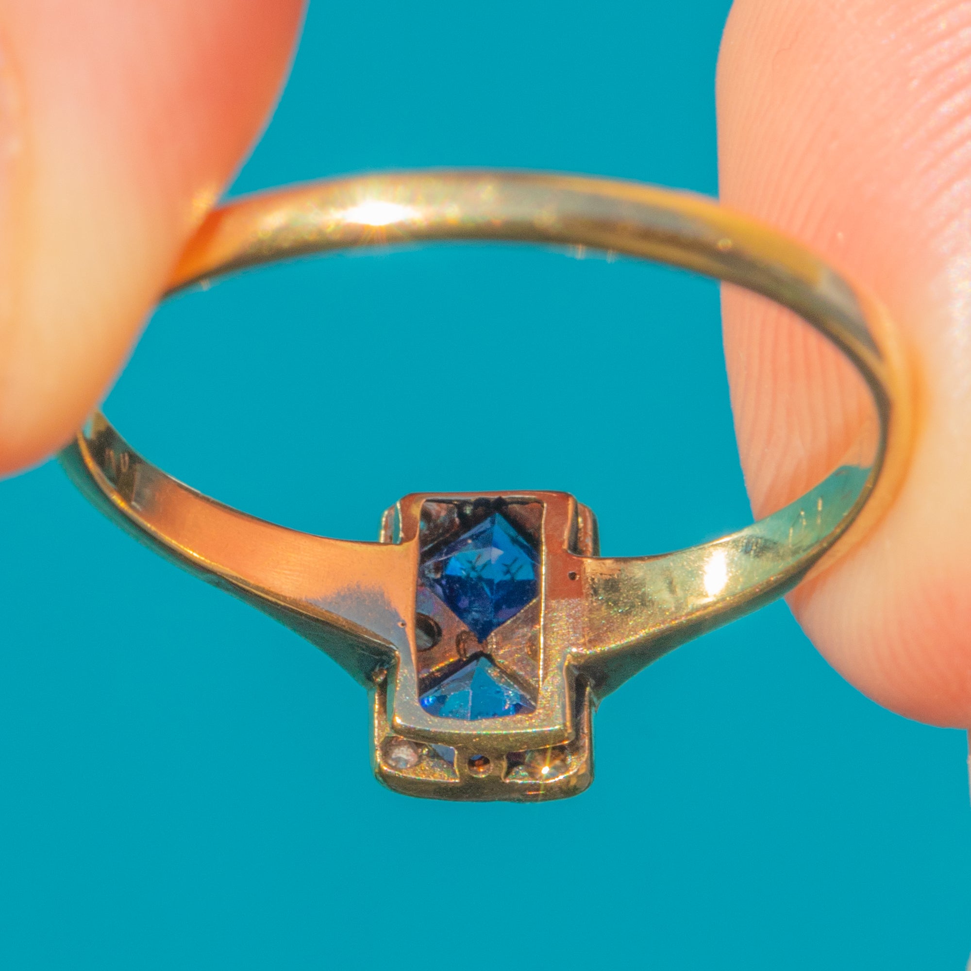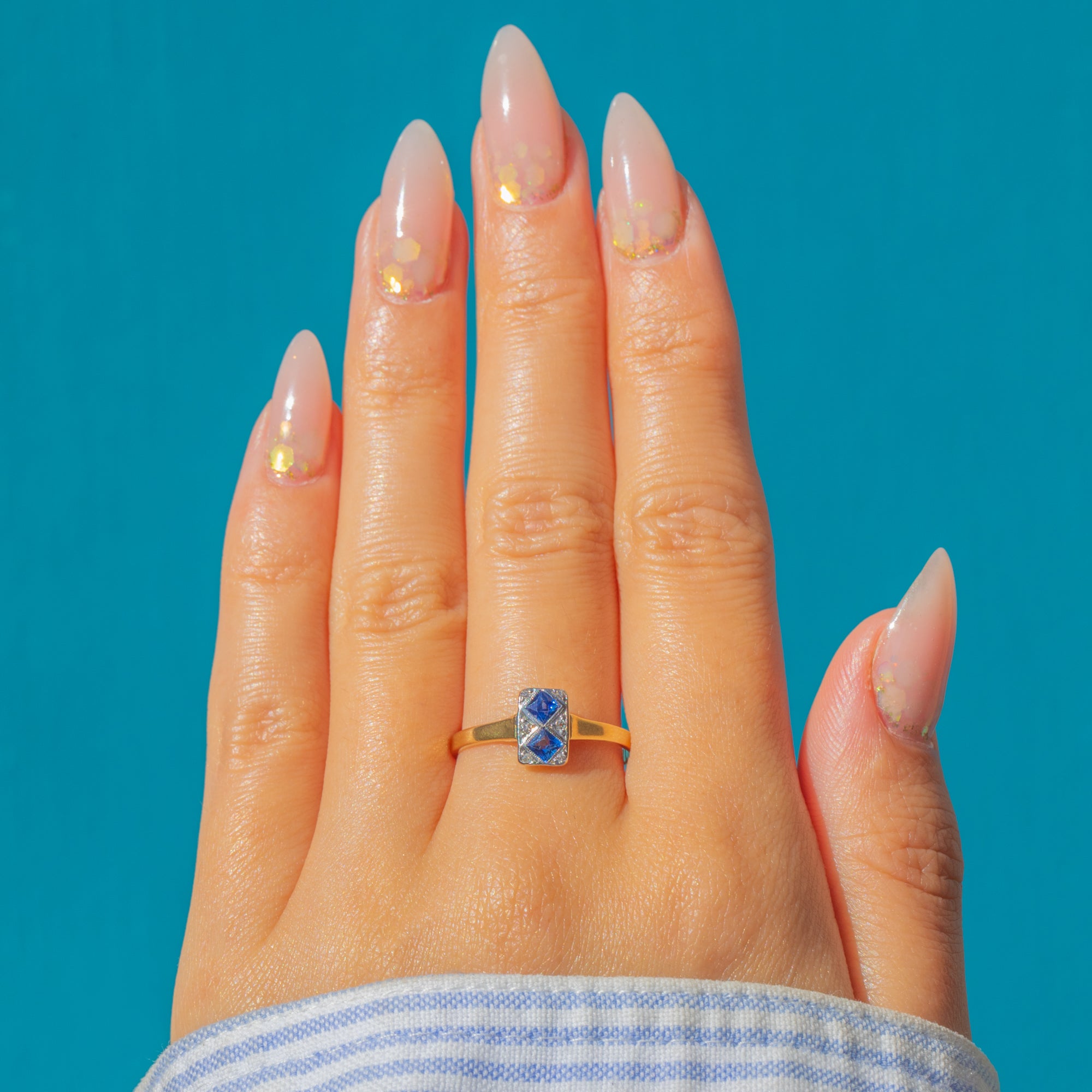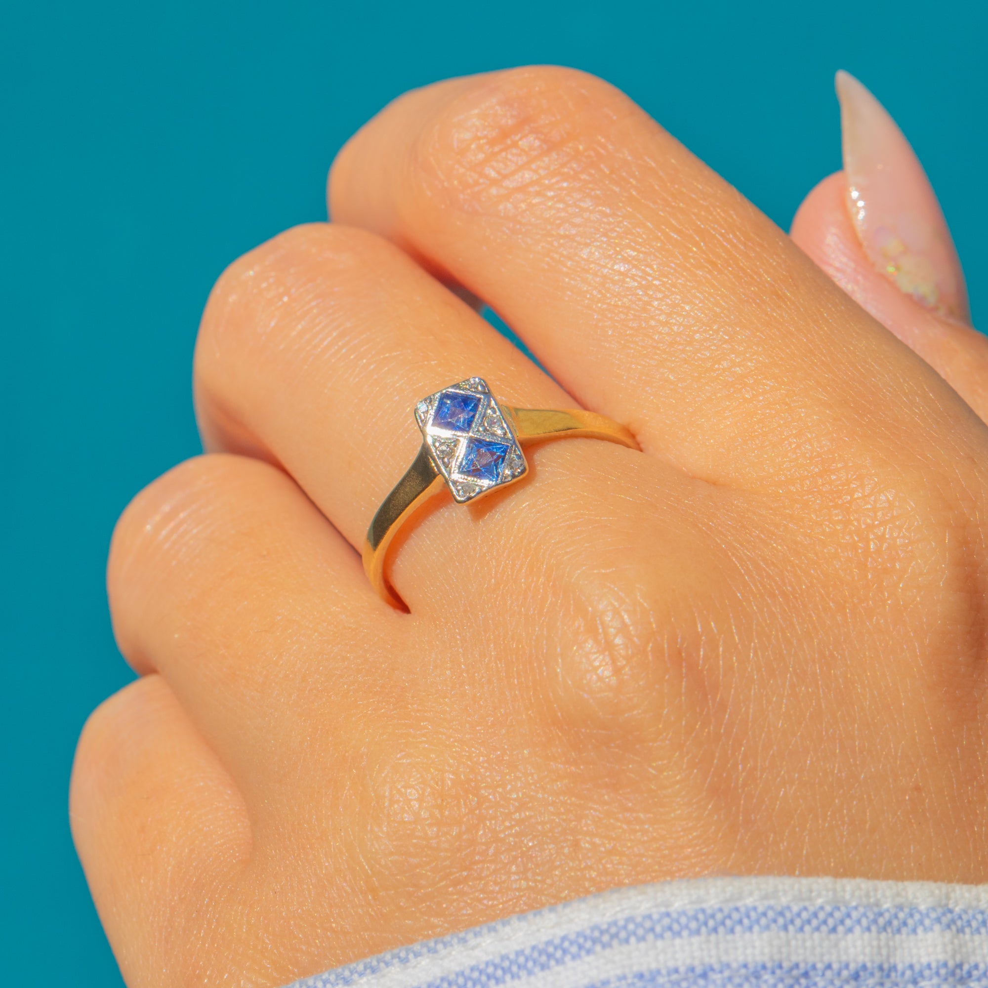 This original Art Deco ring from the 1920s is a stunning example of early 20th-century design. Crafted in 18ct Yellow Gold with a Platinum ring face, it is set with two natural French-cut Sapphires of a rich royal blue, framed by dainty twinkling Diamonds for added sparkle.