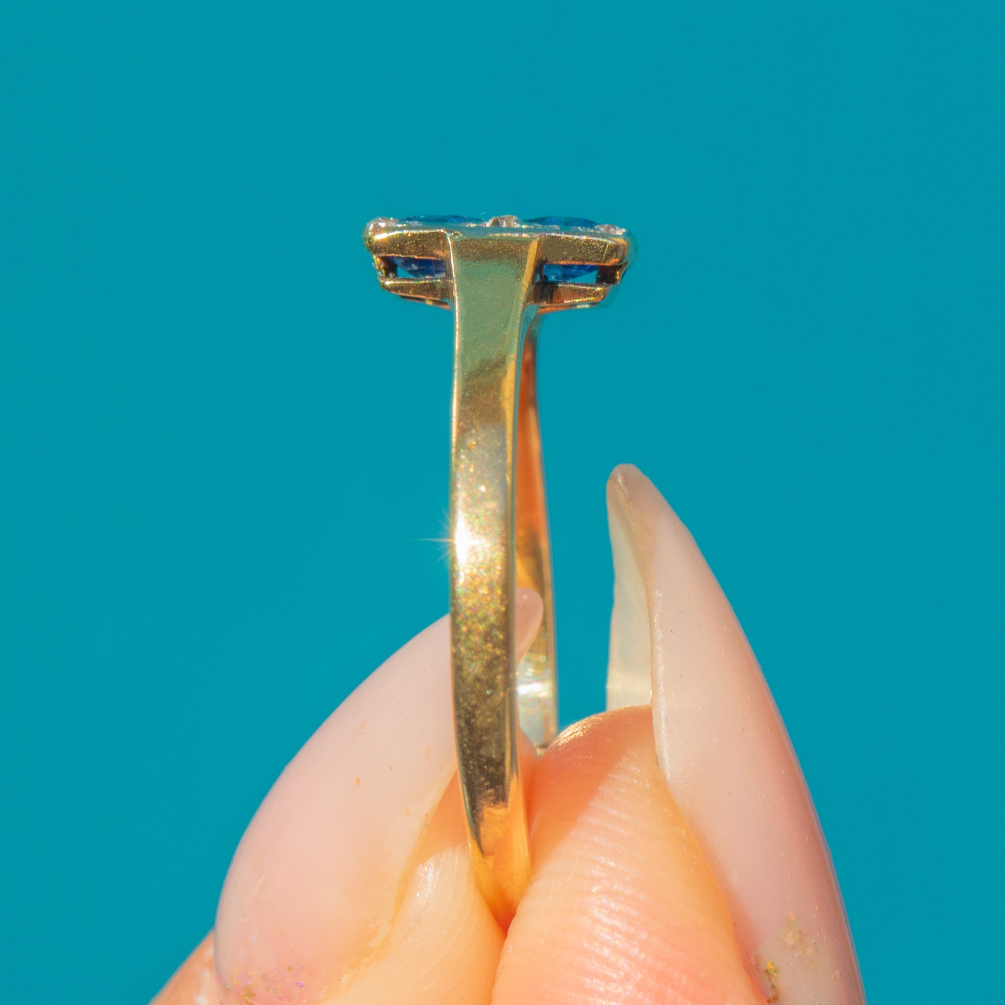 The crisp geometric design of the rectangular head captures the essence of the Art Deco period, combining bold colour with clean lines and symmetry. The neat stamps “18CT” and “FINE PLAT” add further charm and authenticity to this piece. A fabulous ring with a striking splash of blue, perfect for adding antique character to any collection.