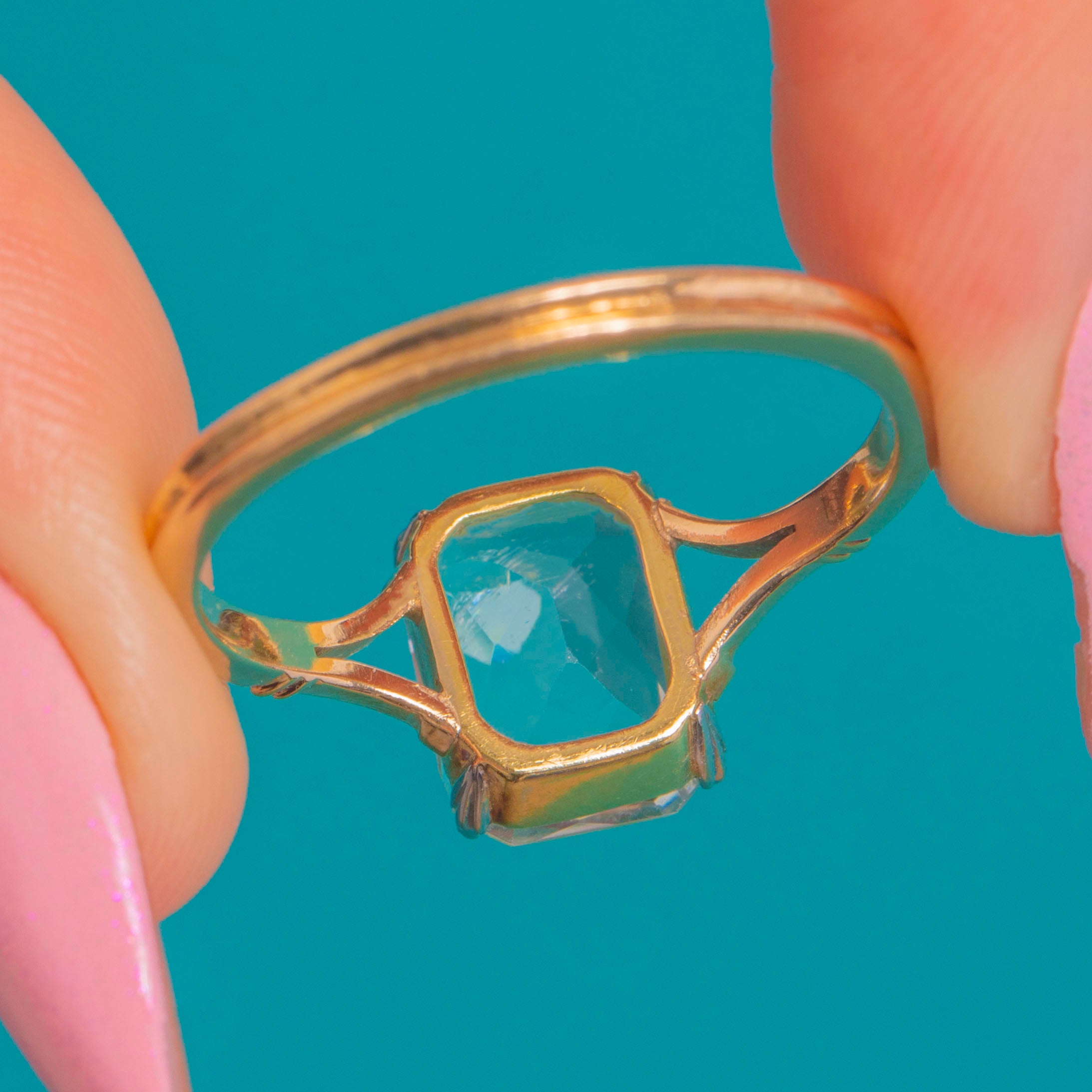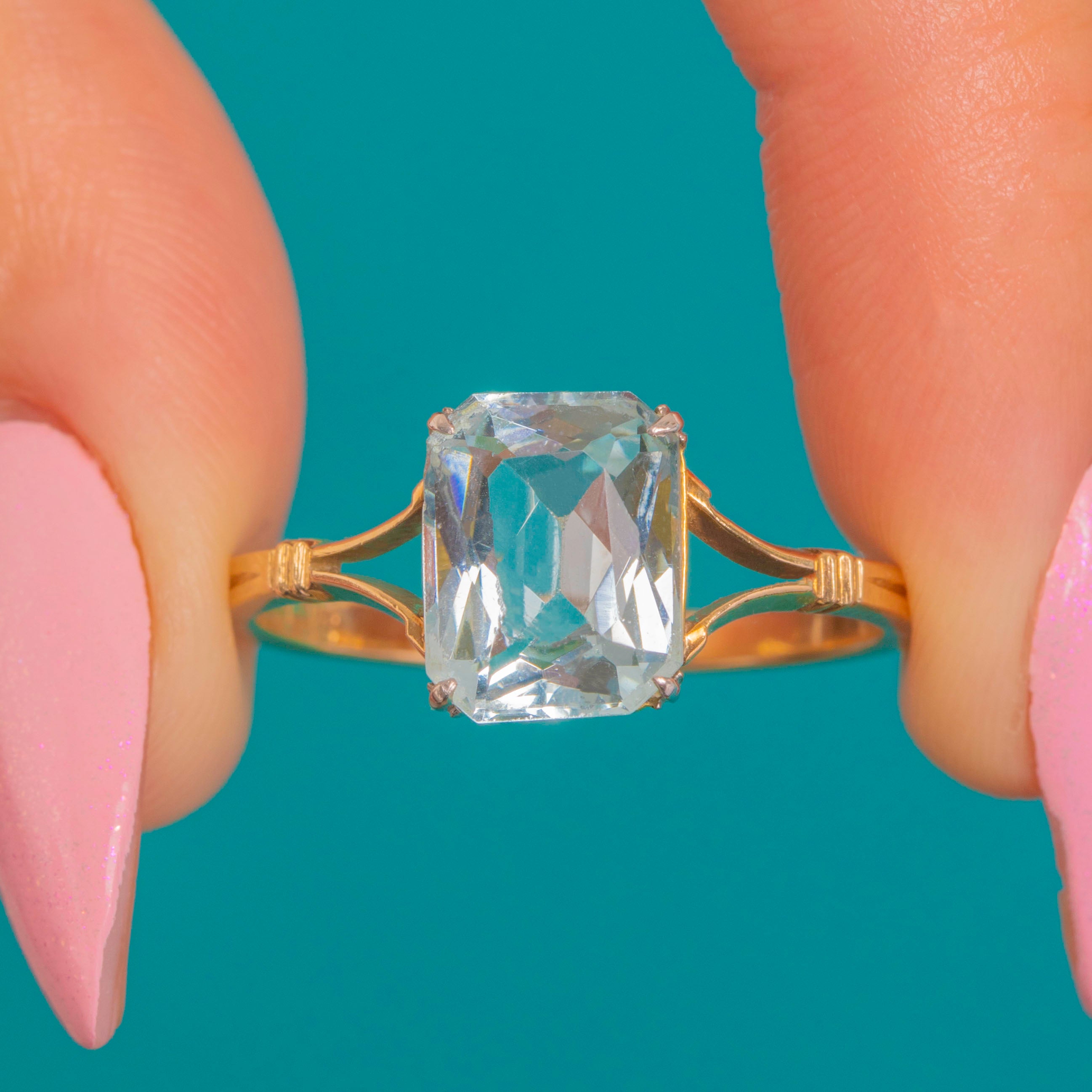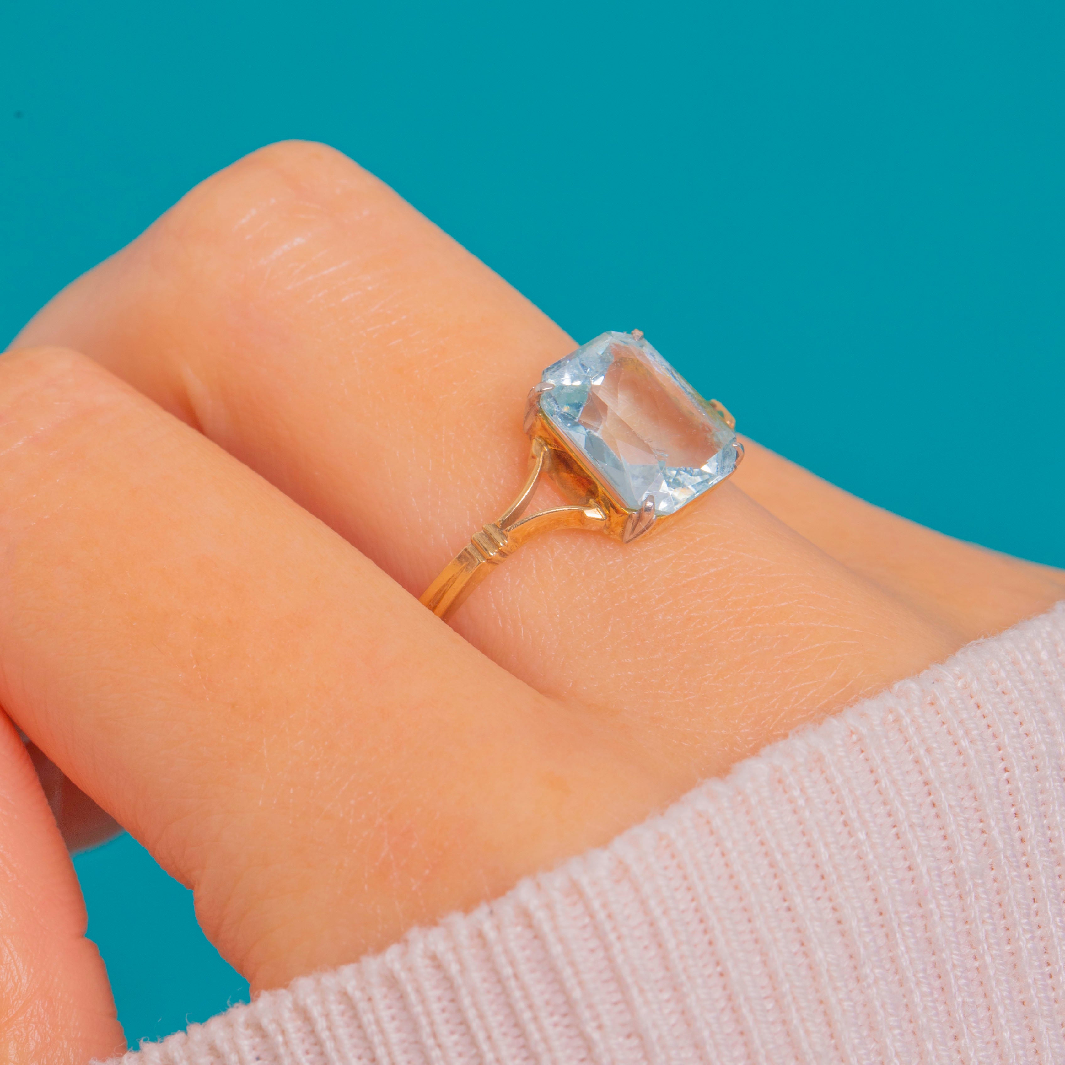A luminous 4.70ct Aquamarine takes centre stage in this Art Deco solitaire. The emerald-cut gem shows a serene, icy blue, held in a white Platinum claw head with an open gallery that lets the light pour through. A slender 9ct Gold shank with split, tapered shoulders and subtle ribbed detailing draws the eye to the crisp rectangular table.