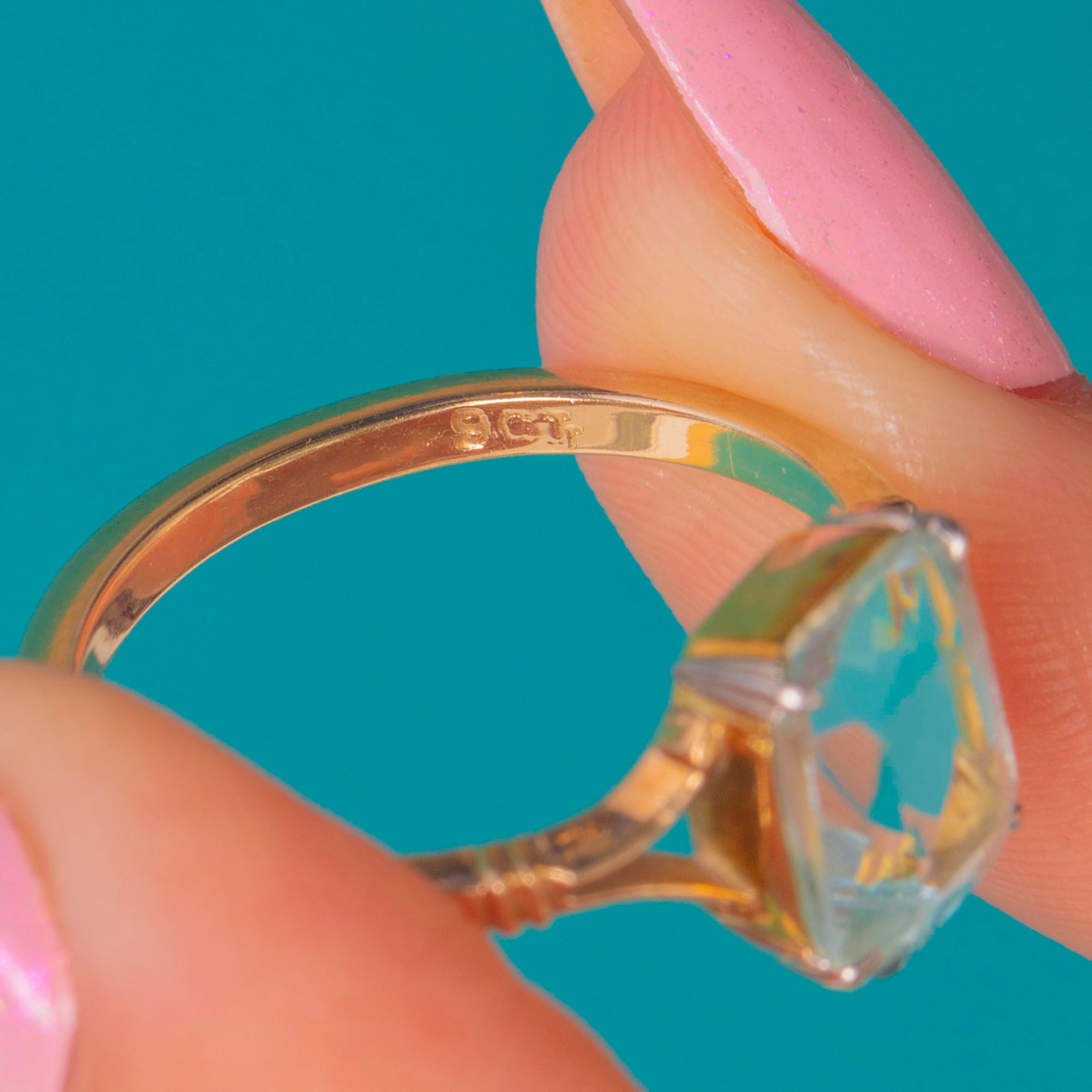 GOOD: The Aquamarine presents cleanly and is securely set, with no obvious chips and only light wear commensurate with age. The 9ct Gold shank shows light surface scratches and polish marks; the Platinum claws are intact and hold the stone well. No visible resizing or restoration marks.
