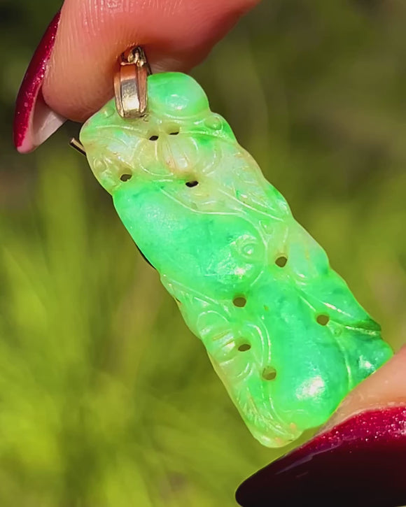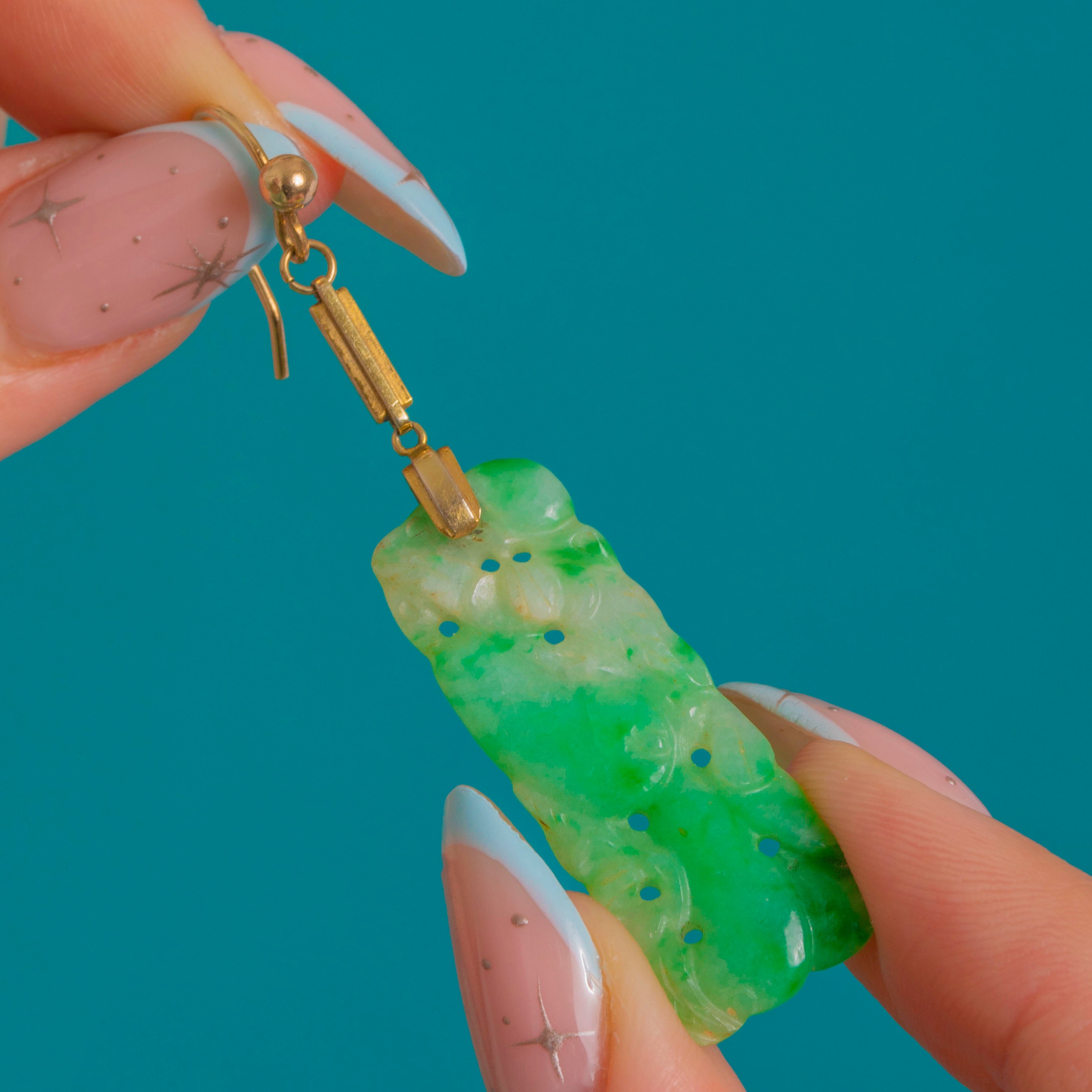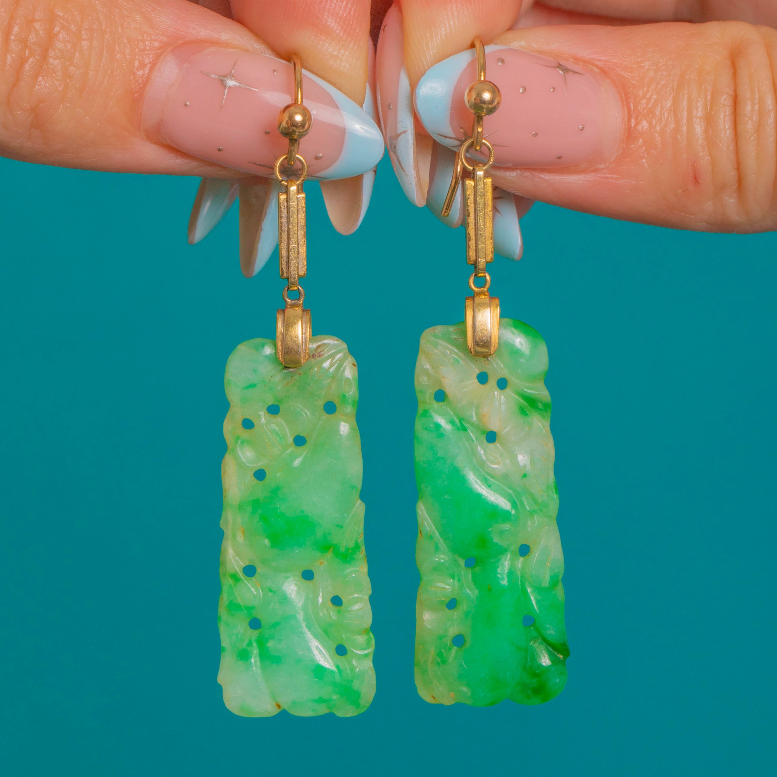 Sculptural, serene and unmistakably elegant, these Art Deco drop earrings showcase elongated plaques of carved green Jade suspended from refined 9ct Gold fittings. The Jade glows with soft translucency and natural mottling, its low-relief foliate and scrolling details delicately pierced with circular apertures for a light, airy feel.