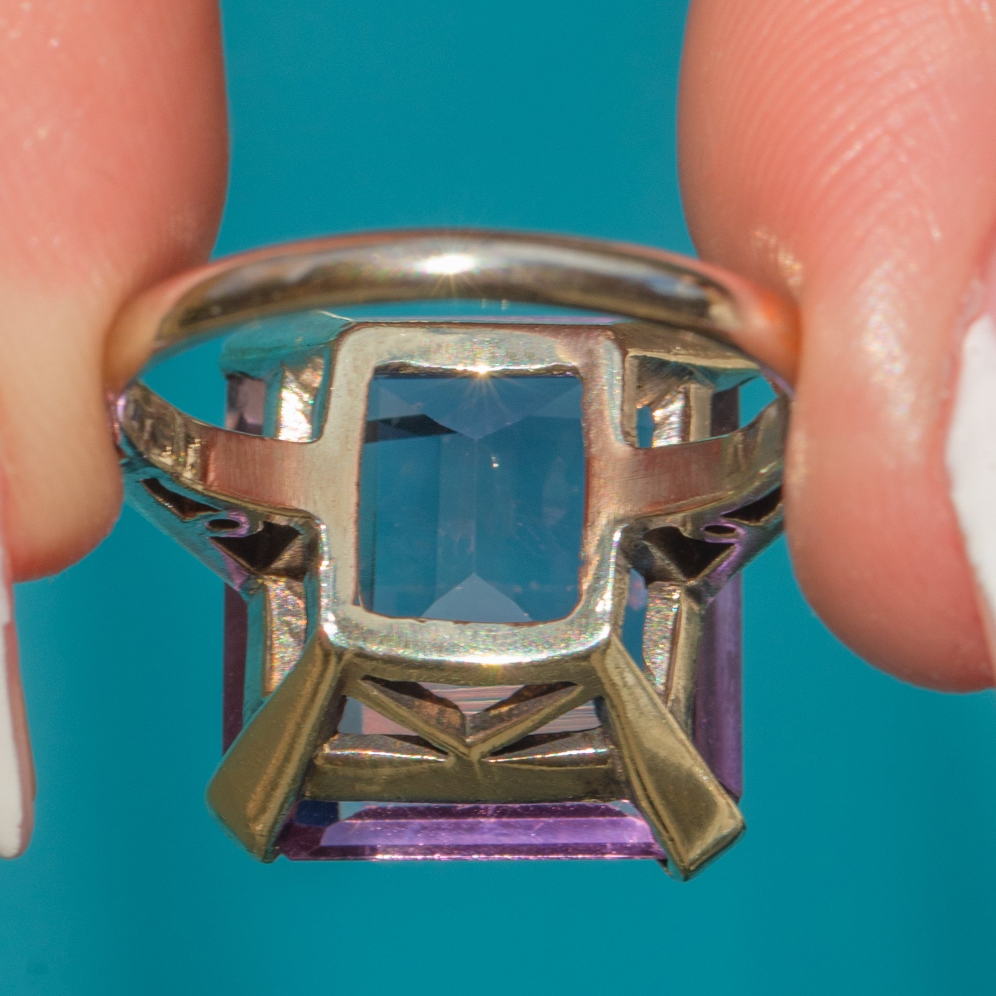 This striking Art Deco cocktail ring features a bold emerald-cut Amethyst measuring an impressive 15.7 x 14mm and weighing approximately 3.75cts. Its vibrant purple hue and precise geometric facets are perfectly complemented by the clean lines of the White 9ct Gold setting.