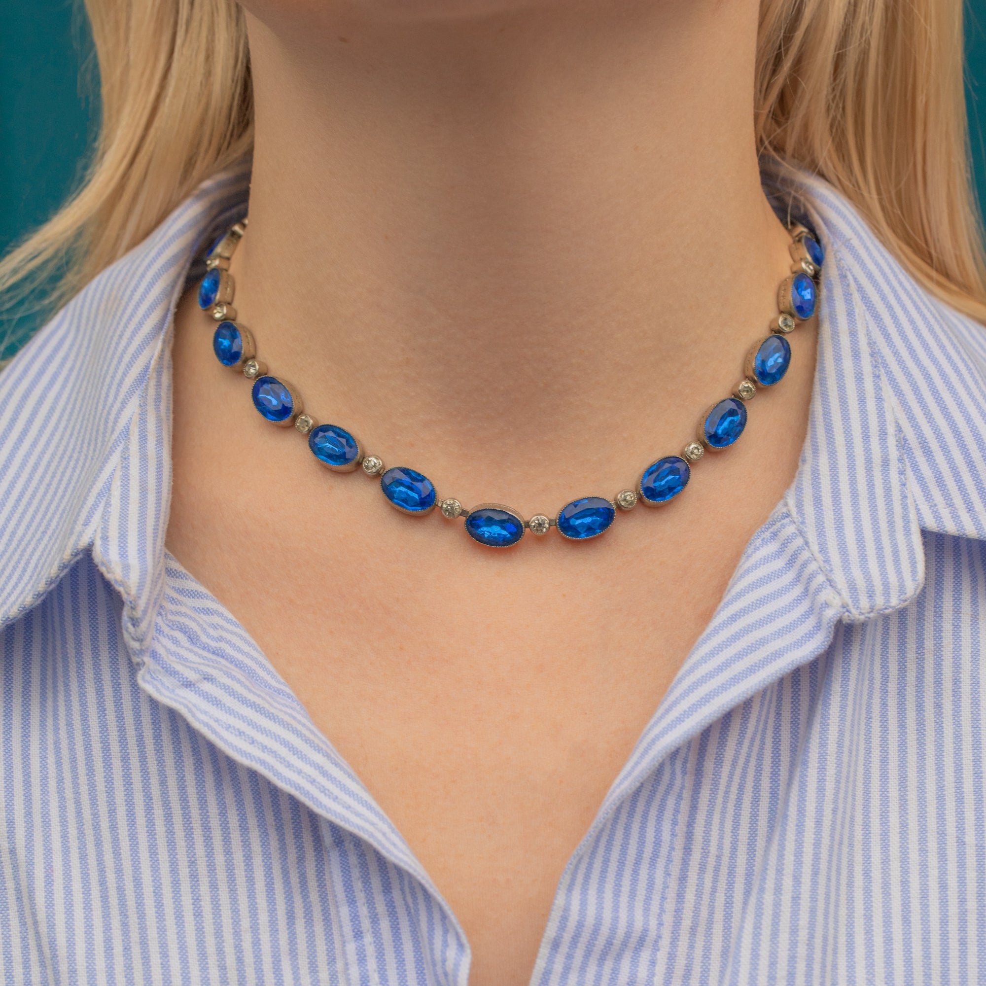 Capturing the glamour of the Art Deco period, this Paste necklace features twenty-two dazzling Blue Paste stones, radiating rich cerulean and indigo hues. These are effortlessly complimented by her alternating White Paste stones, radiating a crisp scintillation.