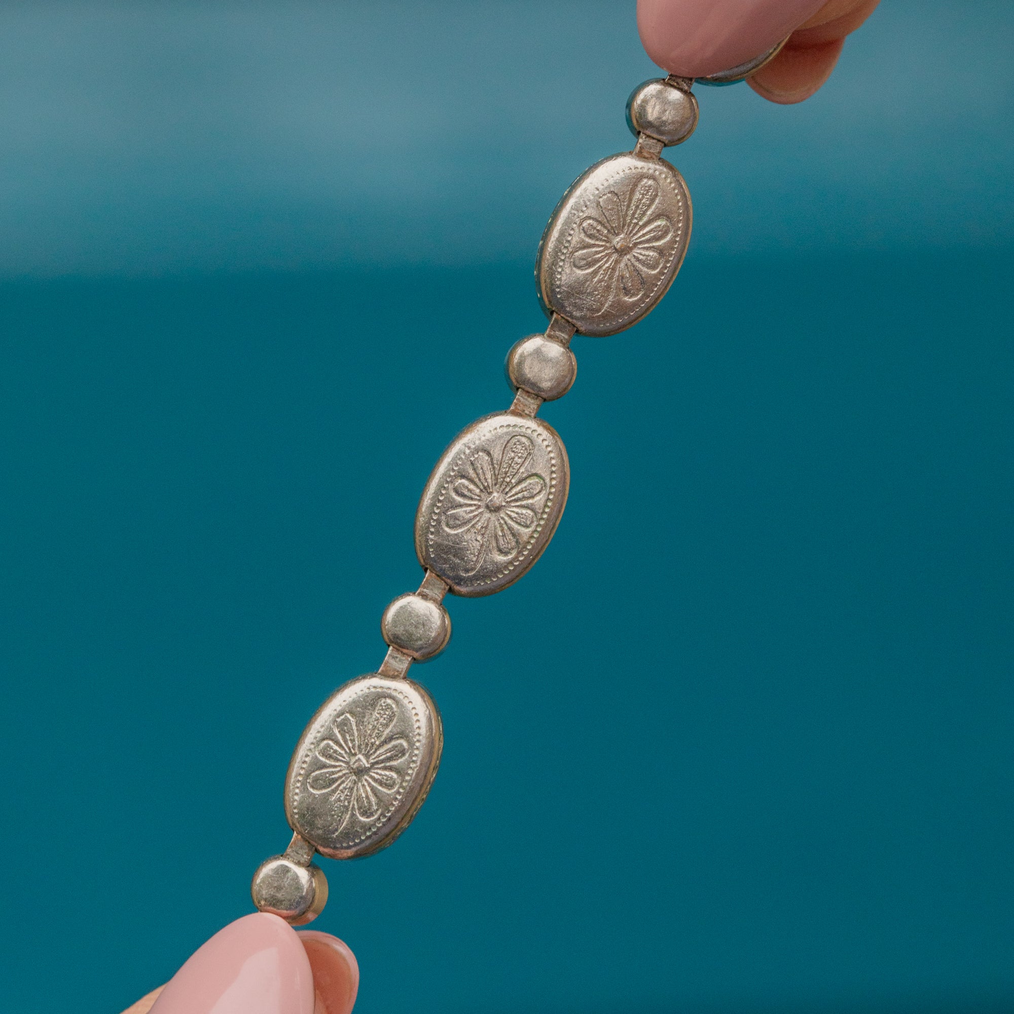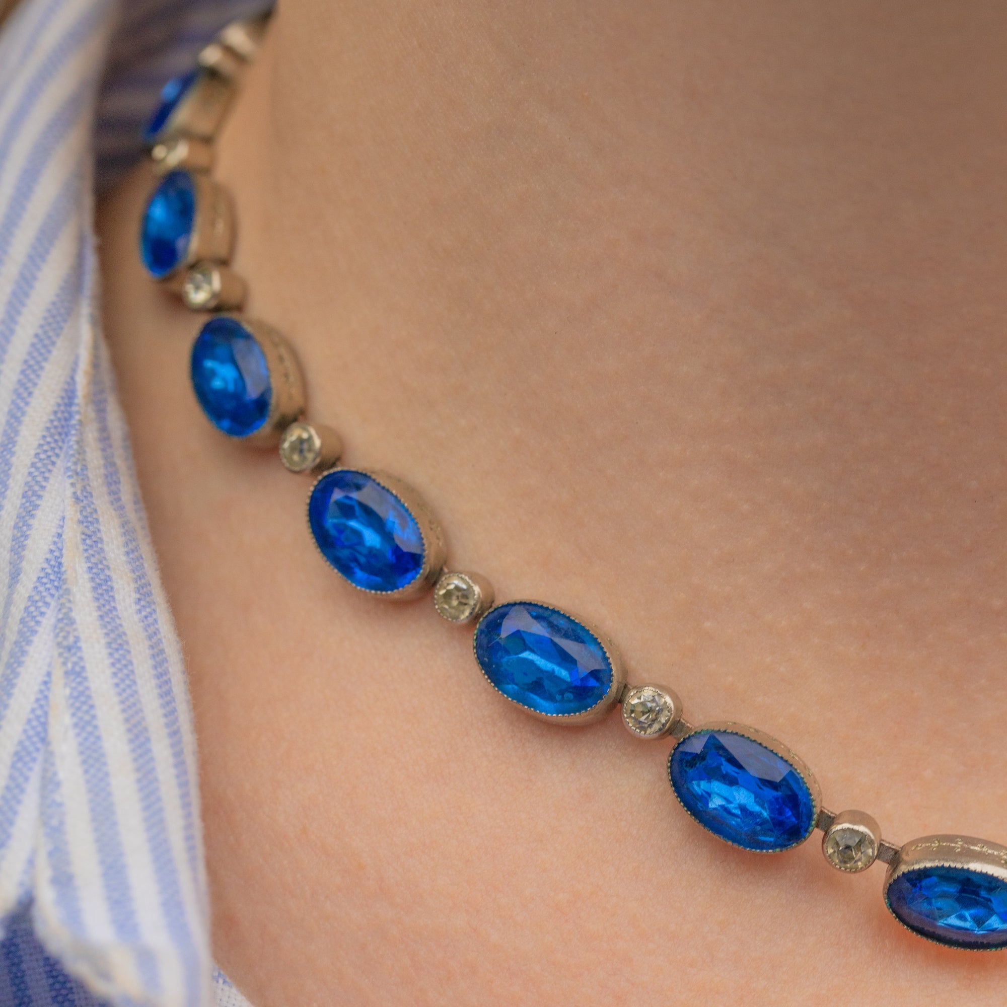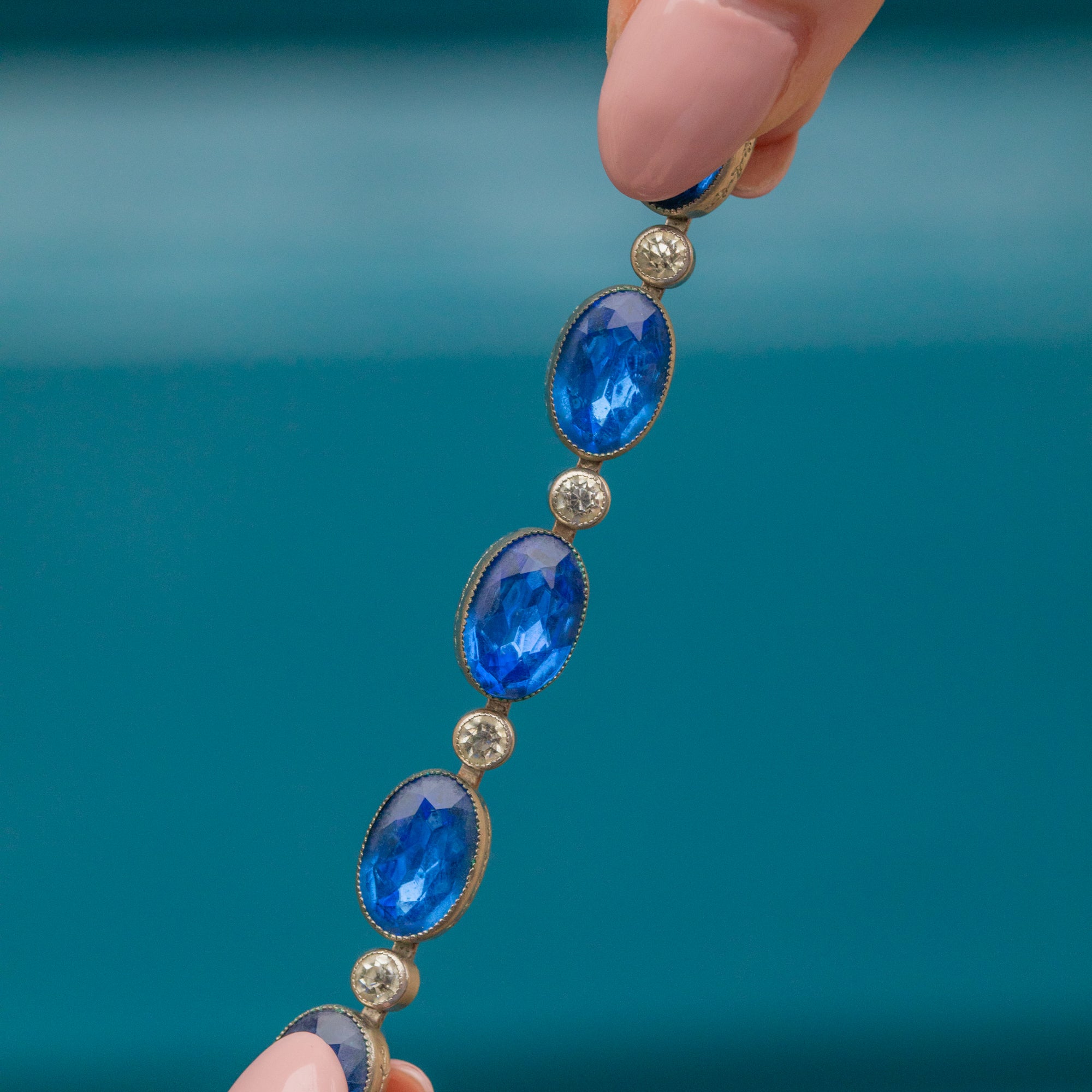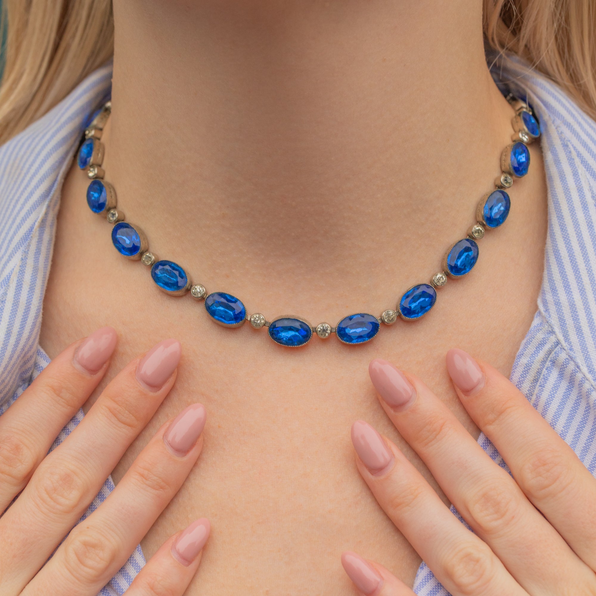 EXCELLENT. This Art Deco Blue Paste necklace is in excellent condition. Her Paste stones are vibrant and dazzling, free from nibbles or scuffs, and sit securely within their settings. Her links are uniform and secure, allowing for confident and comfortable wear. In such great condition, she is a must-have addition to any antique jewellery collection!