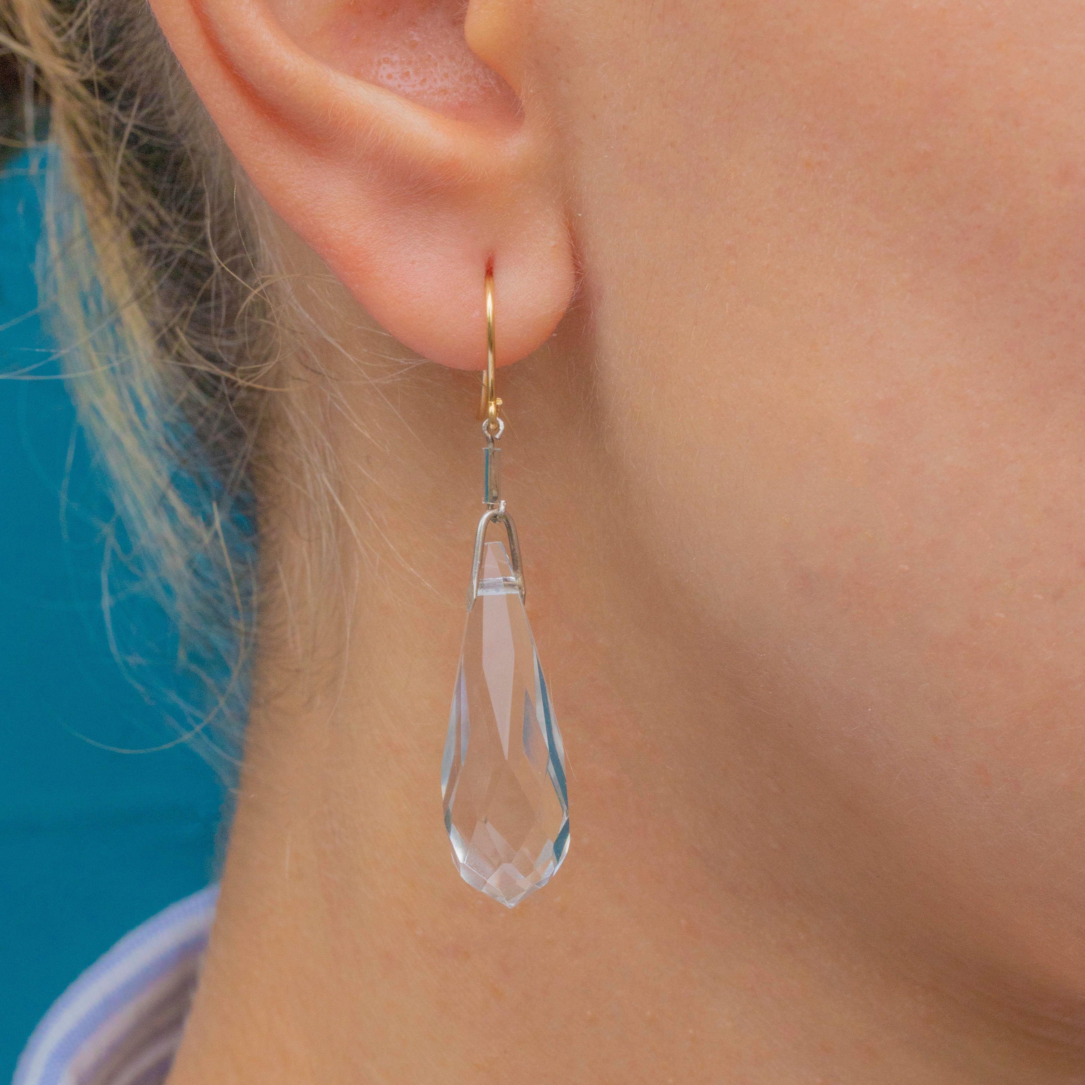 These antique drop earrings each feature a wonderfully faceted transparent Briolette-cut Paste stone which radiates soft rainbow hues as it catches the light.