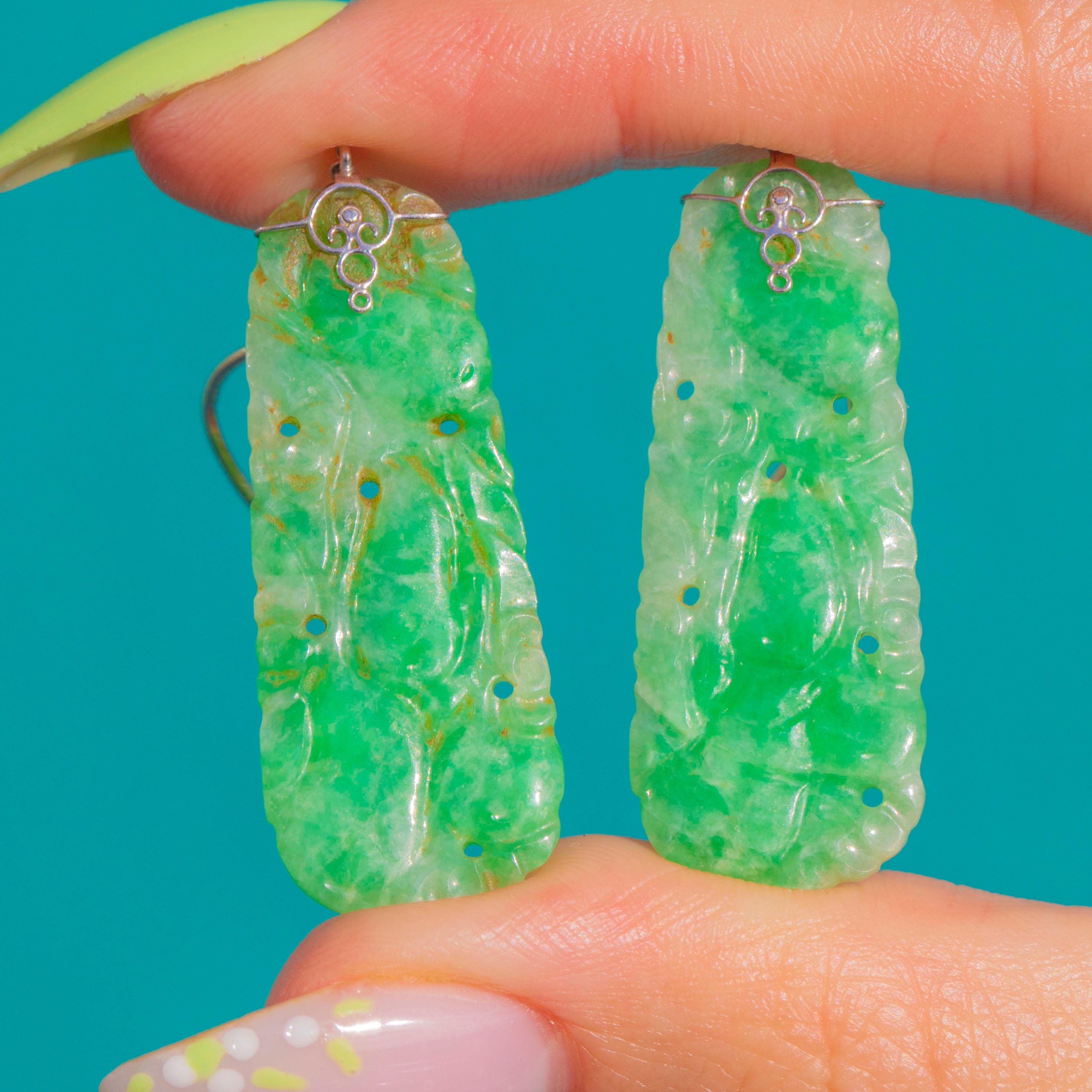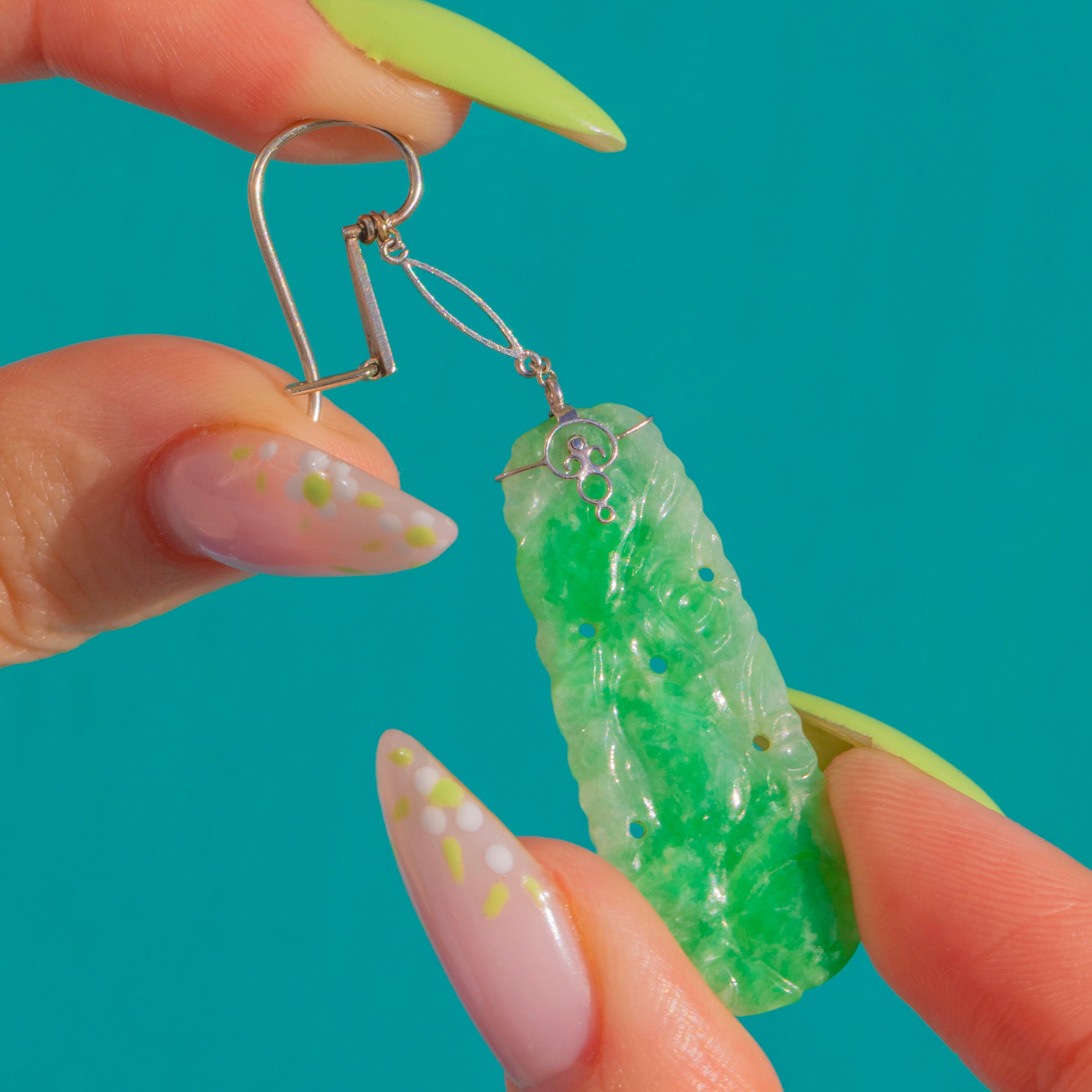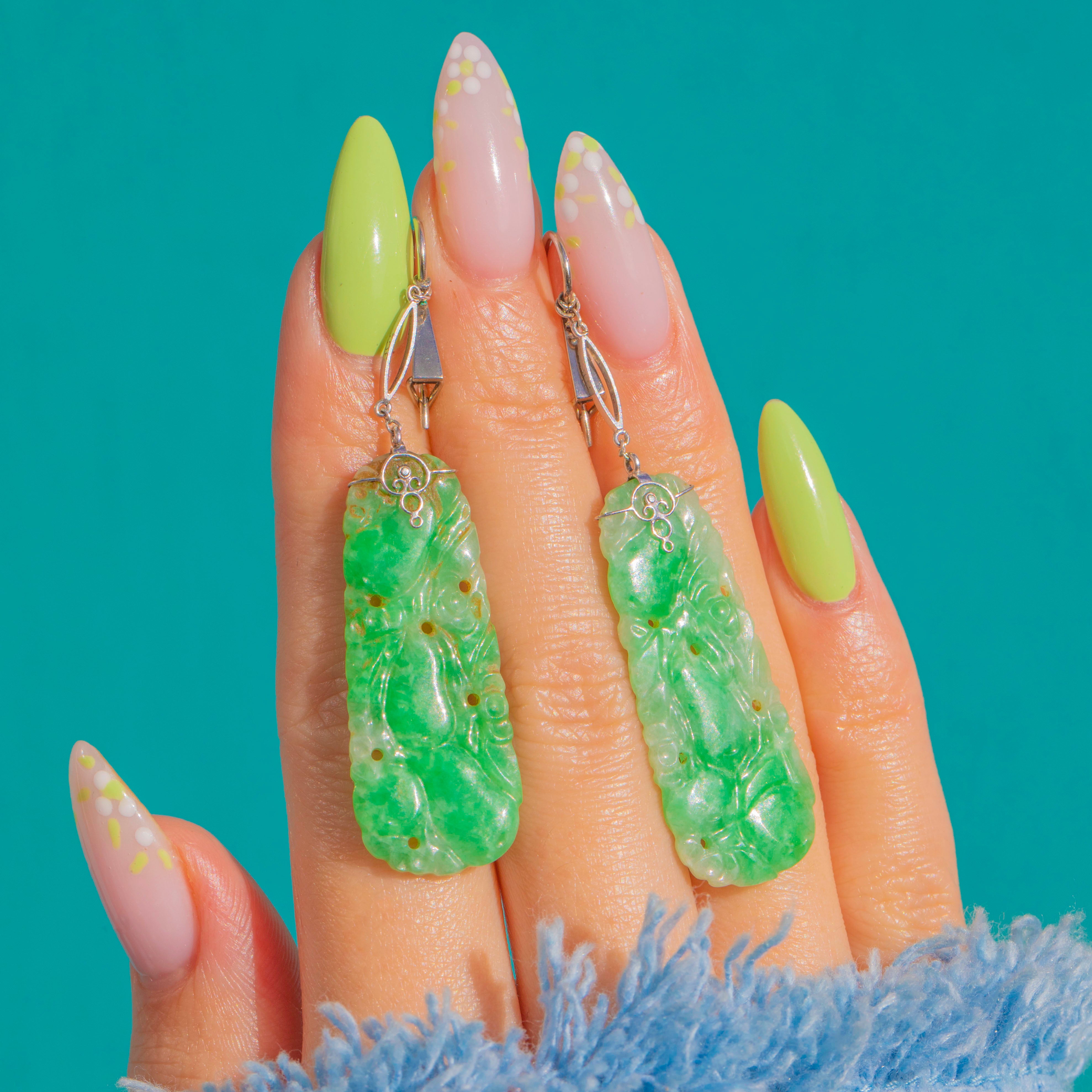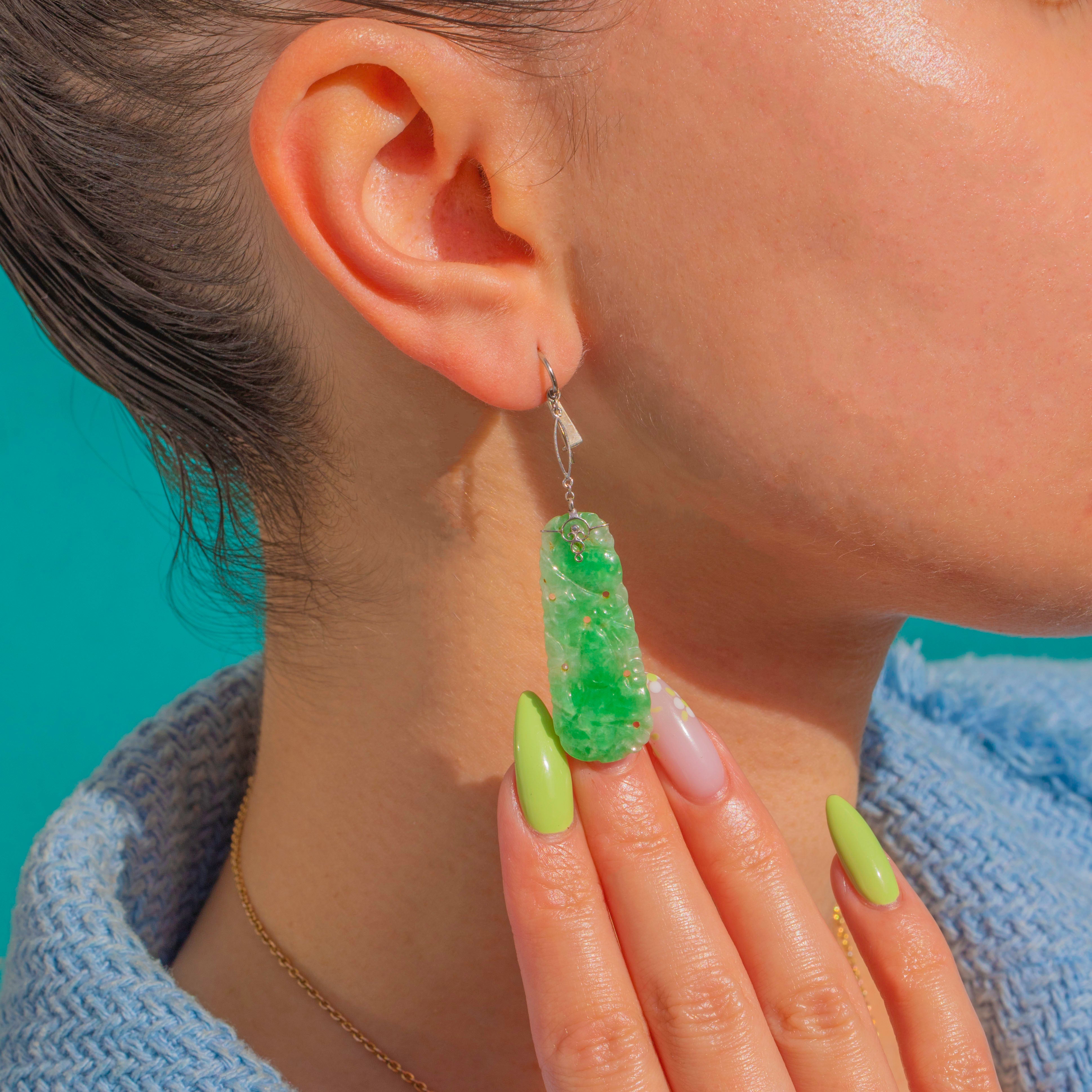 A luminous duet of Carved Jadeite Jade, these Art Deco drop earrings captivate with their fresh green translucency and romantic foliate scrolls carved in low relief. The elegant plaques glow from within, their natural clouds and nuances lending depth and a serene, glassy allure. Suspended from refined 9ct White Gold fittings, they sway with poised movement and make a beautifully sculptural statement.
