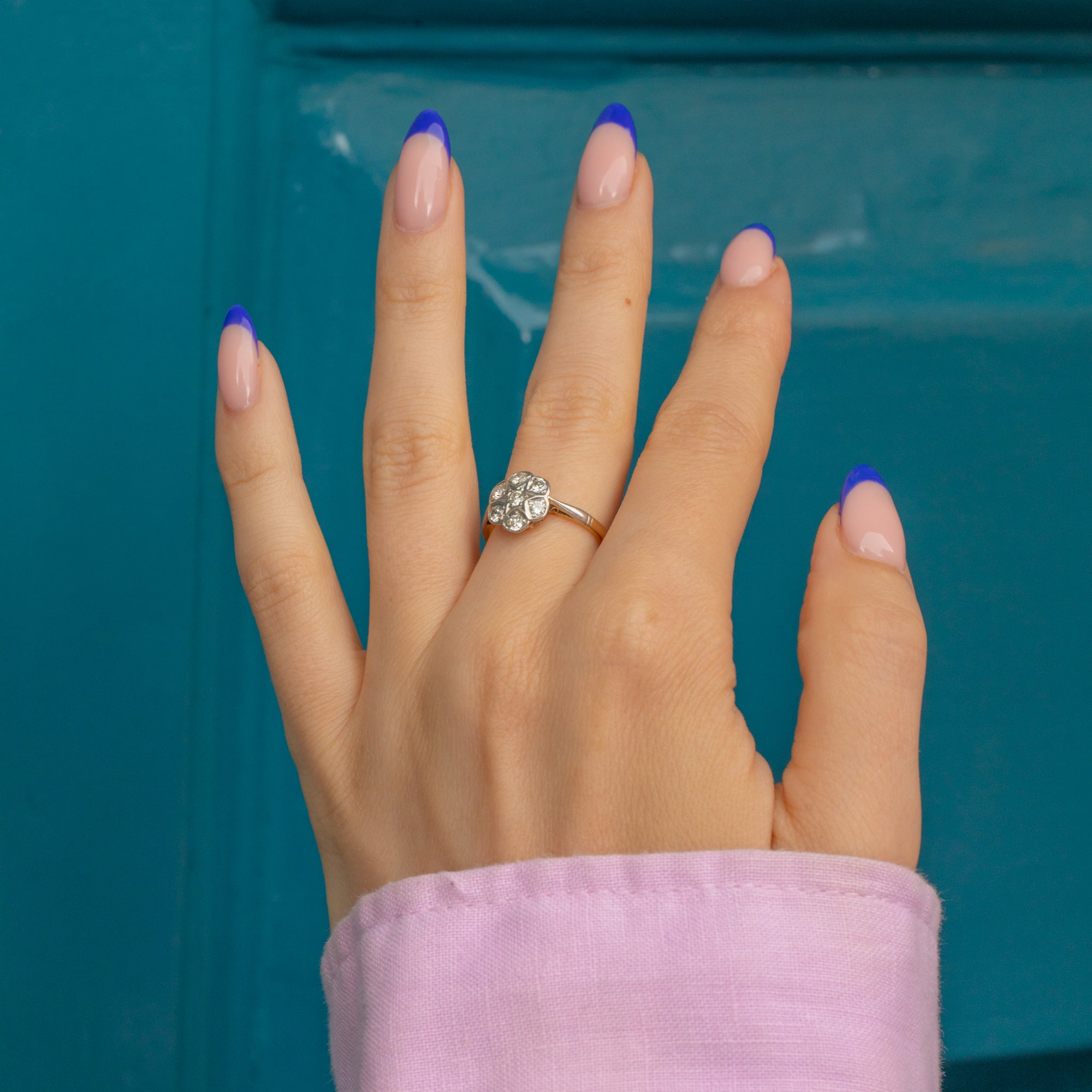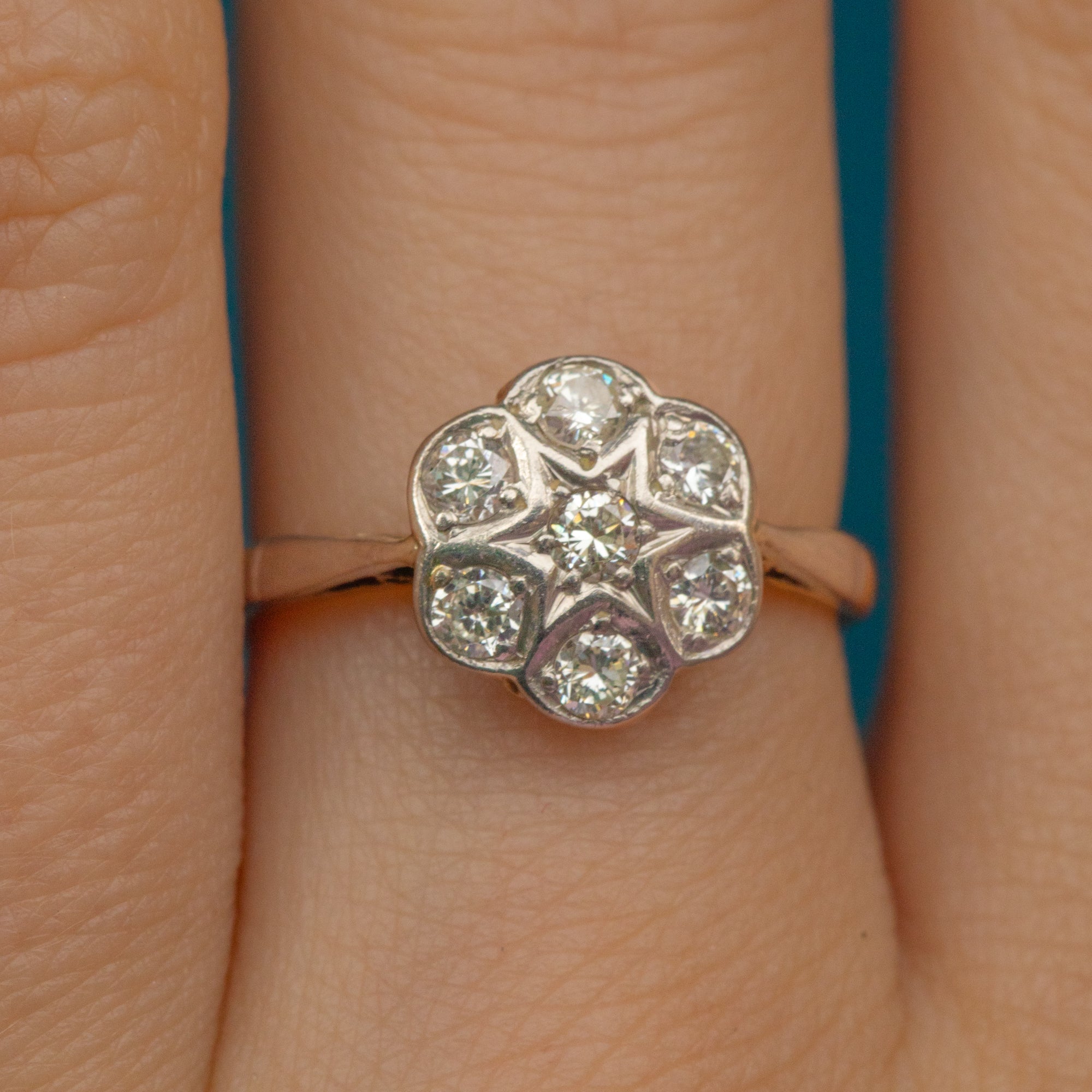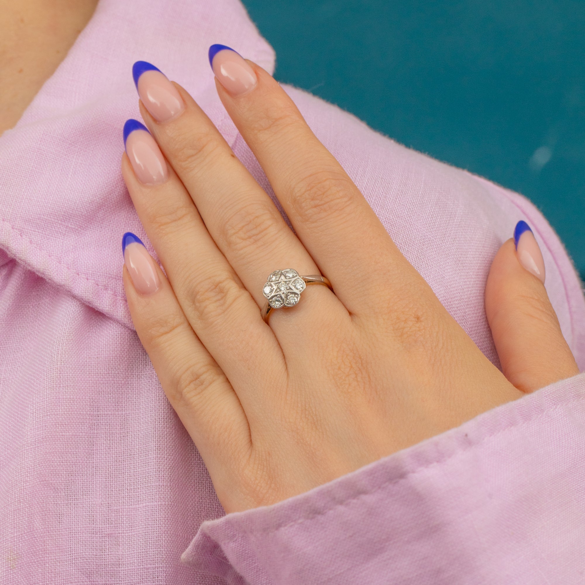 This 18ct Gold Art Deco Diamond daisy cluster ring is feminine and timeless. A pretty Diamond ring like this would be the perfect choice for a unique engagement ring, taking on a form of which you could never tire- a beautiful flower whose bloom will be everlasting!