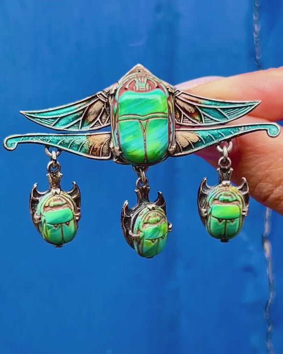 This Art Deco piece suspends three additional scarab beetles, dancing with movement as they rest beneath the brooch. Complete with large teal Enamel wings, crafted with ornate details for added texture and depth, this Art Deco Egyptian brooch is sure to radiate antique allure as it adorns your attire.