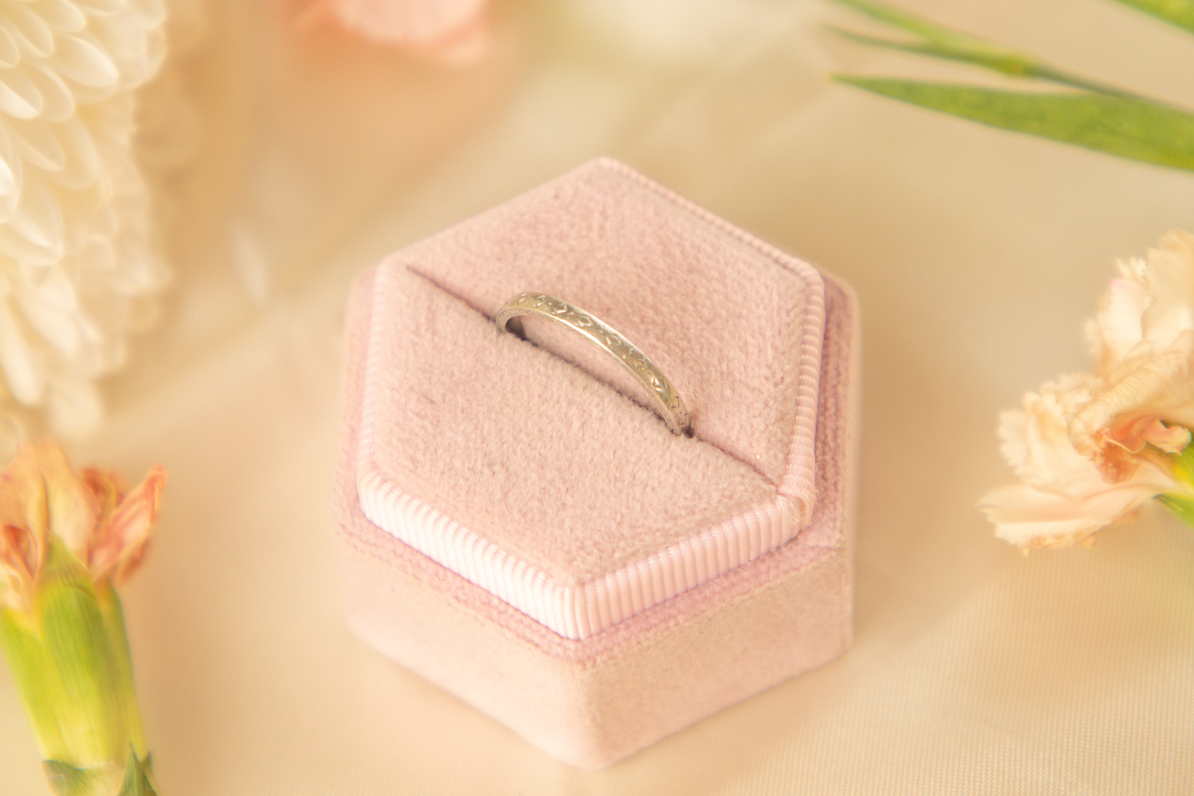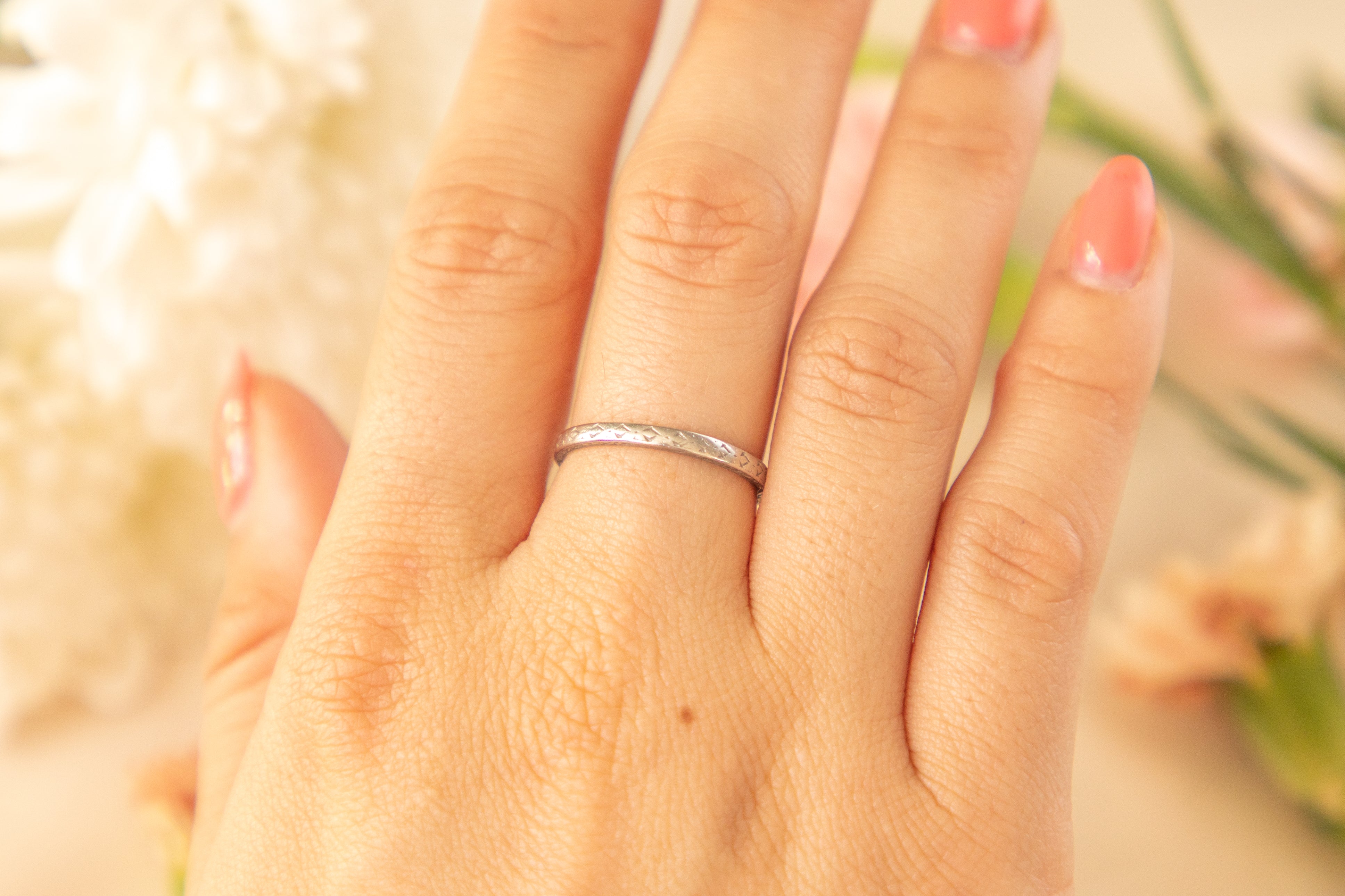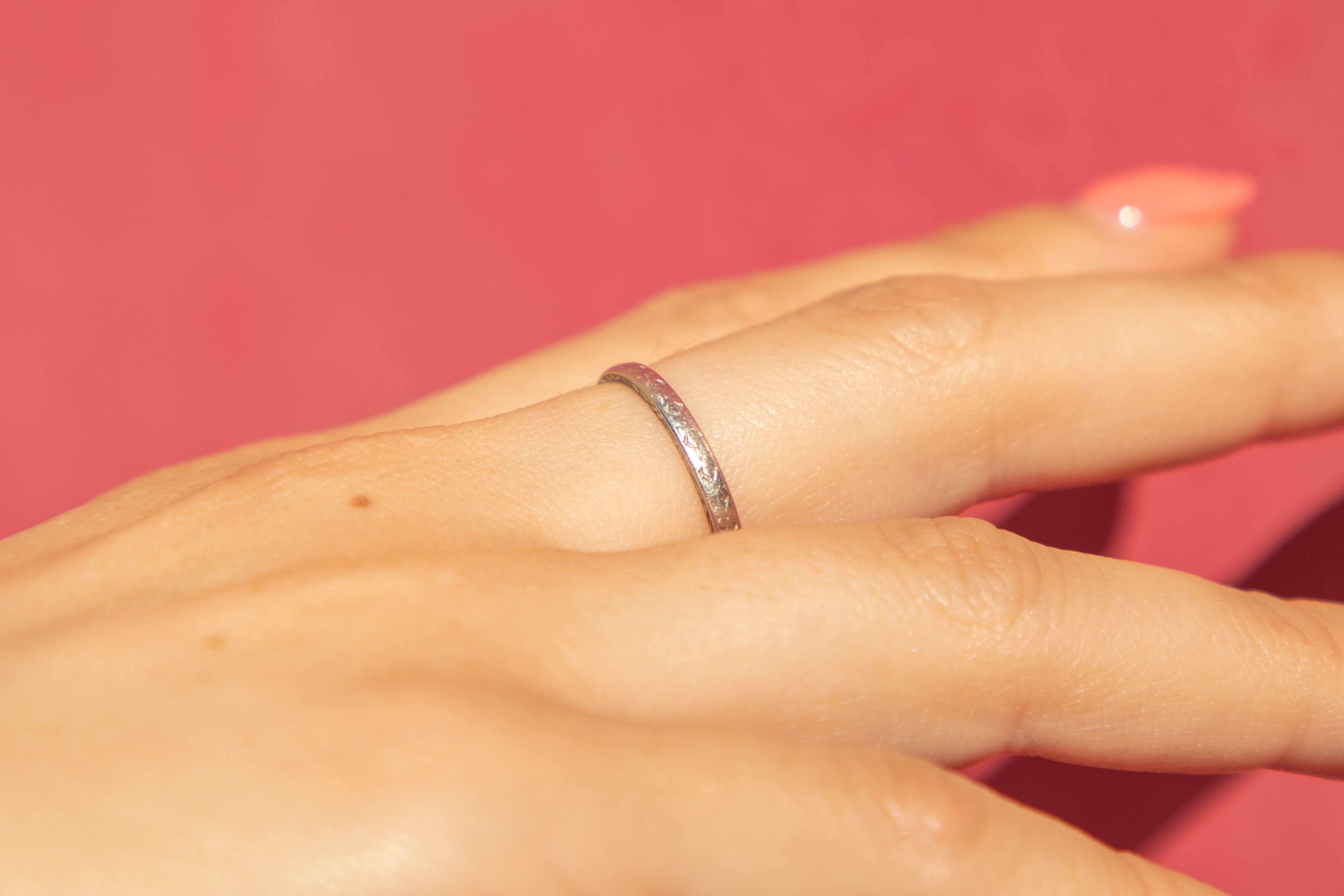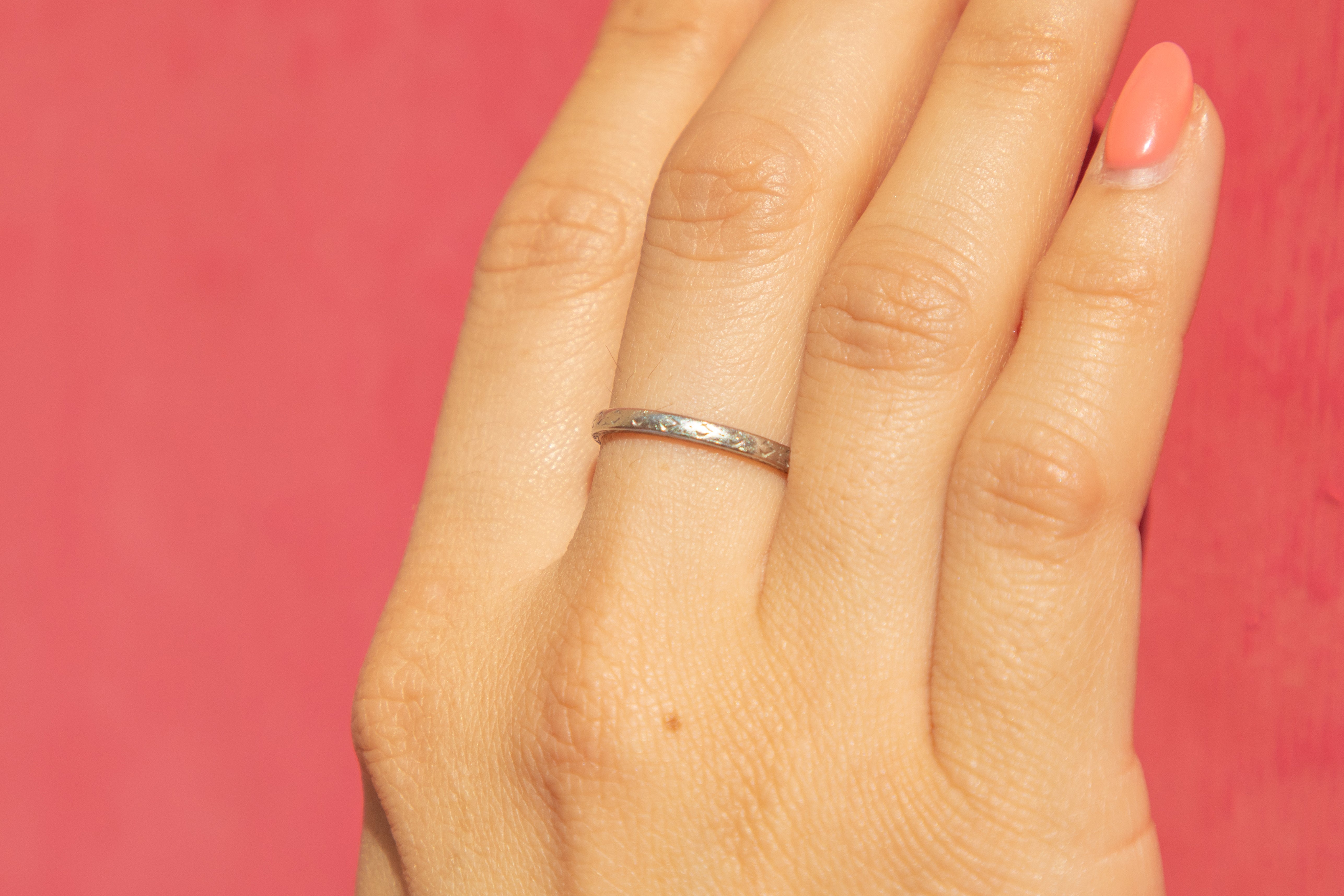 VERY GOOD. An Art Deco engraved Platinum wedding band in very good condition. Her ring band has retained its smooth round shape with her engravings covering the whole way round. Although the engravings are slightly worn in some areas, this is an indication of how loved she was in her previous life. A gorgeous design, we can't wait for her to become your new everyday pick!