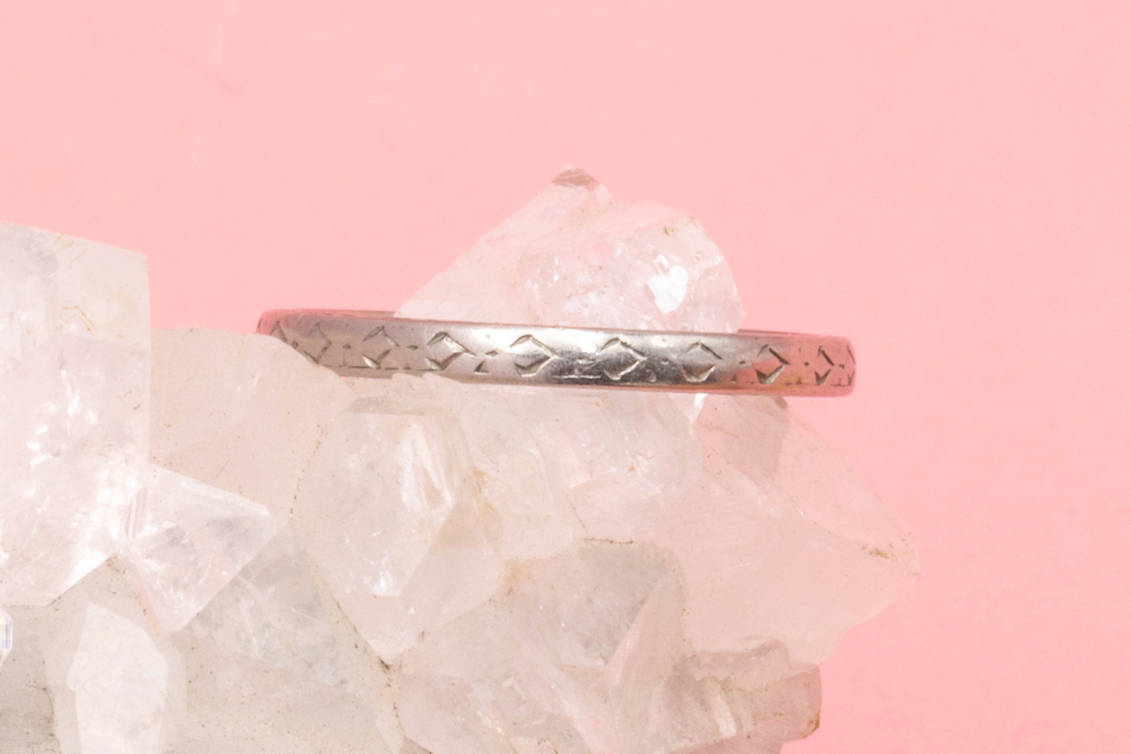 A stunning stable ring, this Art Deco engraved Platinum wedding band will become your go-to piece! She has geometric diamond engravings flowing around the circumference of her bright platinum band.