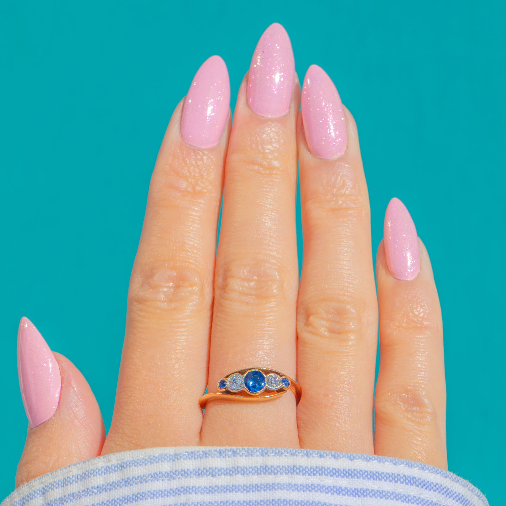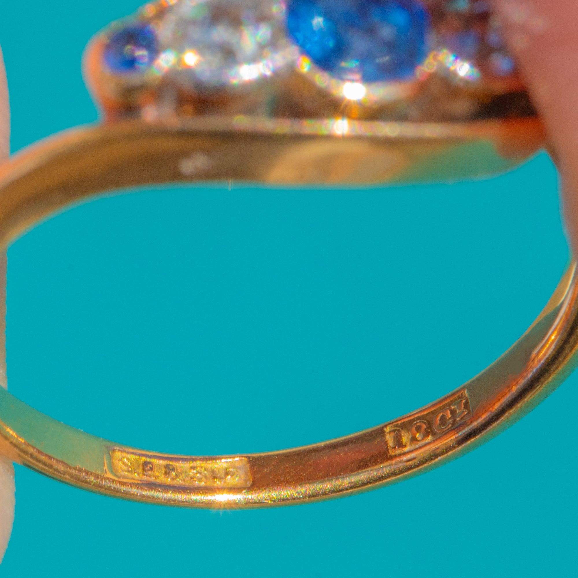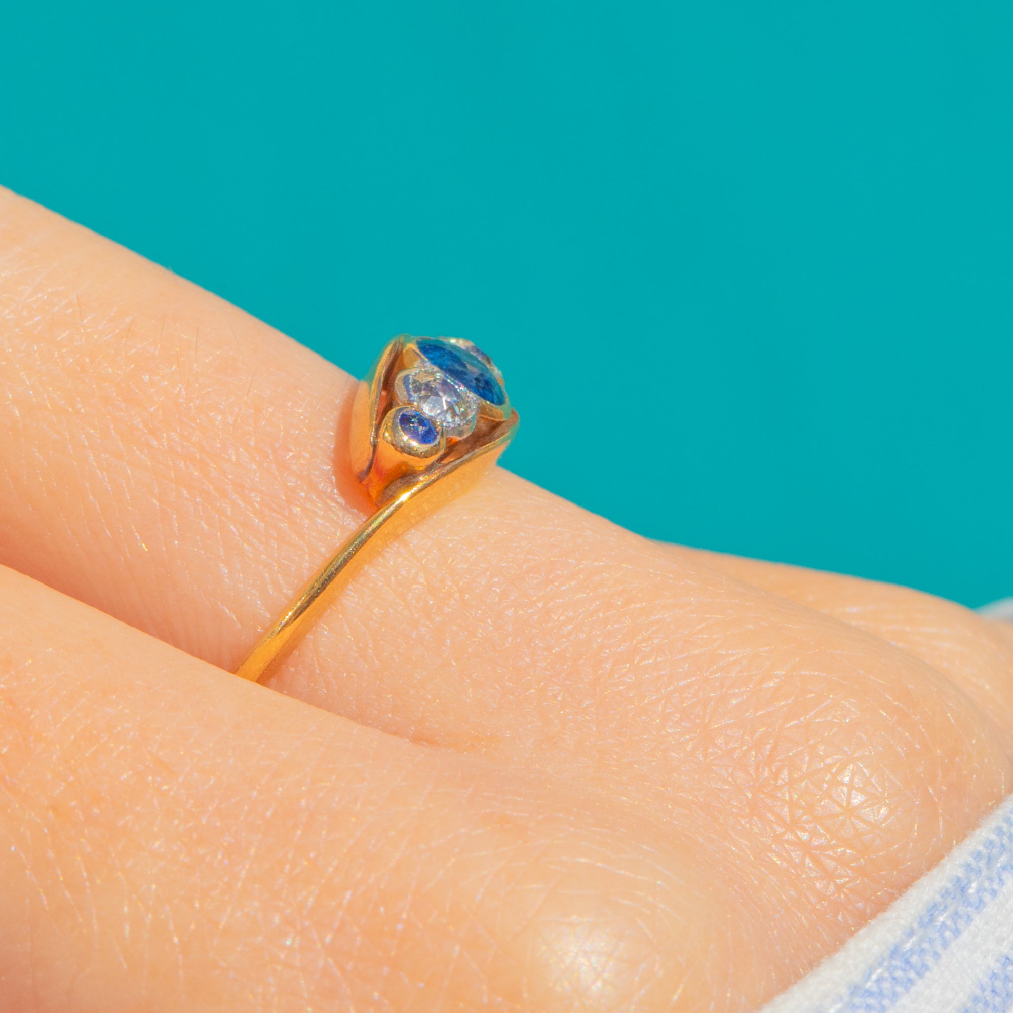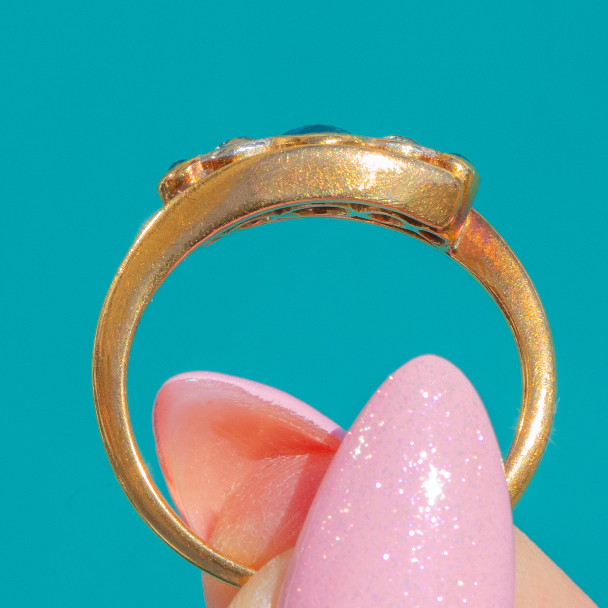 A charming Art Deco five-stone twist ring, set in rich 18ct Gold with a deep blue Sapphire at its heart. The central Sapphire is flanked by two sparkling Diamonds and finished with petite Sapphire accents, creating a graceful, tapered line with a subtle twist that sits low and elegant on the finger.