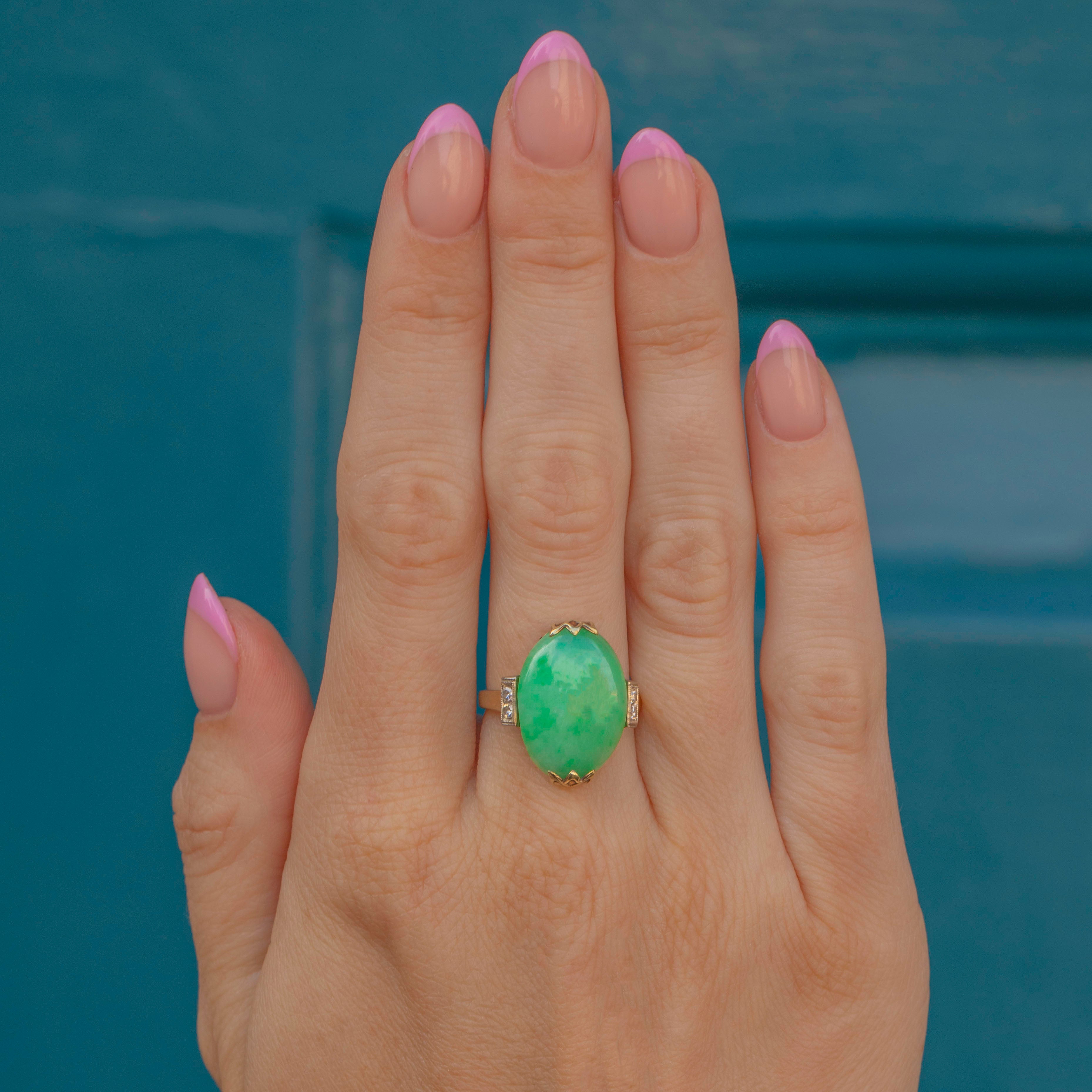 EXCELLENT. This Art Deco Jade cabochon Diamond cocktail ring is in excellent condition. The Jade is smooth, plump and secure and the Gold has a bright finish. The Diamonds act as wonderful accent gemstones and the whole piece comes together beautifully! She's a dream to wear.