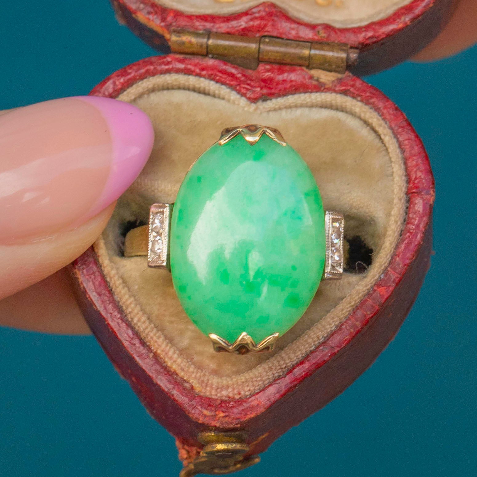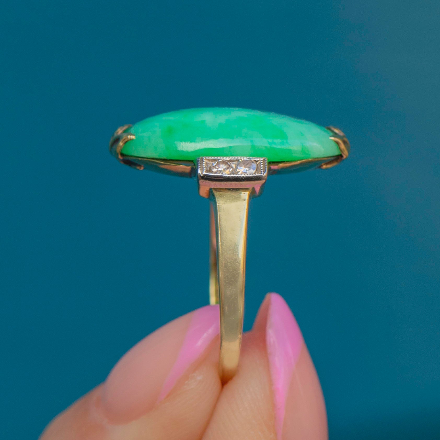 We think this Art Deco Jade cabochon Diamond cocktail ring is a gorgeous piece. The Jade has that classic fresh and minty green tone, with a wonderful mottled effect filled with fern hues, as well as two sparkly Diamond accents on either side!