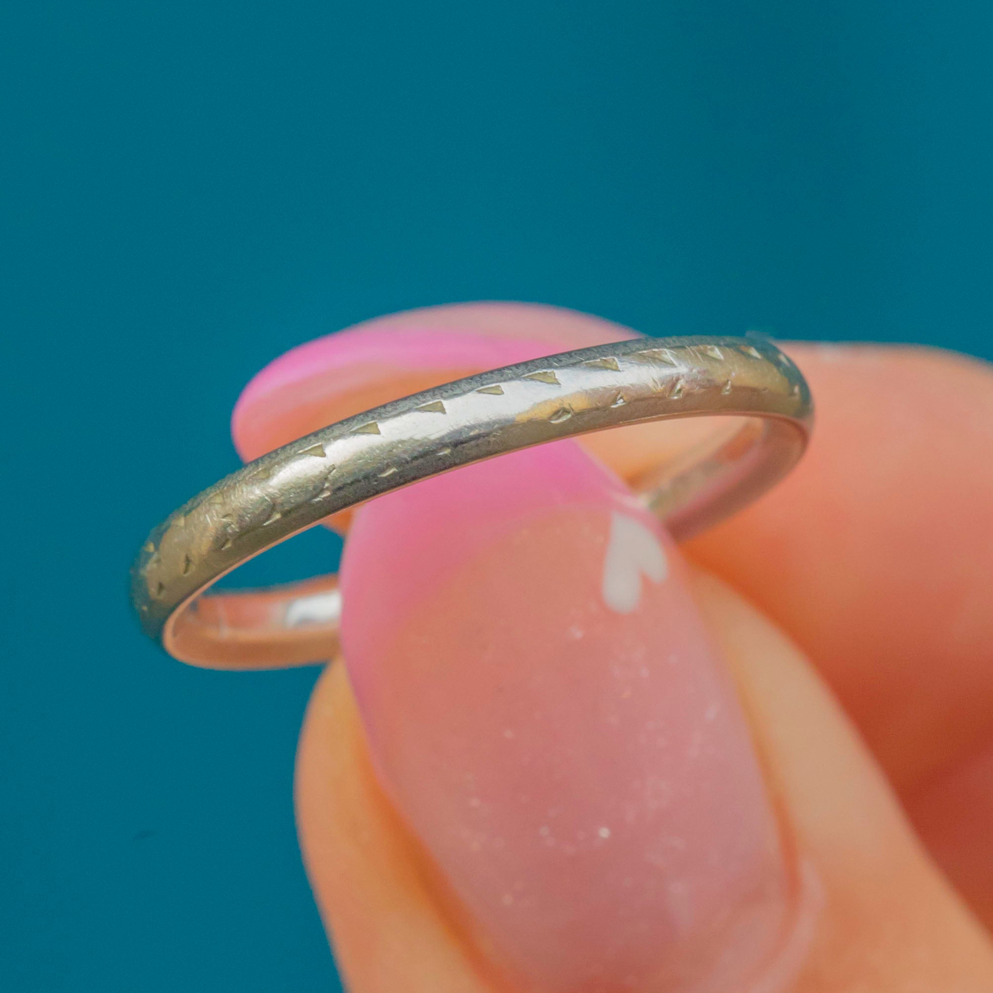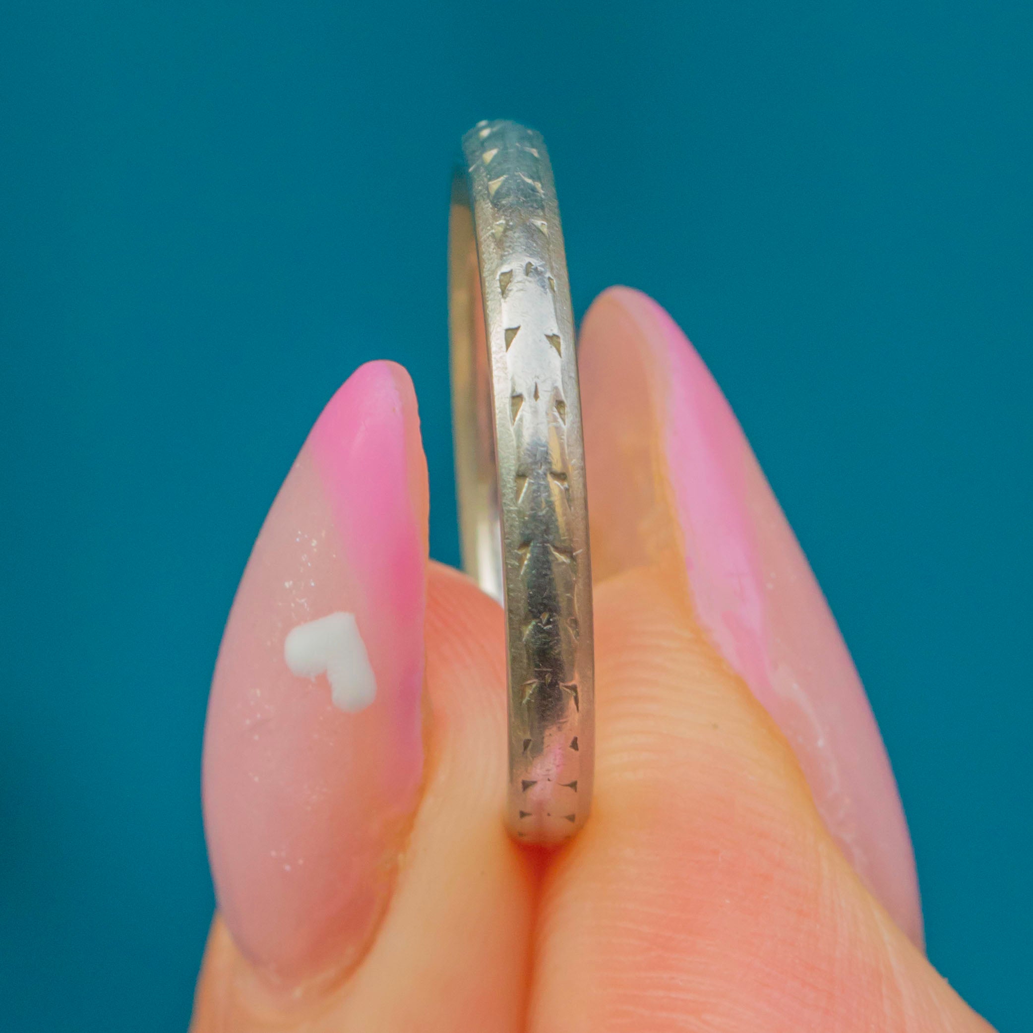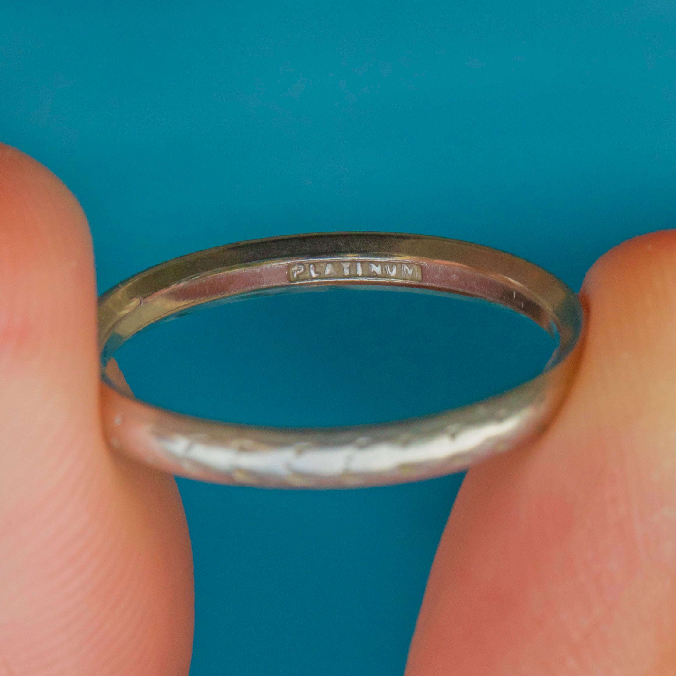 VERY GOOD: This divine Art Deco Platinum engraved wedding band is in very good condition! Although there is evidence of a previous resizing, the ring has kept its circular shape very well throughout the years, with no chips or dings to note. Her engravings have some subtle wear, but nothing we wouldn't expect of a piece of her age! Crafted out of sturdy Platinum, you can rest assured that she will last for a lifetime to come.