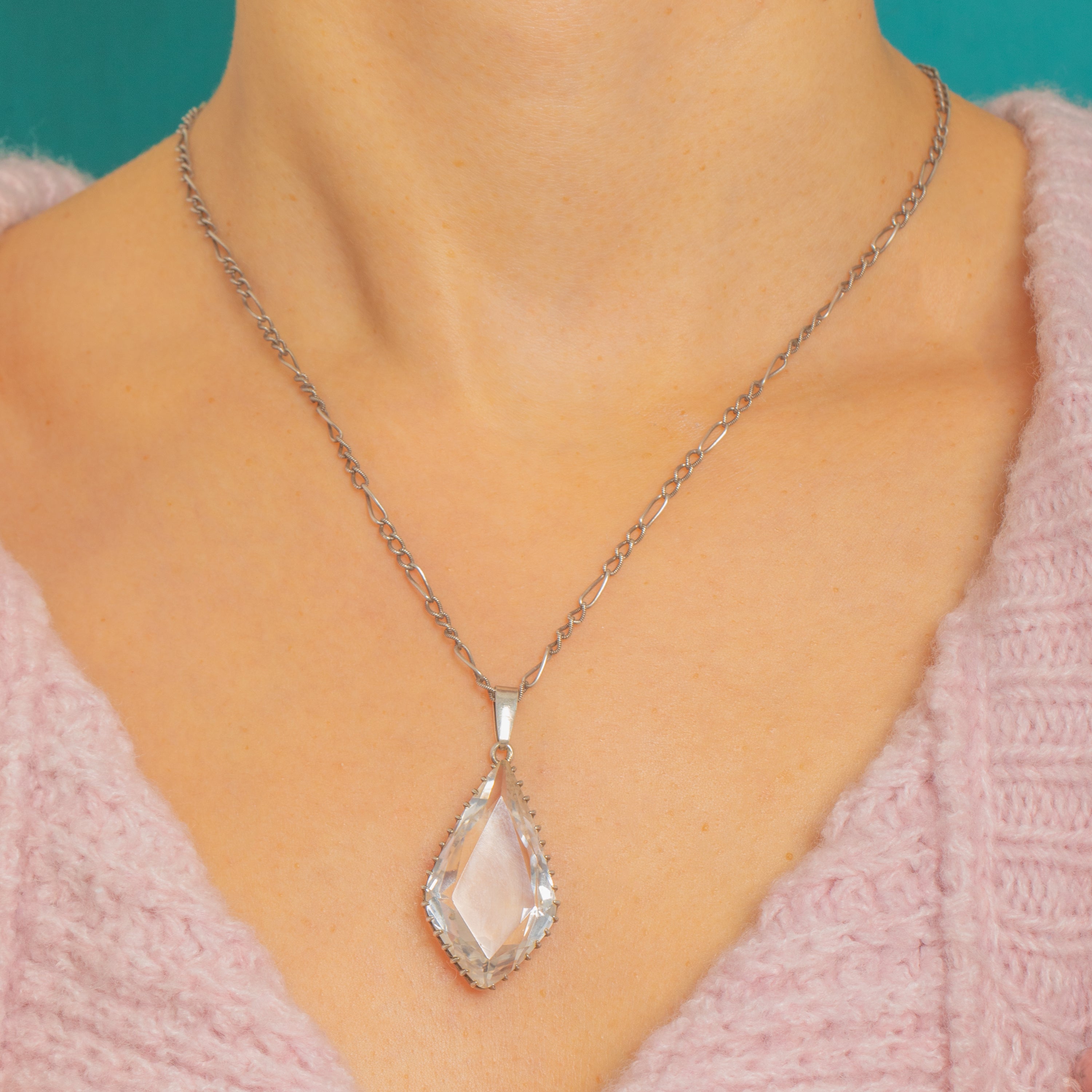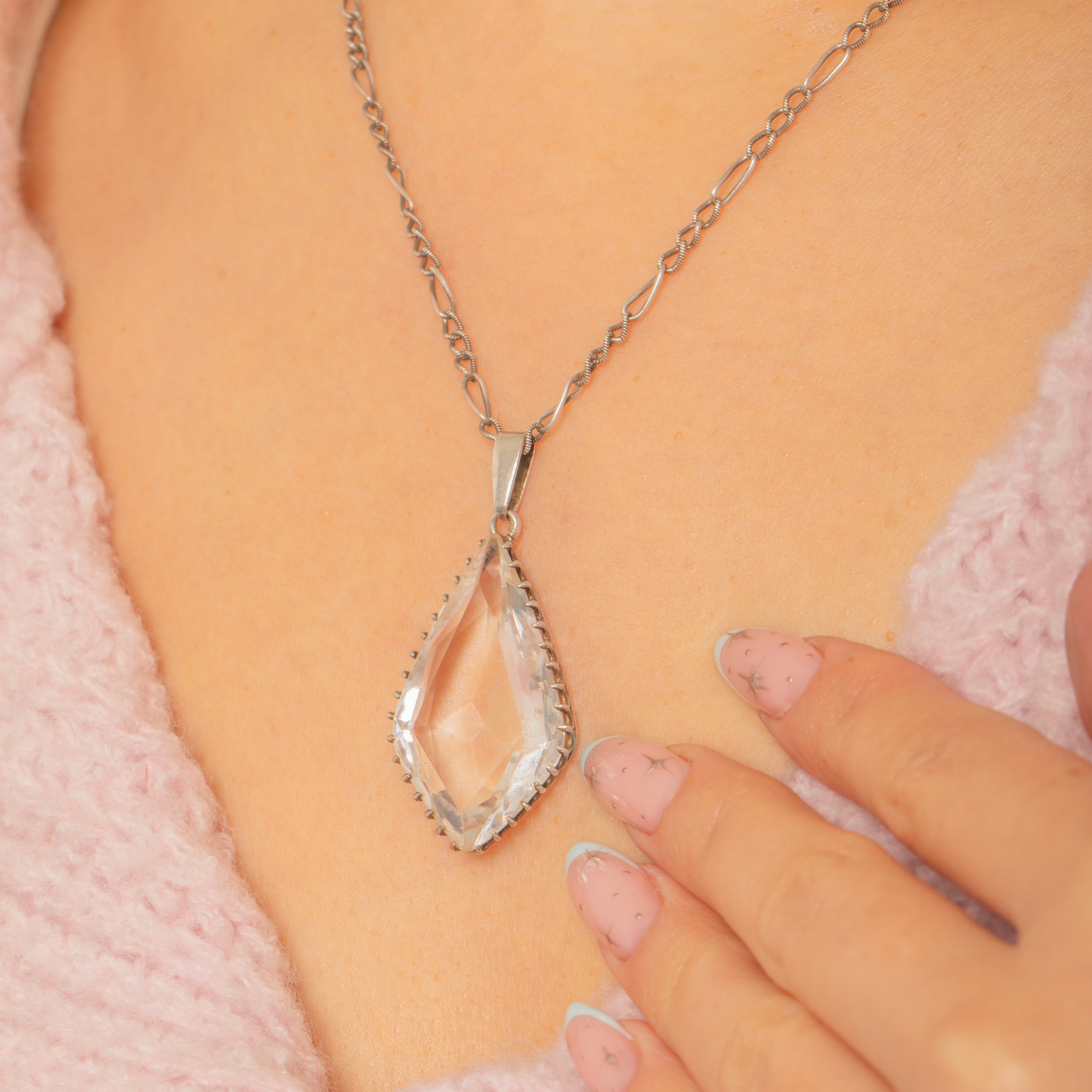 A luminous Art Deco Rock Crystal pendant with striking, architectural poise. The large lozenge-cut Crystal is cradled in stylistic claws of Sterling Silver, its scalloped edge framing the stone and inviting light through the open back for a bright, icy sparkle. A tapered bail gives a graceful finish to the clean, geometric silhouette.